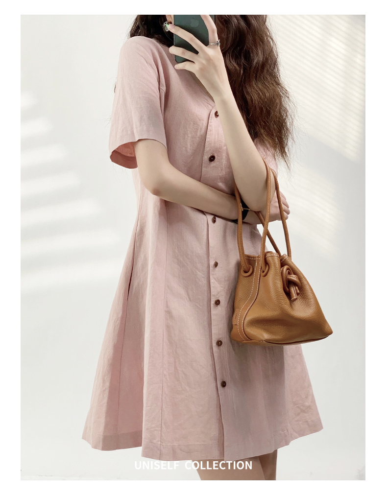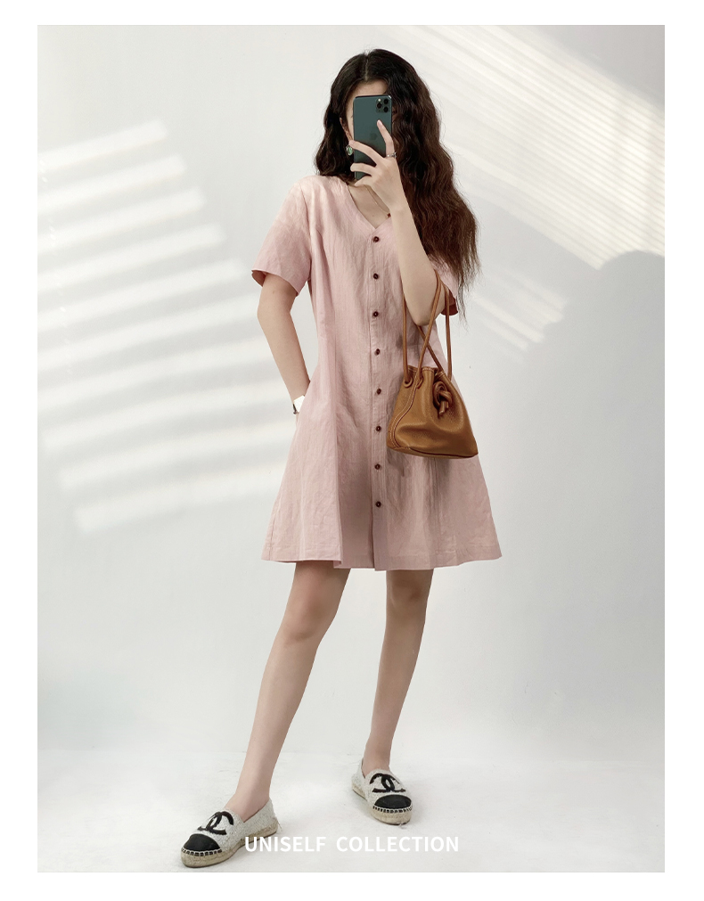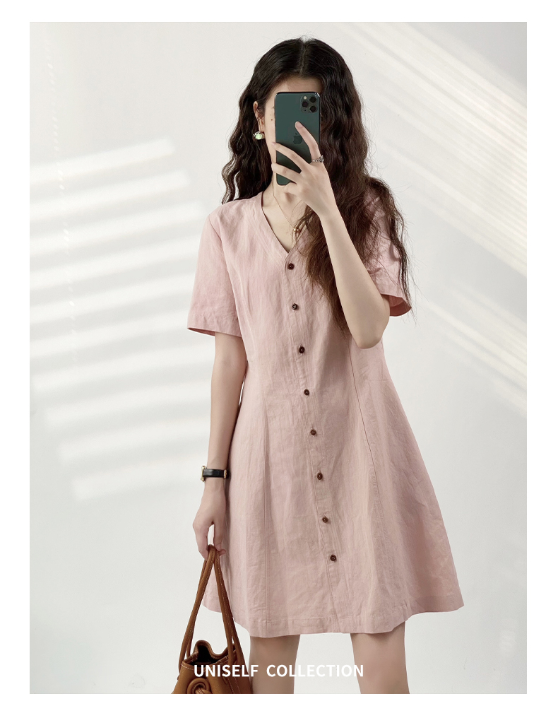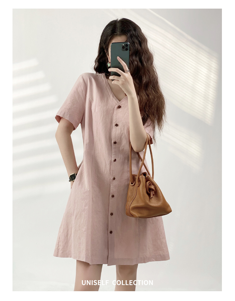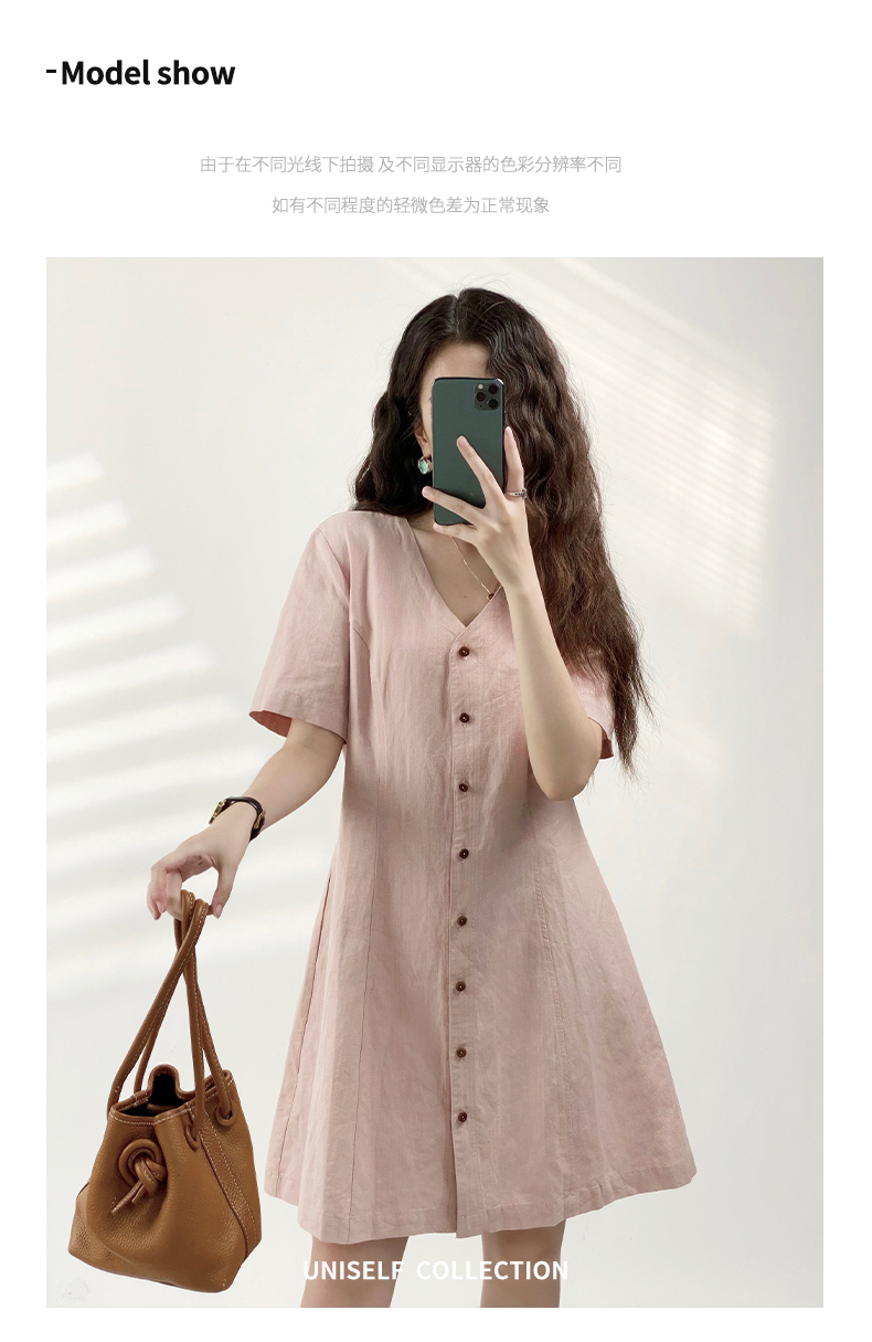 YX【现货7天】法式通勤气质亚麻连衣裙女2023夏季新款设计感单排扣短袖a字裙