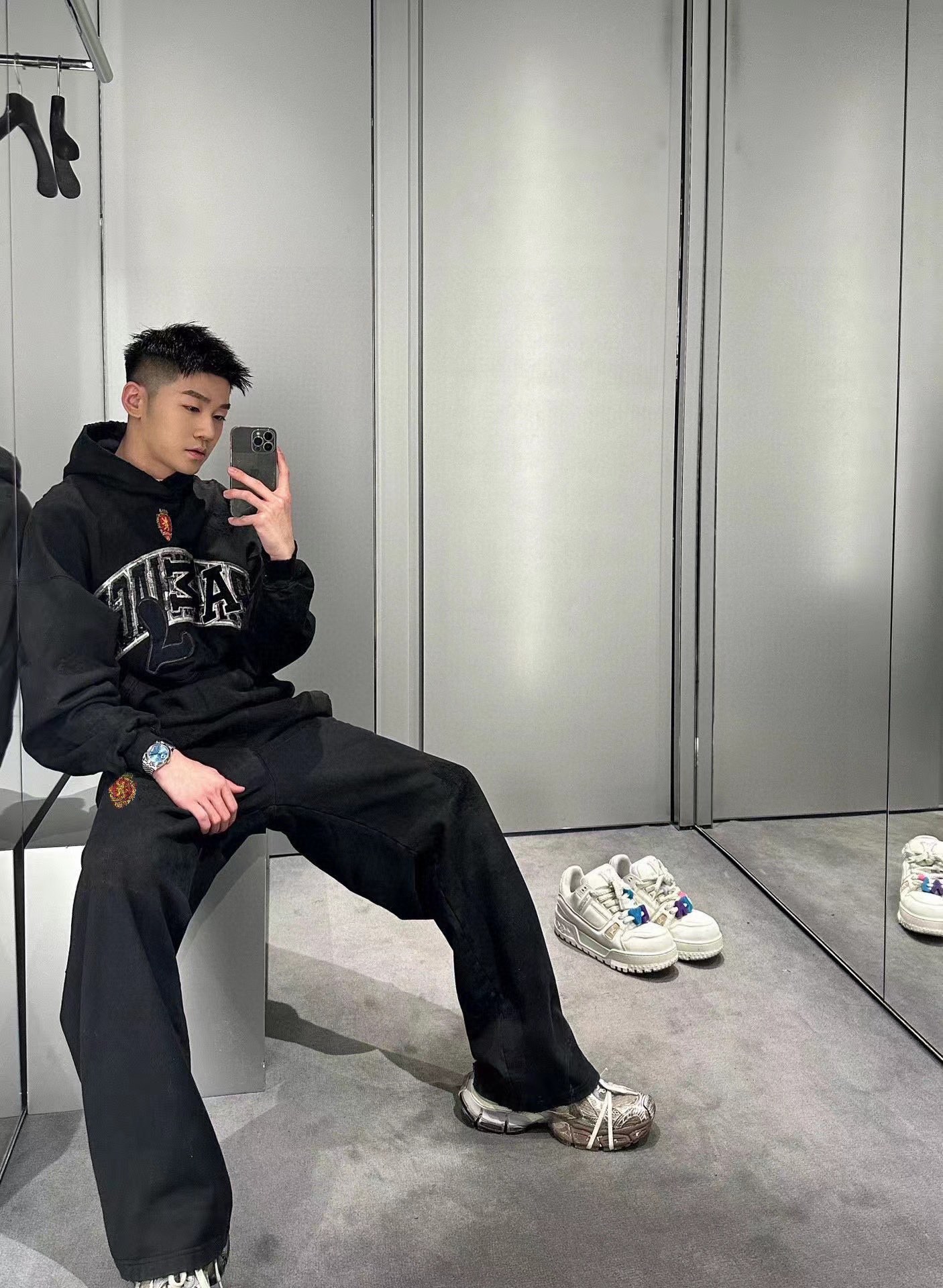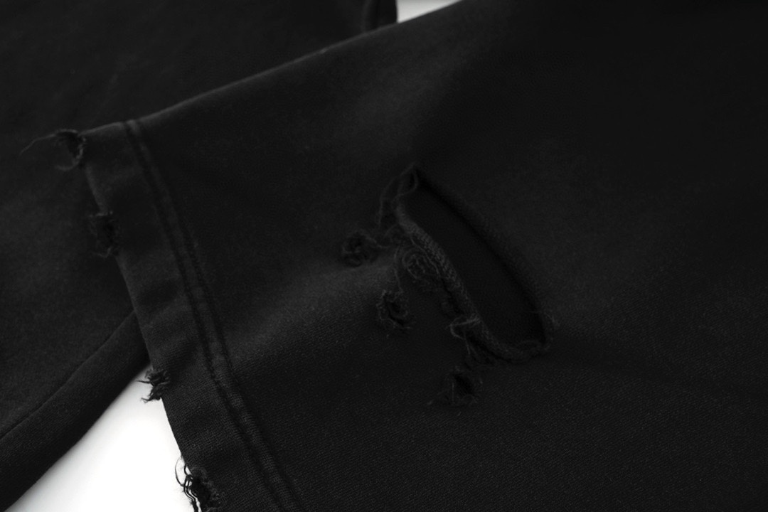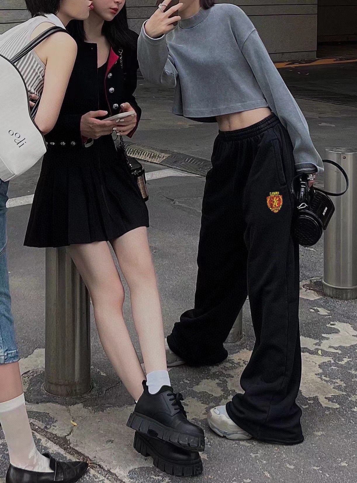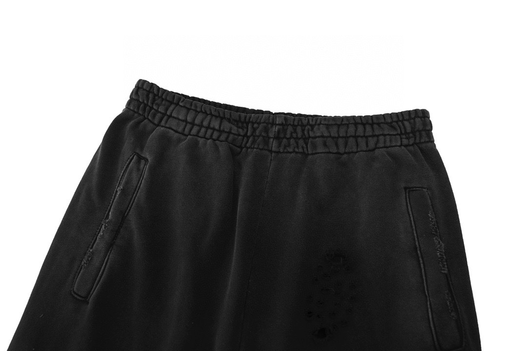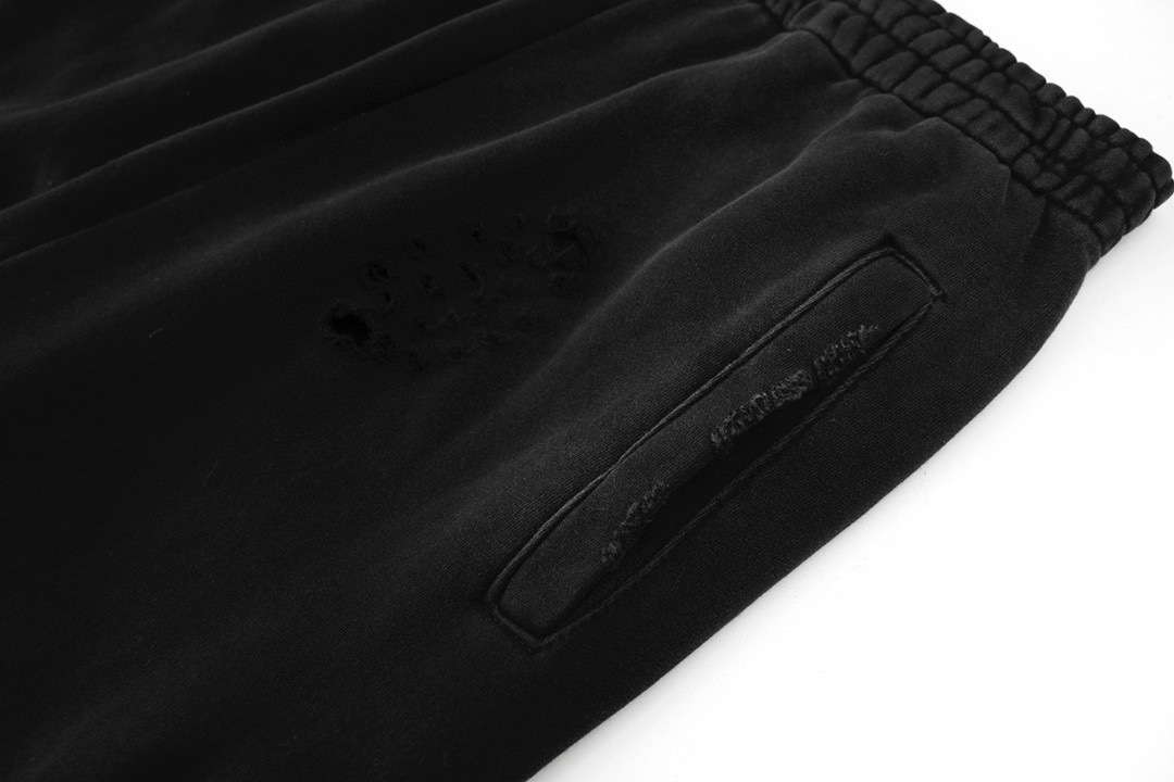 #中重卷绒 常规中腰剪裁 松紧裤腰 直筒裤脚 正面两侧插袋 重度破损和脏污效果 毛巾刺绣图案设计 取材用双面拉绒棉布 棉布经过拉绒后表面呈现丰润绒毛状的棉织物 跟原版用的纯棉材料一致质感 裤侧小刺绣主体采用精密挨针绣工艺 刺绣非常精细针法绵密 图案清晰且线条感和立体感强 直筒休闲中腰偏长版型 裤脚堆叠的效果慵懒随意 做旧工艺的处理 环保褪色的斑驳效果 全件定位手工破洞细节 做旧破坏元素处理