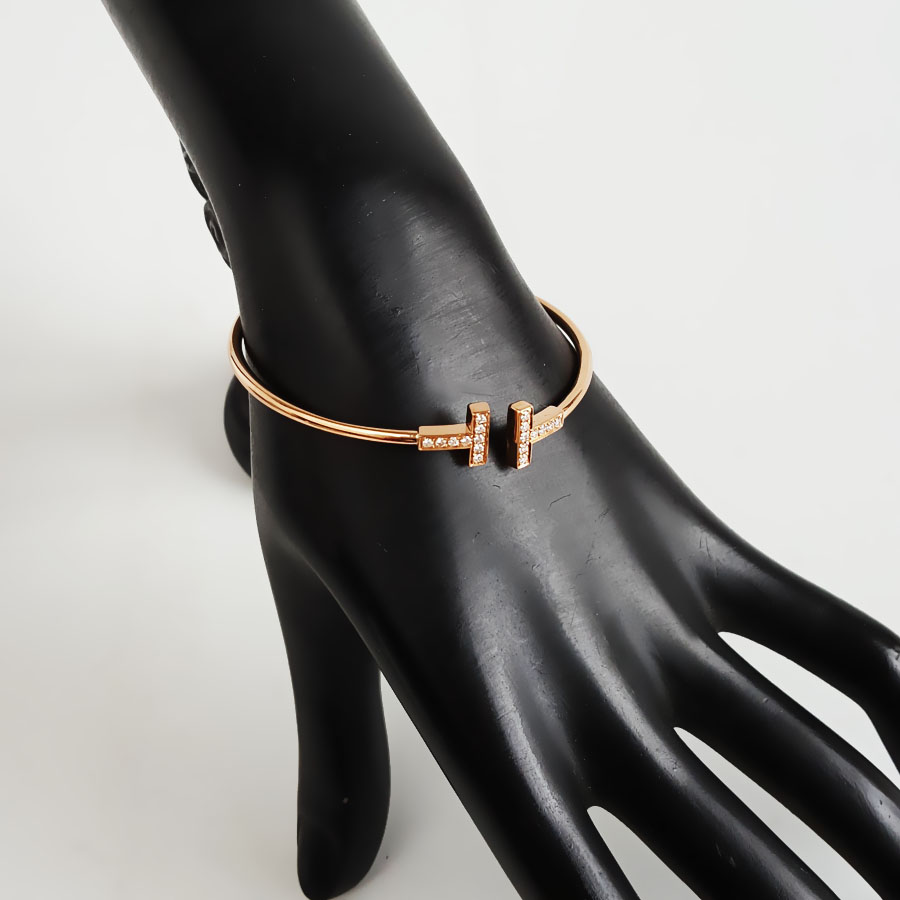 【95新】Tiffany & Co.蒂芙尼Tiffany T 系列玫瑰金镶钻双T开口线圈手镯腕围约16cm女士260126TB45
