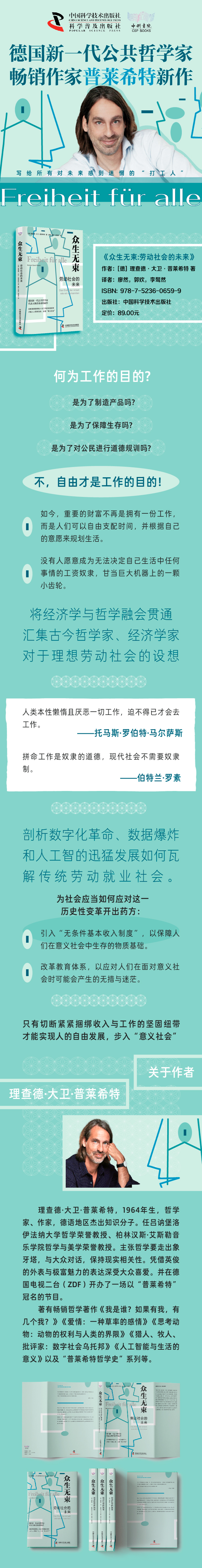 理查德·大卫·普莱希特向我们展示了工作世界的变革将如何改变我们对生活、文化、教育的理解,并最终对整个社会产生深远的影响。同时他也指出,决策者将面临何种艰巨的、旨在重塑社会的任务。其中尤为关键的是,将现有的有偿劳动社会体系重塑为无条件基本收入社会