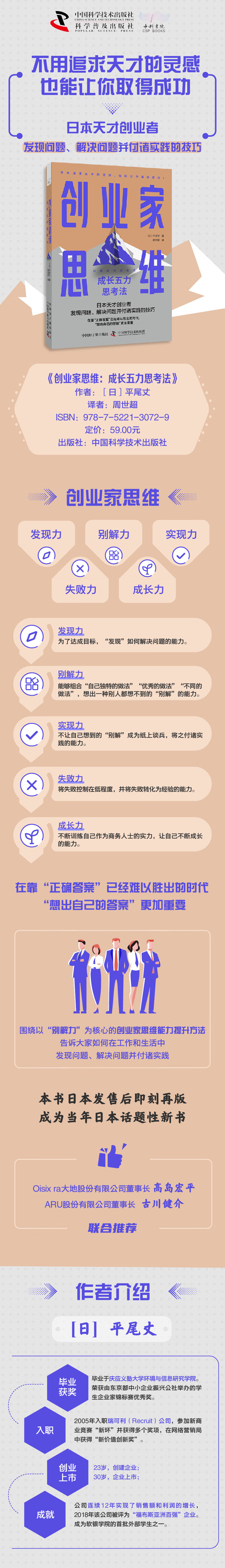 23岁时,创建了次元有限公司的前身企业;30岁时,次元有限公司在东京证券交易所玛札兹市场上市;35岁时,该公司在东京证券交易所一部上市。自创业以来,公司连续12年实现了销售额和利润的增长,2018年该公司被评为“福布斯亚洲百强”企业。作者还被提拔为软银学院的首批外部学生之一,入选为孙正义挑选接班人的项目。