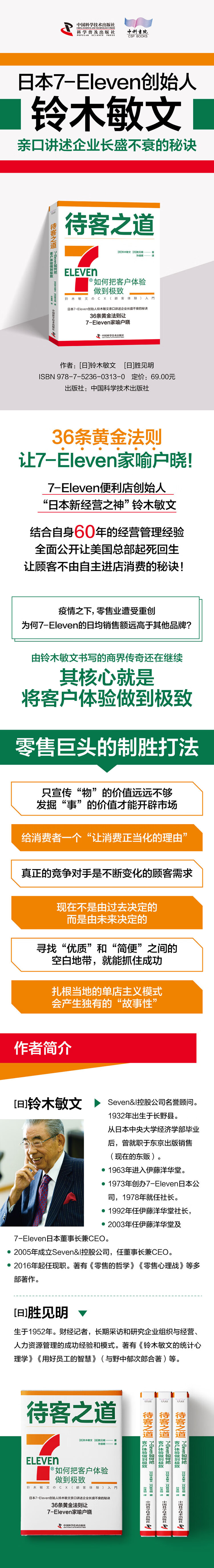1.7-Eleven的便利店模式在全球大获成功,疫情下仍然有非常亮眼的表现。日本7-Eleven的创始人兼CEO铃木敏文结合自身40多年的经营经验,讲述了7-Eleven成功的秘诀——重视客户体验,创造潜在需求。2.作者铃木敏文是日本7-Eleven的创始人兼CEO,他被日本媒体称为继松下幸之助之后的“日本新经营之神”。在书中,他结合7-Eleven不断创新的成功经验,讲述了先进的零售理念,以及和其他各行业一线成功人士的对谈,总结了各行业通用的成功法则。3.如今,零售业面临着严峻的挑战。本书中,铃木结合了近年来疫情给零售环境带来的影响,分析了适用于当下的经营理念,能给在疫情中遭受影响的销售行业从业者提供参考。