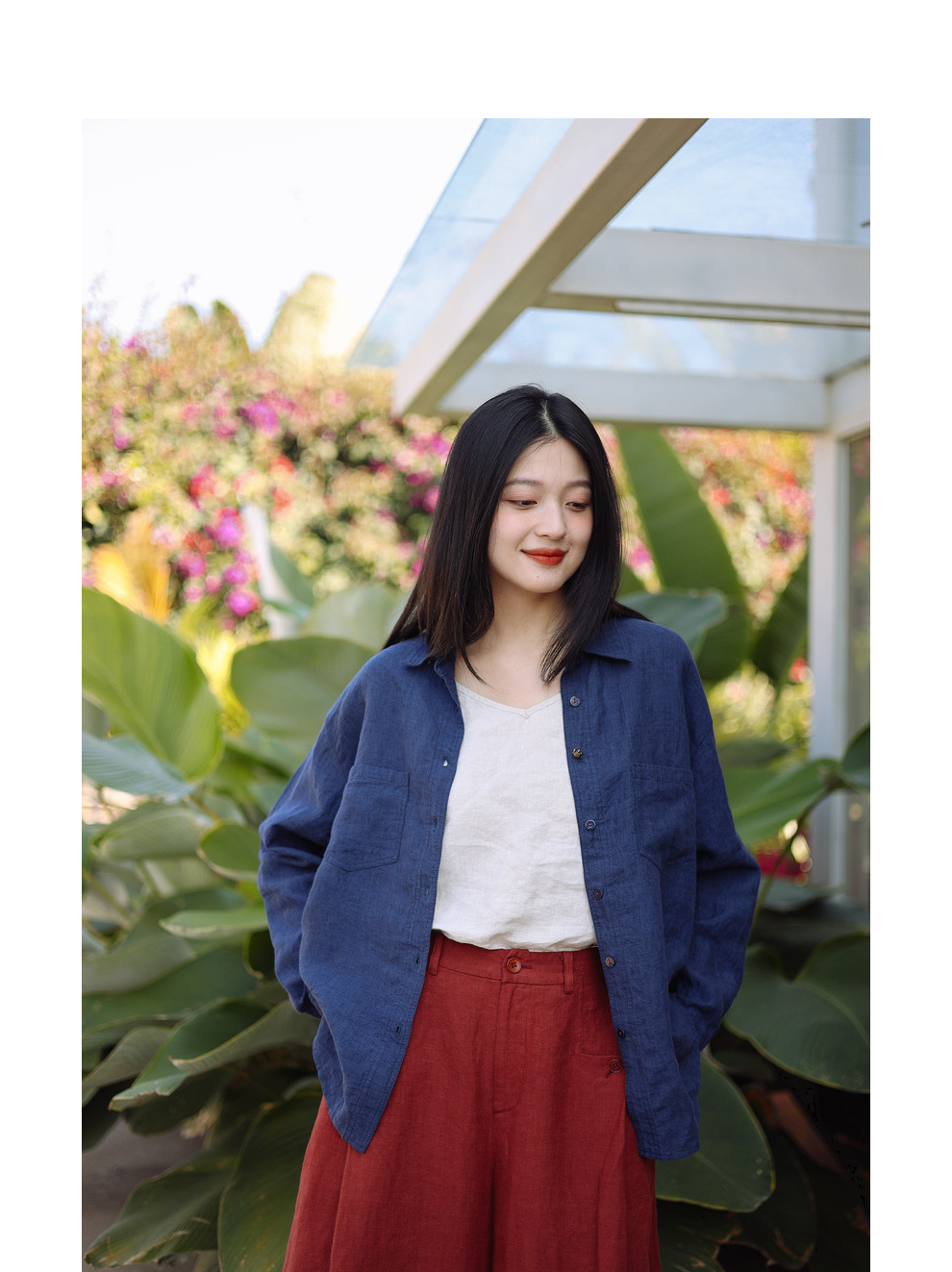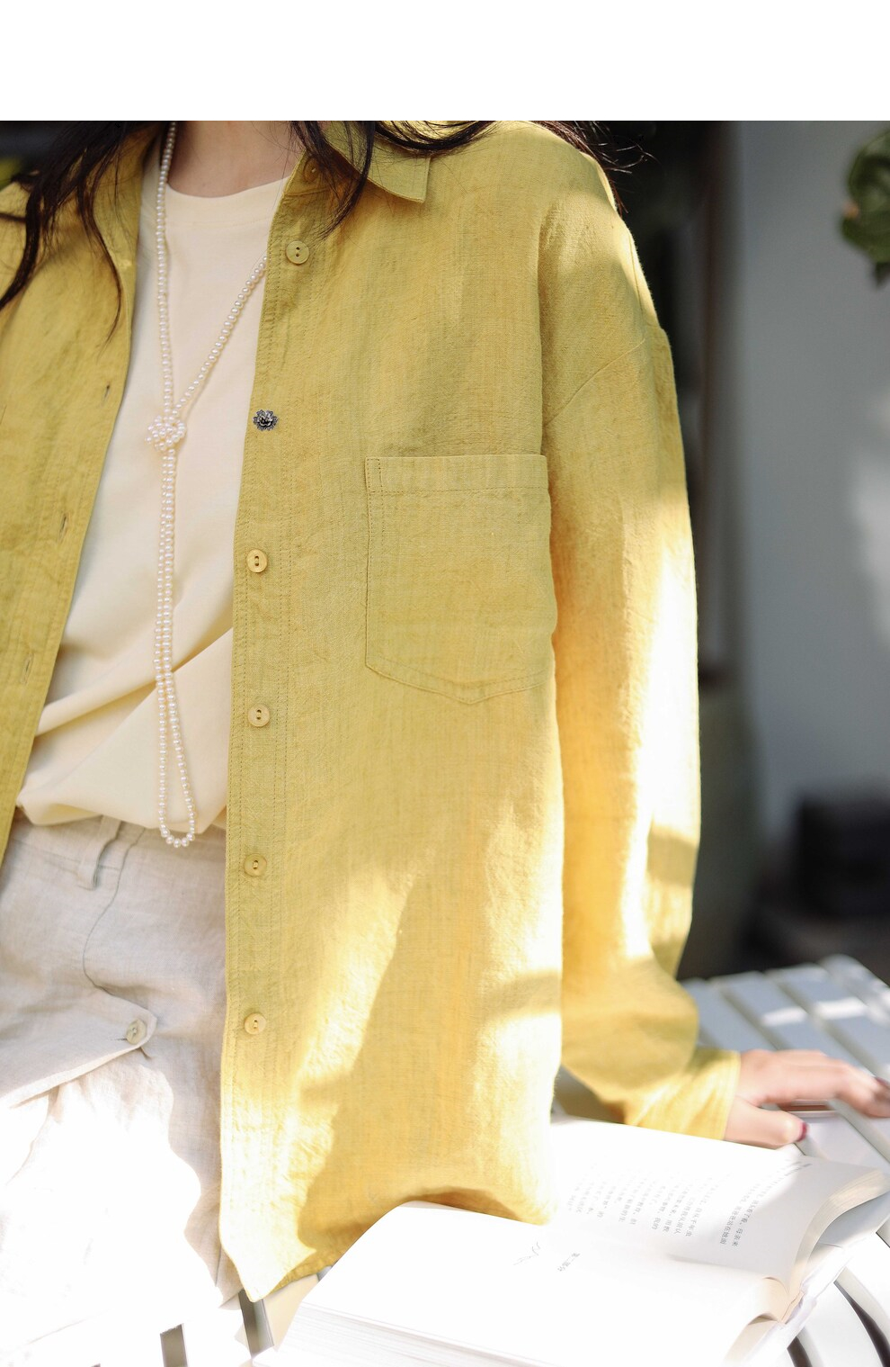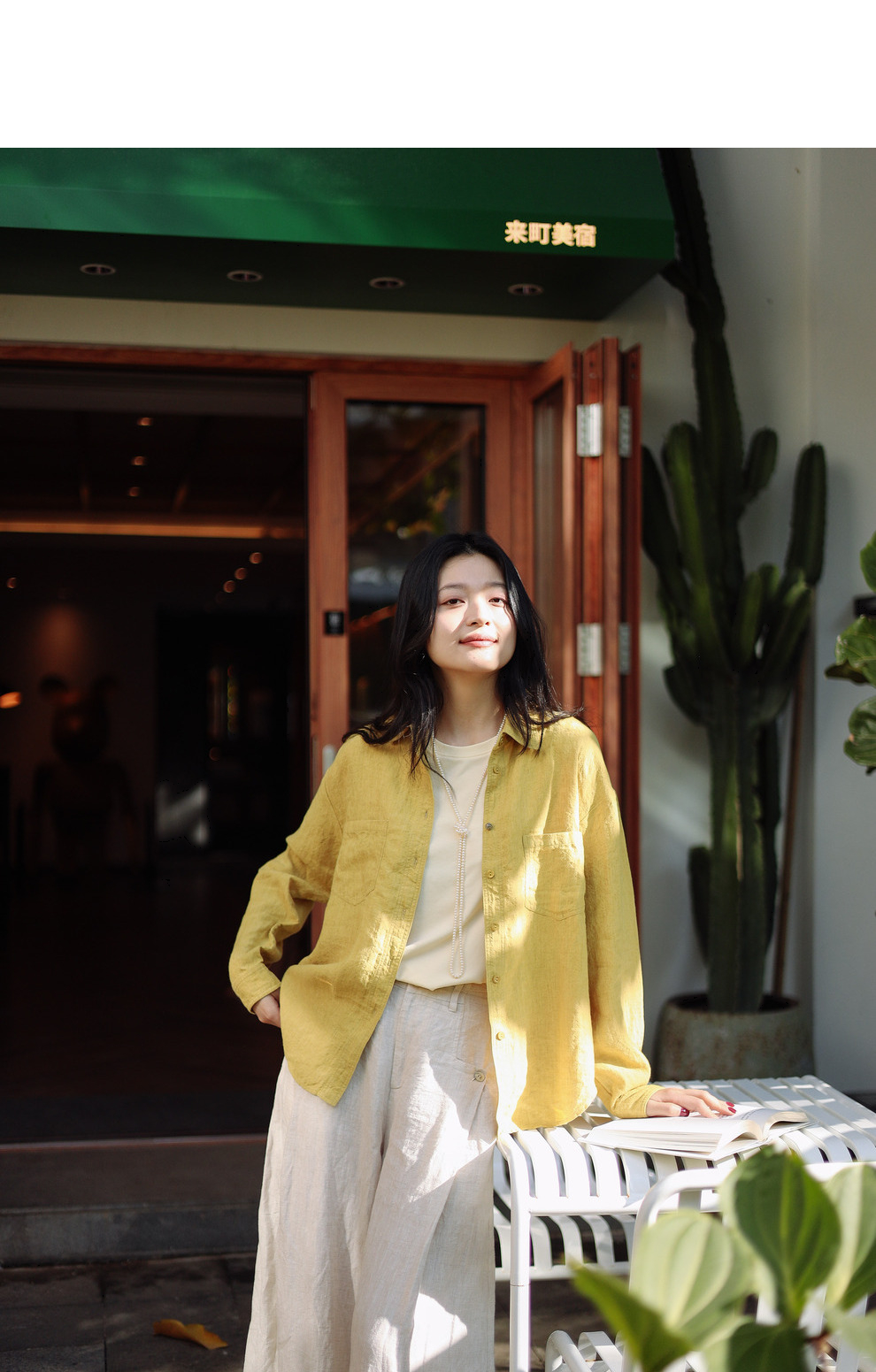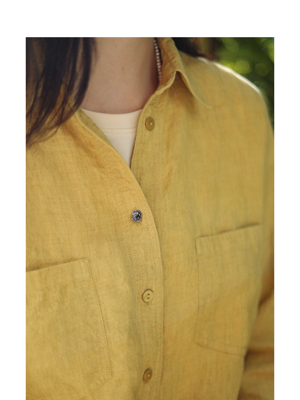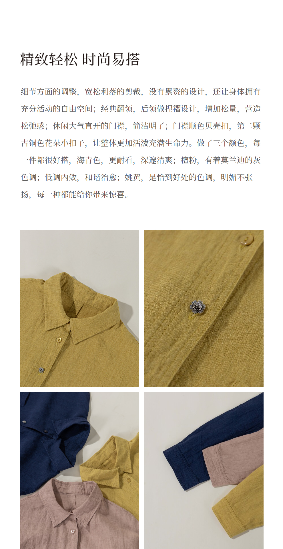 * 绽放109朵/高端盐缩酵素洗亚麻士林色织染色古铜花朵扣长袖衬衫