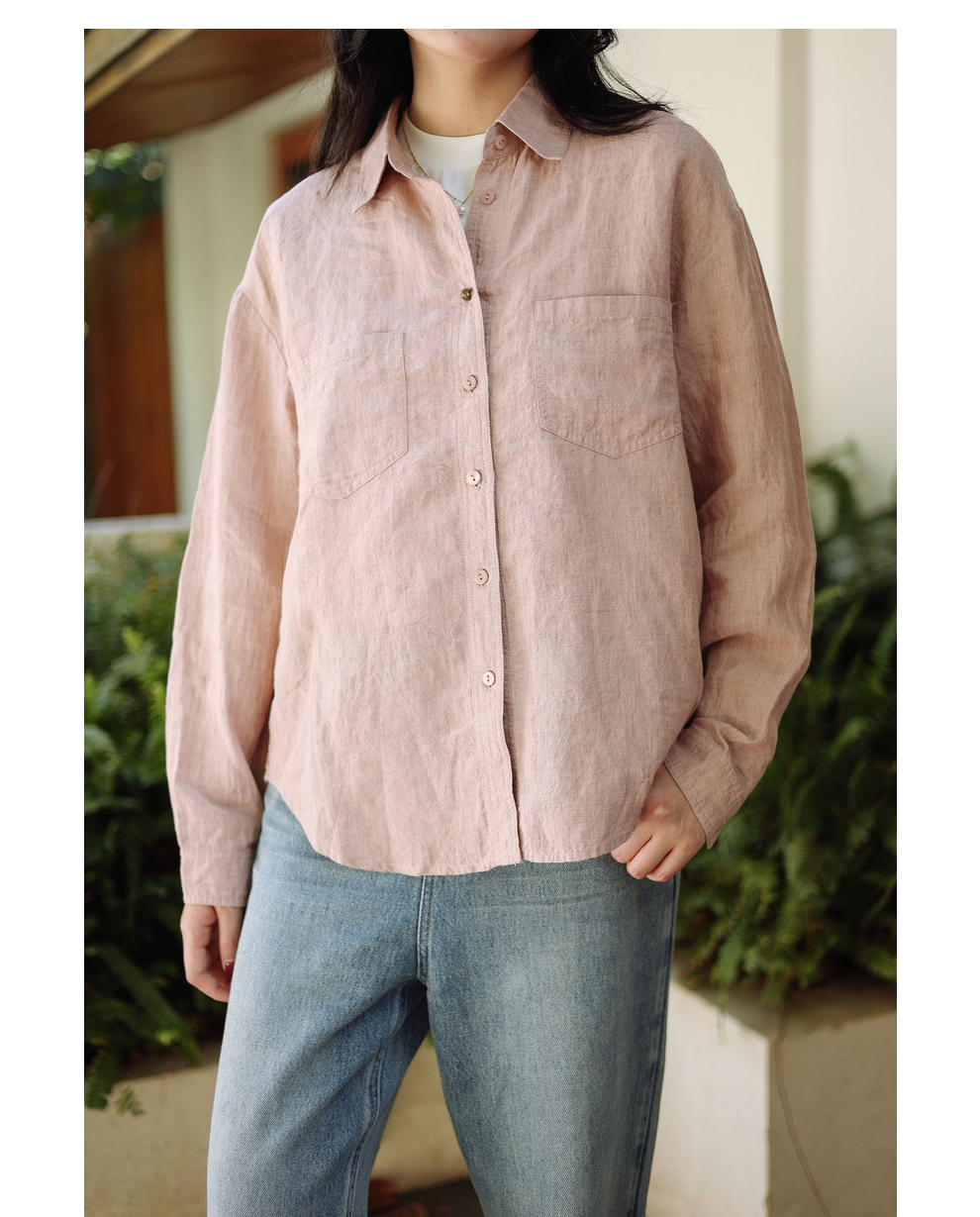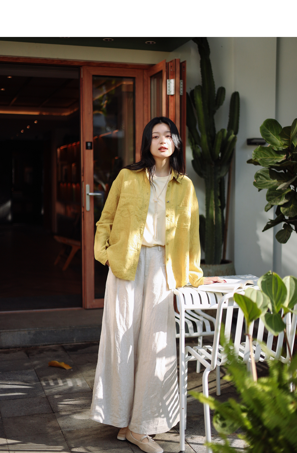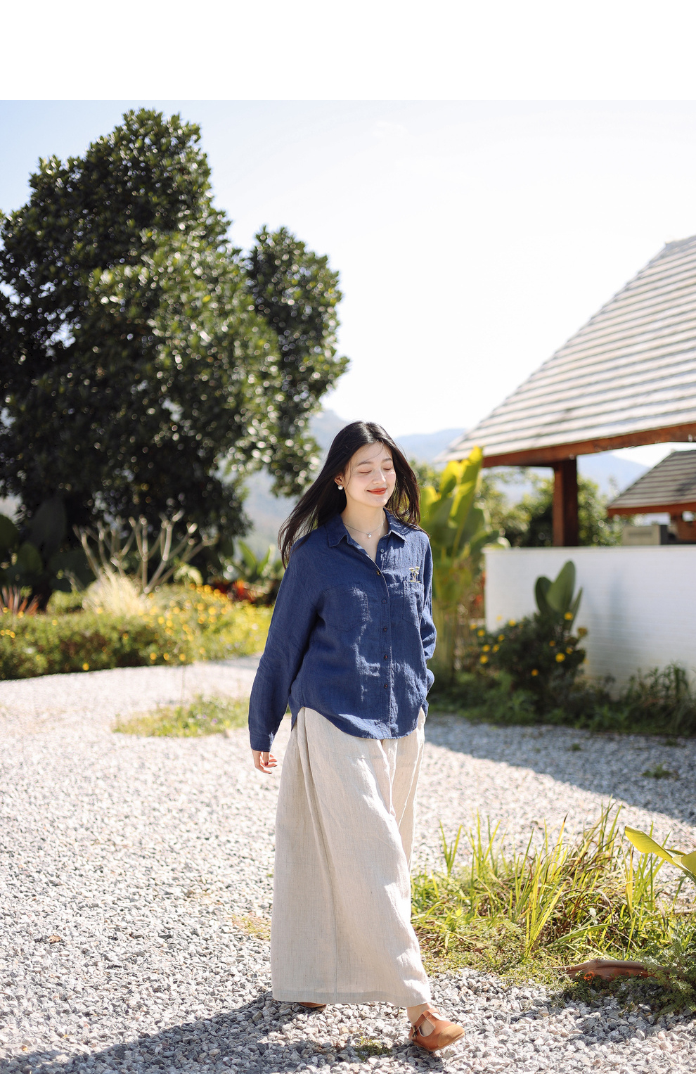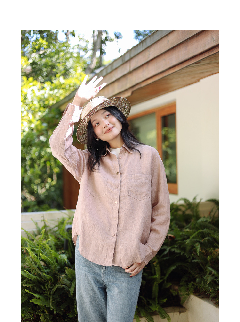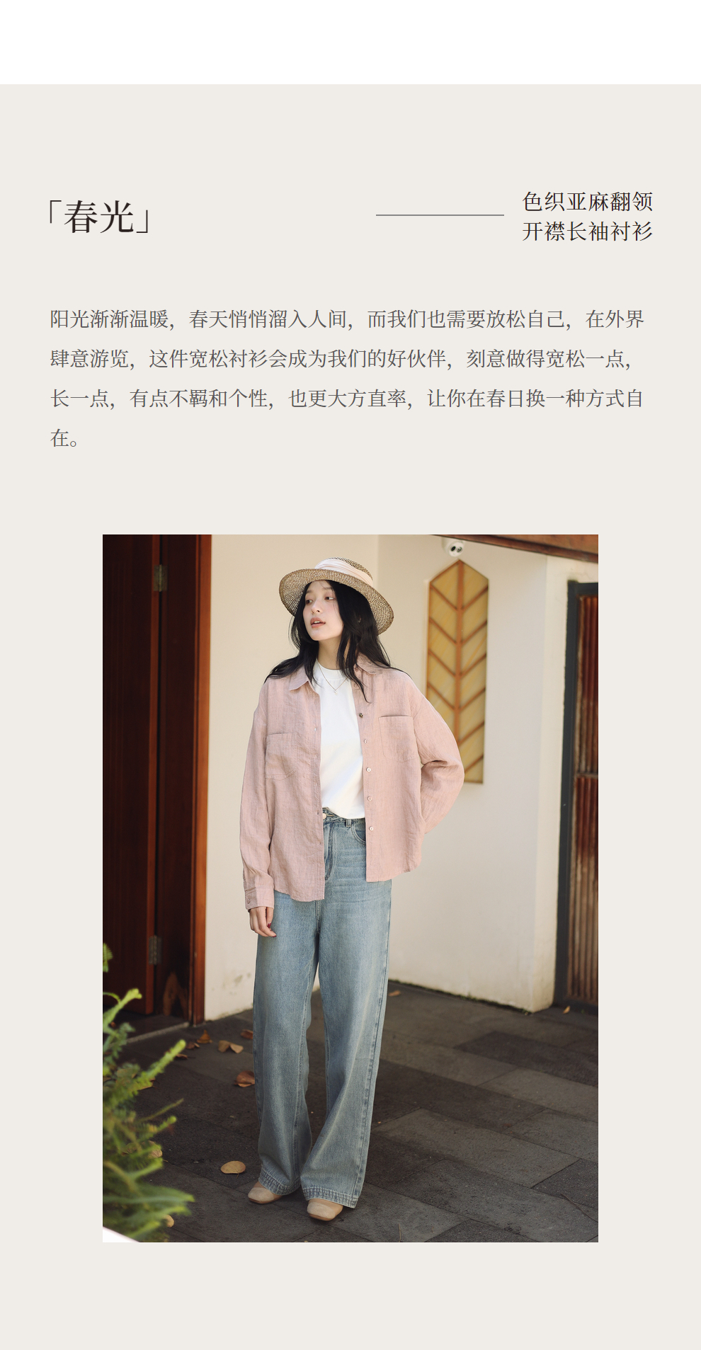 * 绽放109朵/高端盐缩酵素洗亚麻士林色织染色古铜花朵扣长袖衬衫