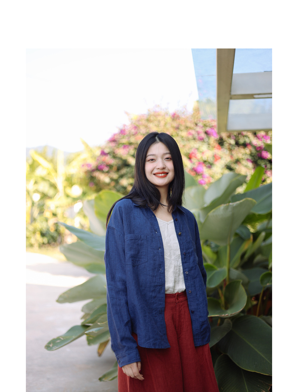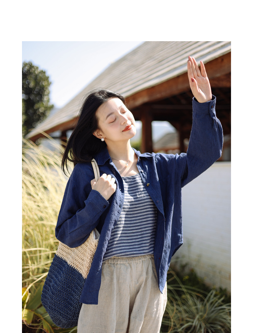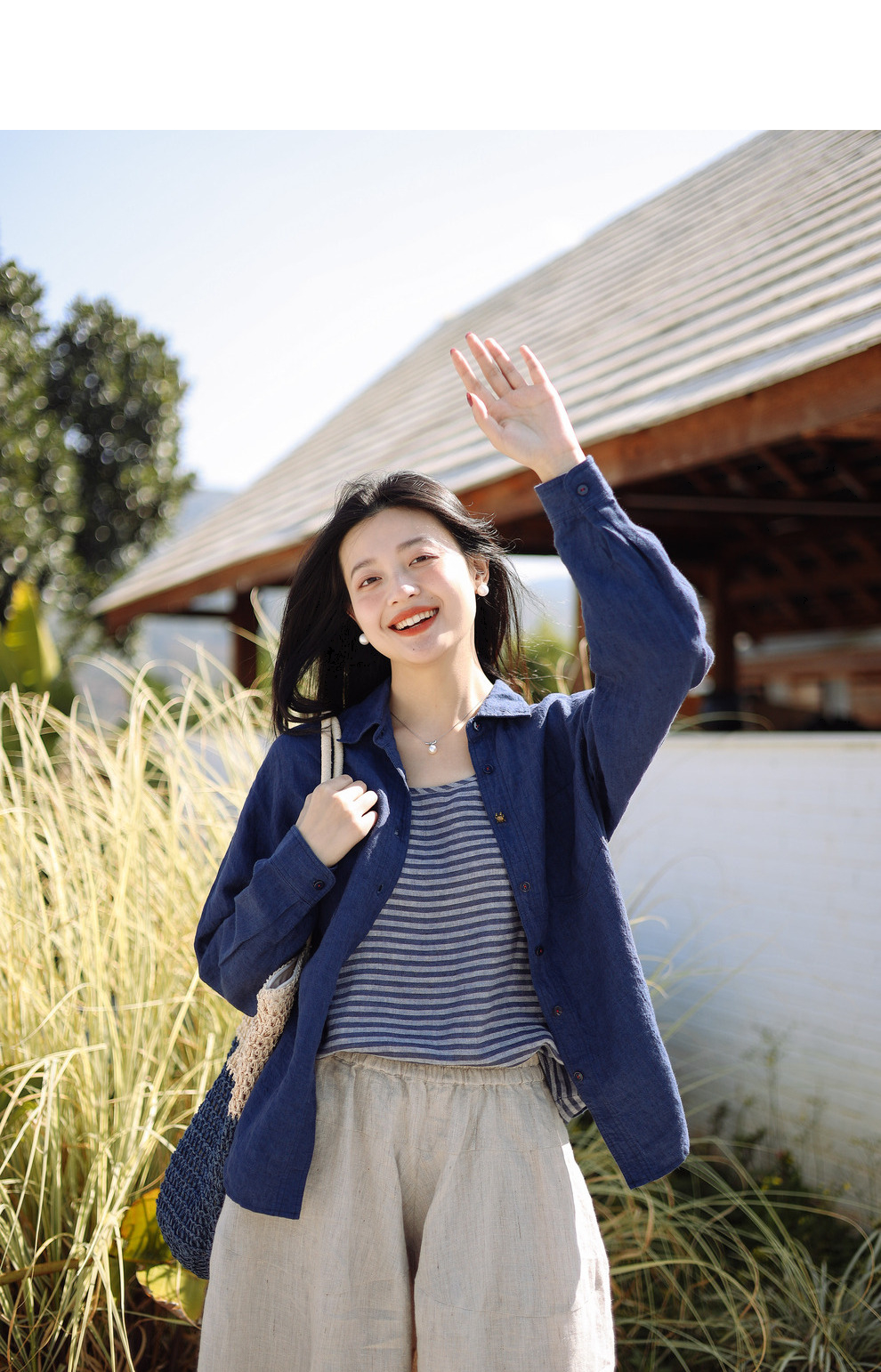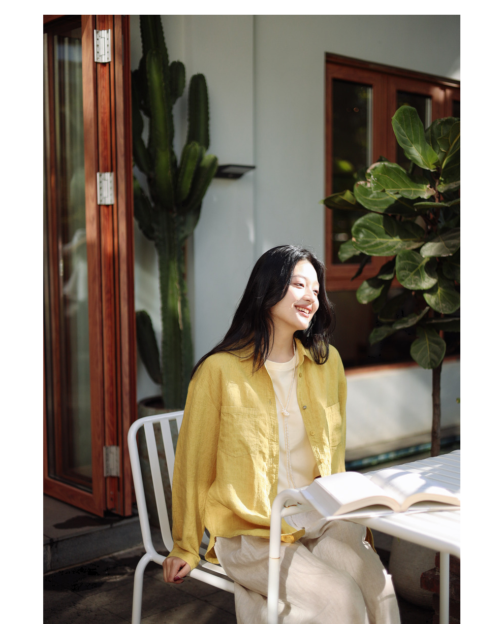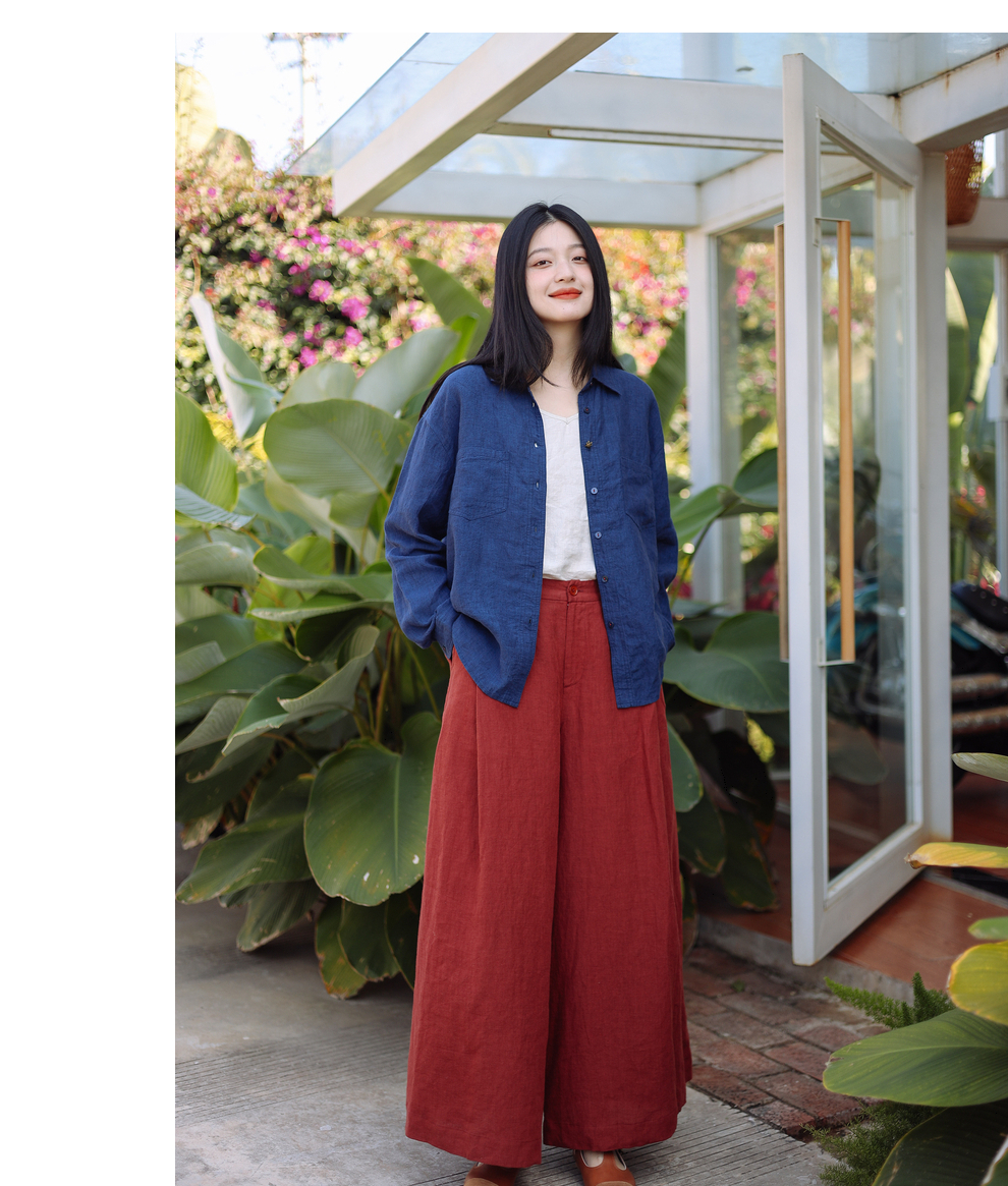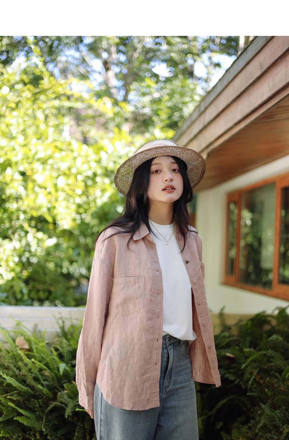 * 绽放109朵/高端盐缩酵素洗亚麻士林色织染色古铜花朵扣长袖衬衫