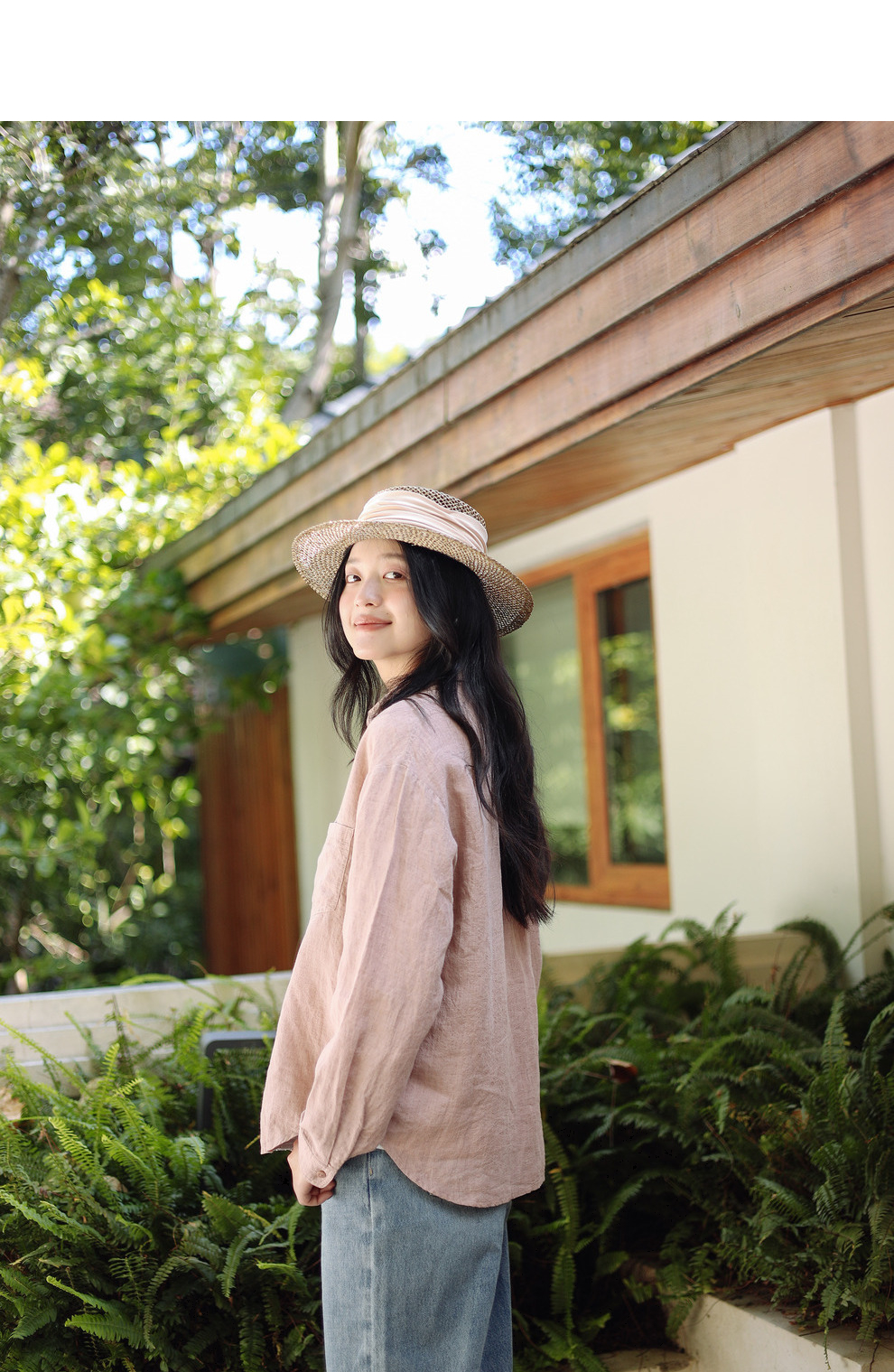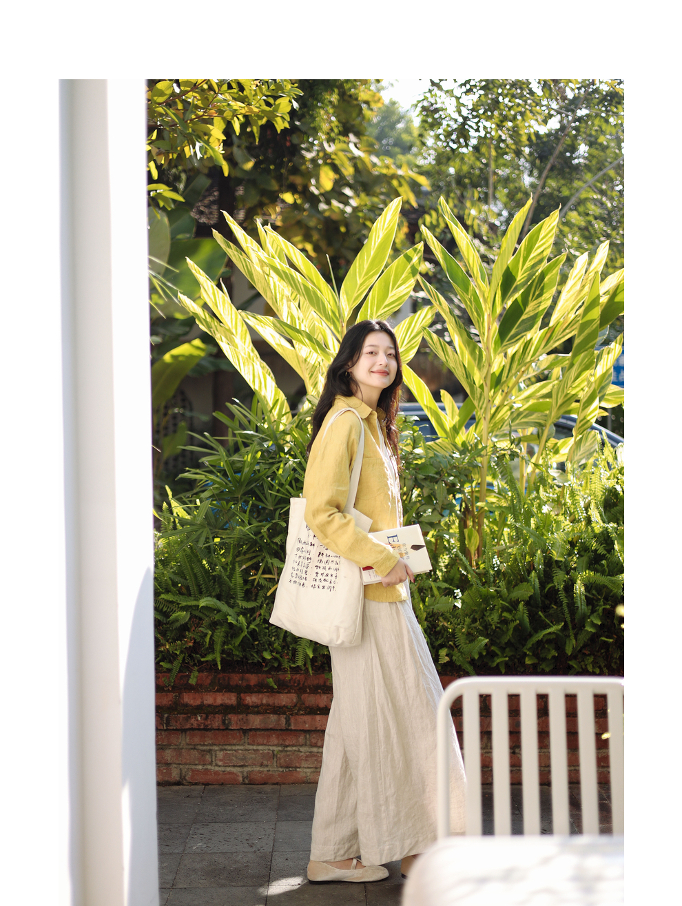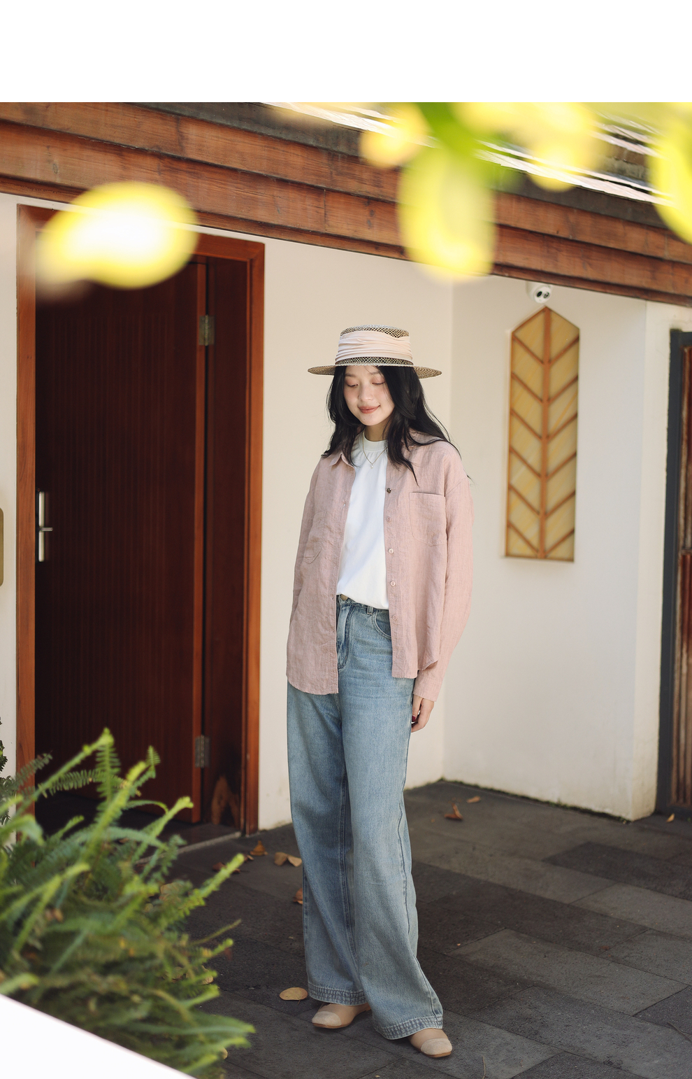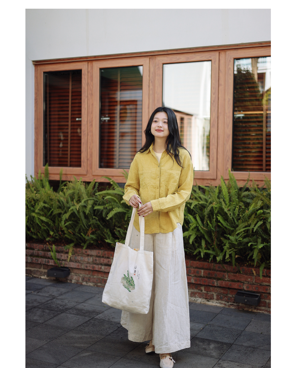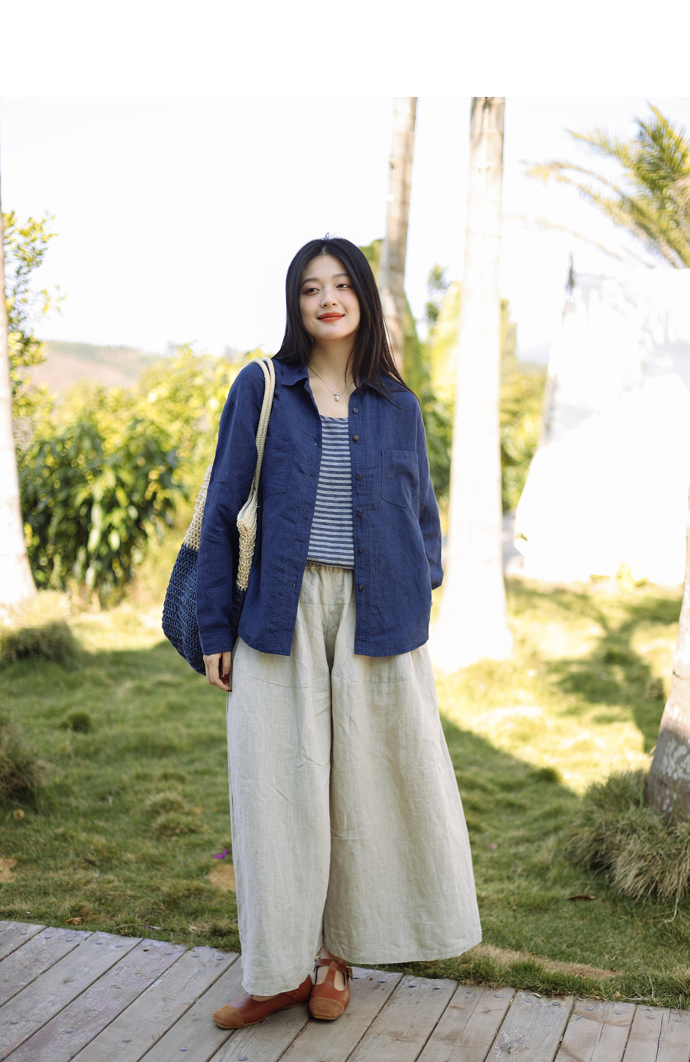 * 绽放109朵/高端盐缩酵素洗亚麻士林色织染色古铜花朵扣长袖衬衫