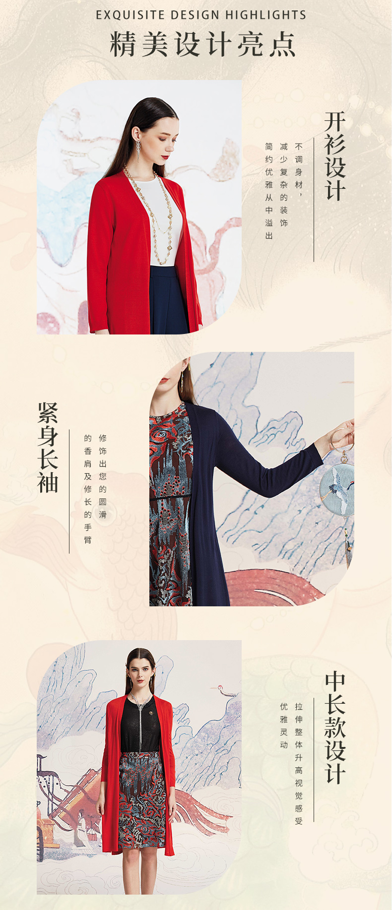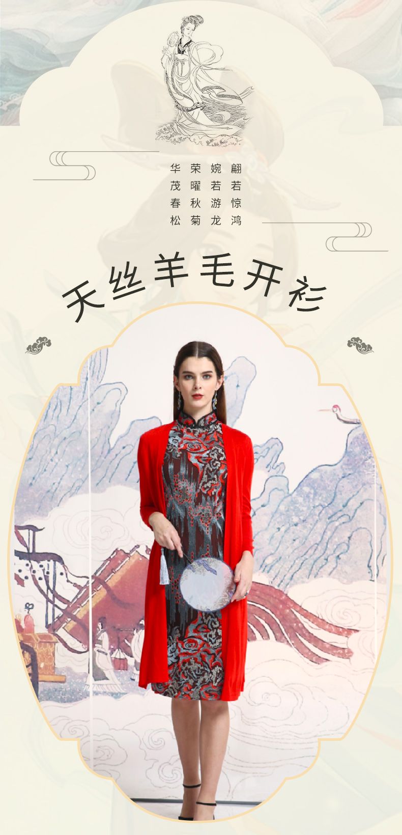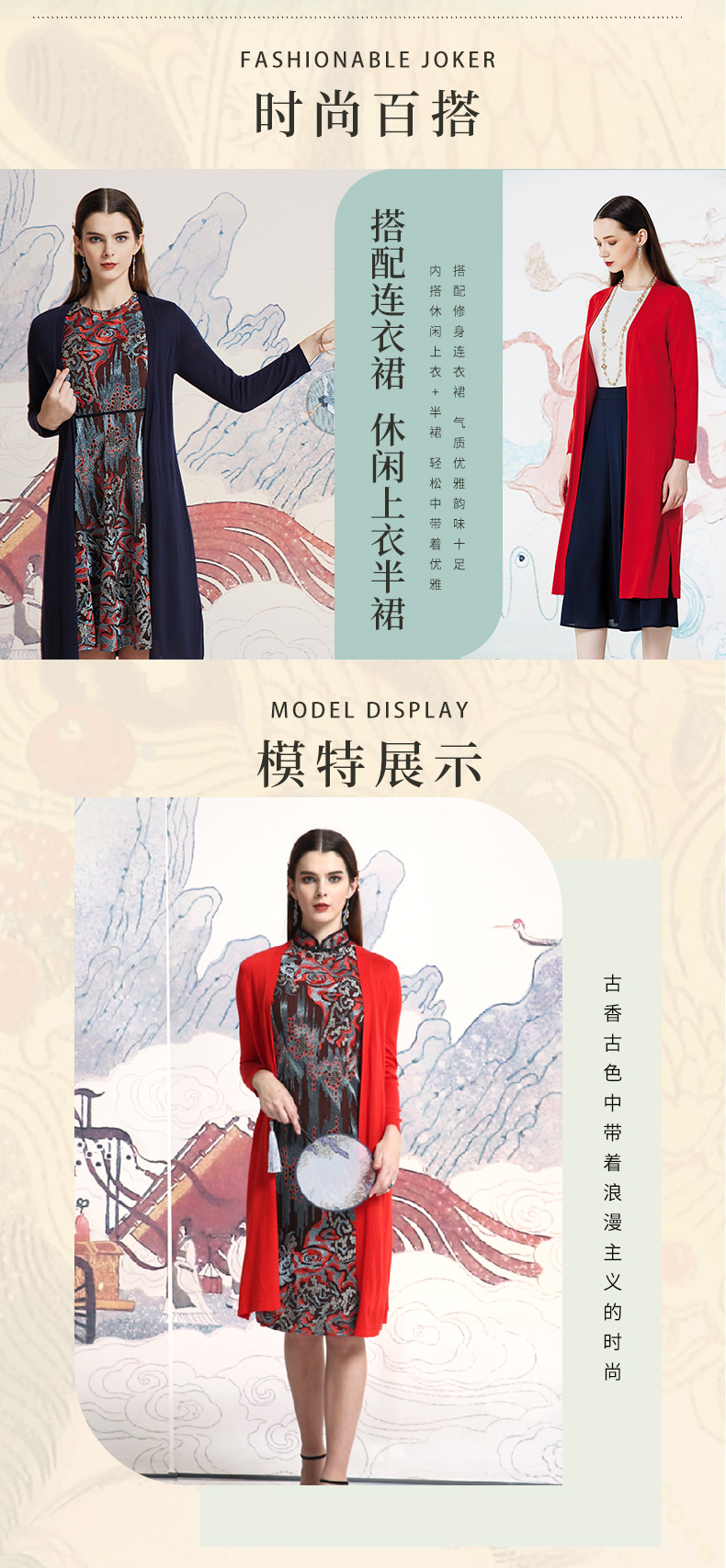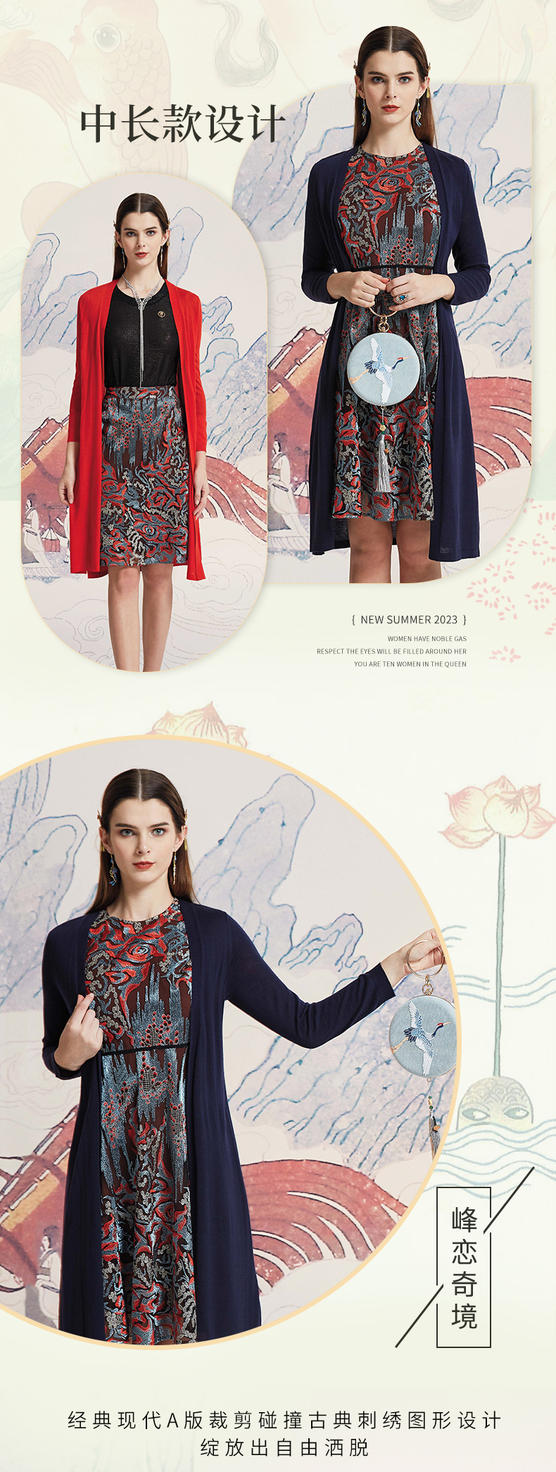 品牌风格:源自千年文学和万年艺术的时装,让你的气质内涵一枝独秀,精彩的品质,华丽的风格,炫耀的视觉,让你的衣品从此与众不同,标记你深厚的文化内涵与艺术气息。