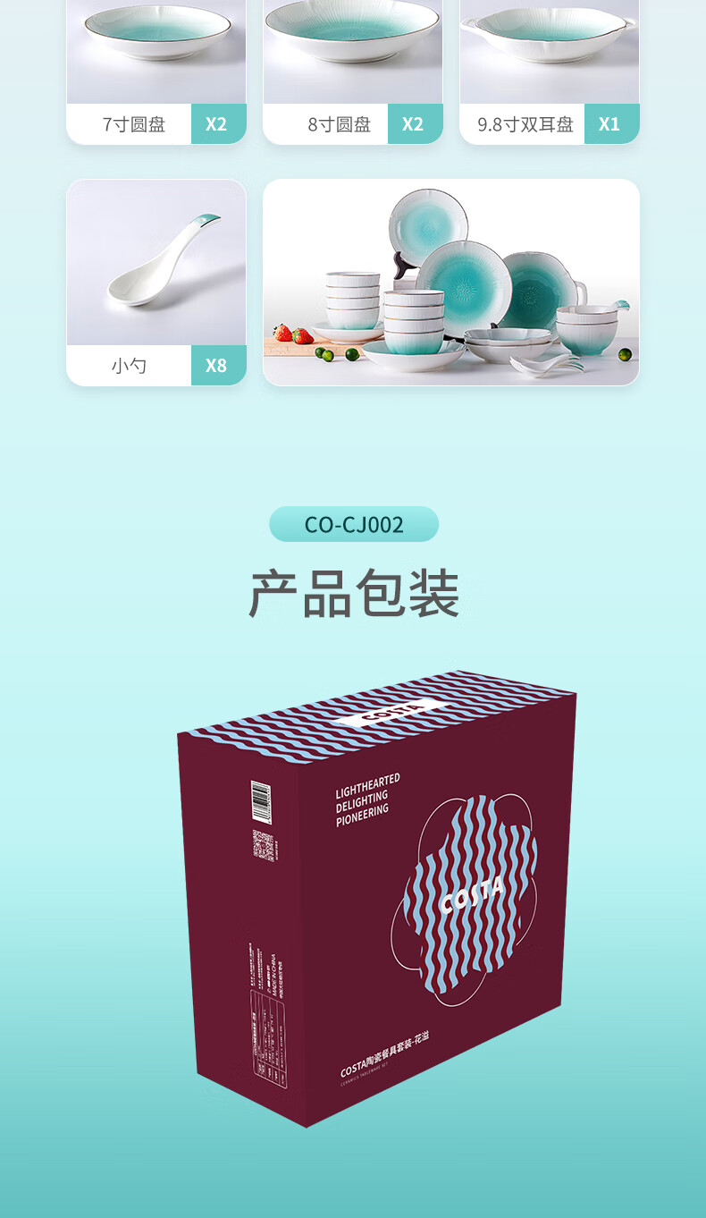 产品配置 : 4.5英寸碗*8;5英寸碗*2;7英寸花盘*2;7英寸圆盘*2;8英寸圆盘*2;9.8英寸双耳盘*1;小勺*8