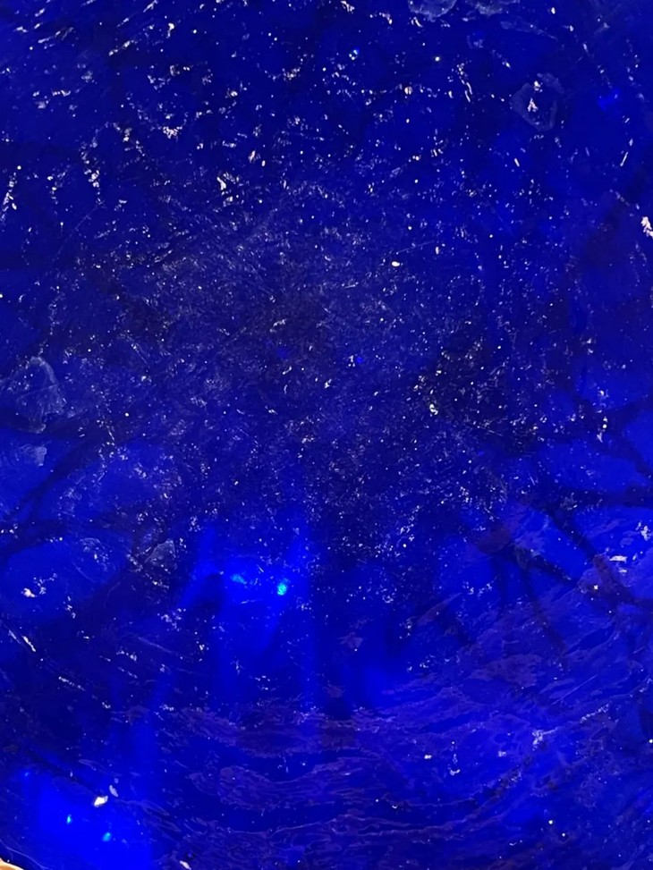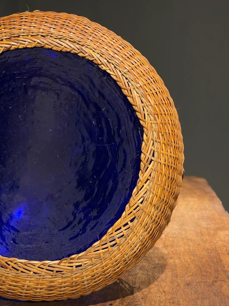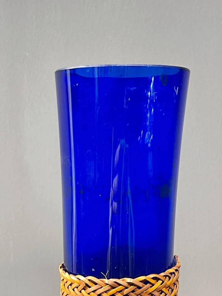这是一件制作精美的清代蓝色琉璃赏瓶,以色泽纯粹的蓝色琉璃料器吹制琢磨成高达六十厘米的长颈荸荠瓶,竹编护套环绕瓶身,整体风格优雅大气,荸荠型喇叭口长颈蓝料玻璃瓶独具一格,瓶身竹编护套精緻细腻,是一件清代宫廷琉璃作坊风格的赏瓶。