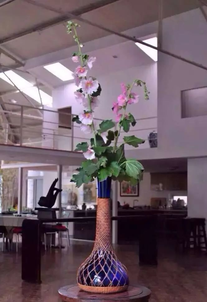 此编竹护套蓝料长颈荸荠瓶,清代宫廷气质高雅,尺寸硕大,是转转会女主人已收藏数十年的优美花器,高达六十厘米的喇叭口长颈瓶最合适插长梗的花卉,夏天蜀葵花开时,插上各色长梗蜀葵花,摆在高达八米的转转会工作室里,也算是每年夏天令人赏心悦目的美景。
