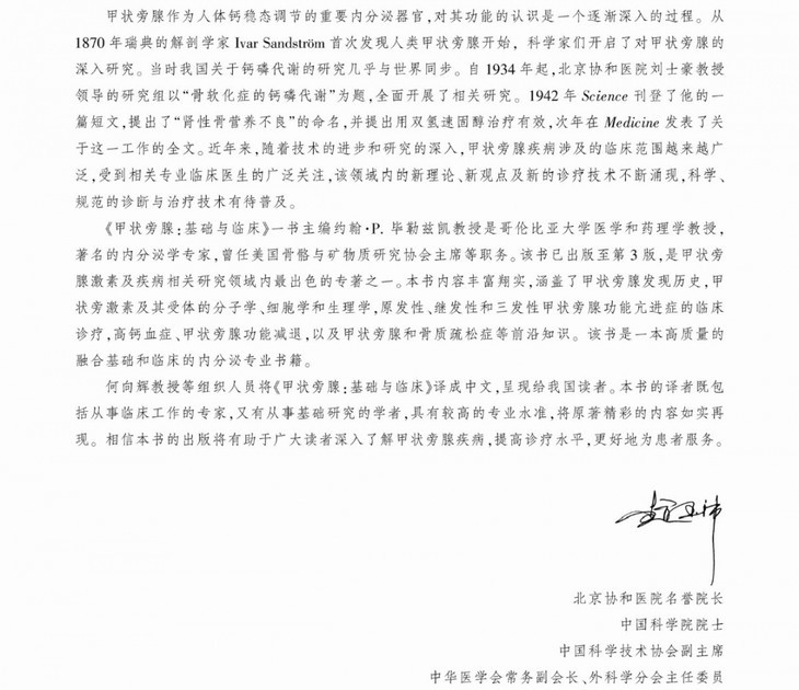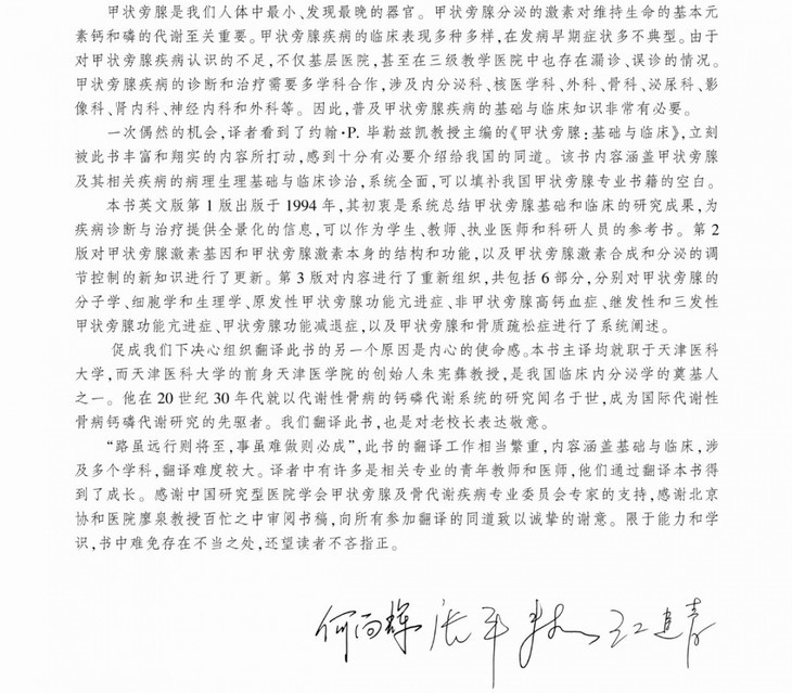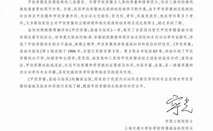 该书的翻译出版,将有助于我国内分泌及相关学科的专业医生全面了解甲状旁腺的基础及临床知识,提高诊疗水平。同时,对于甲状旁腺及骨代谢领域的科研人员及研究生,也是不可多得的指导教材,具有重要的社会意义和出版价值。