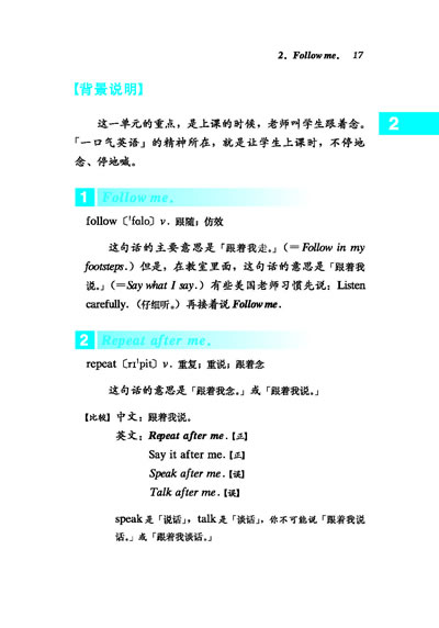 《一口气背教师课堂口语中的108句,都是精挑细选,美国口语中的精华。你只要按照所背的东西来教「一口气英语」,你就可以整堂课都用英语教书了。同样的话讲腻了,可以选择书中的其他句子来代替,或增加一些新句子。