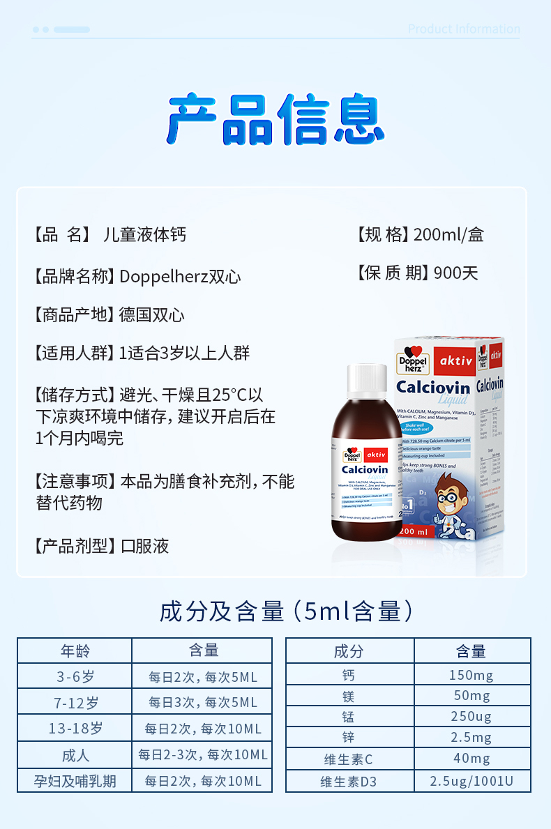 【德国双心】钙镁锌液体口服液青少年儿童多维补钙补锌液体钙
