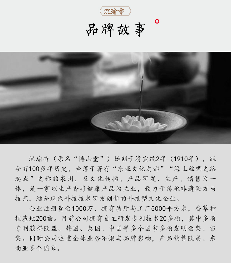 本店为沉瑜香旗舰店,沉瑜香始创于1910年,为非物质文化遗产“养生香制作技艺”项目保护单位