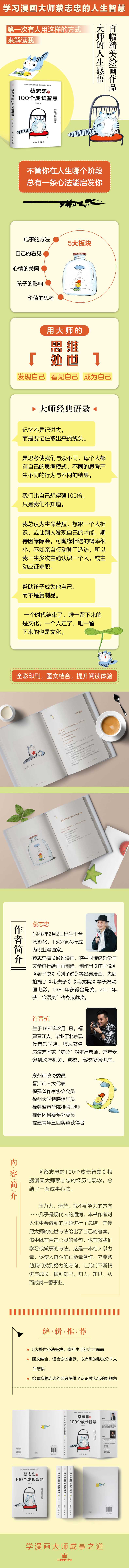 《蔡志忠的100个成长智慧》根据漫画大师蔡志忠的经历与观念,总结了一套成事心法。