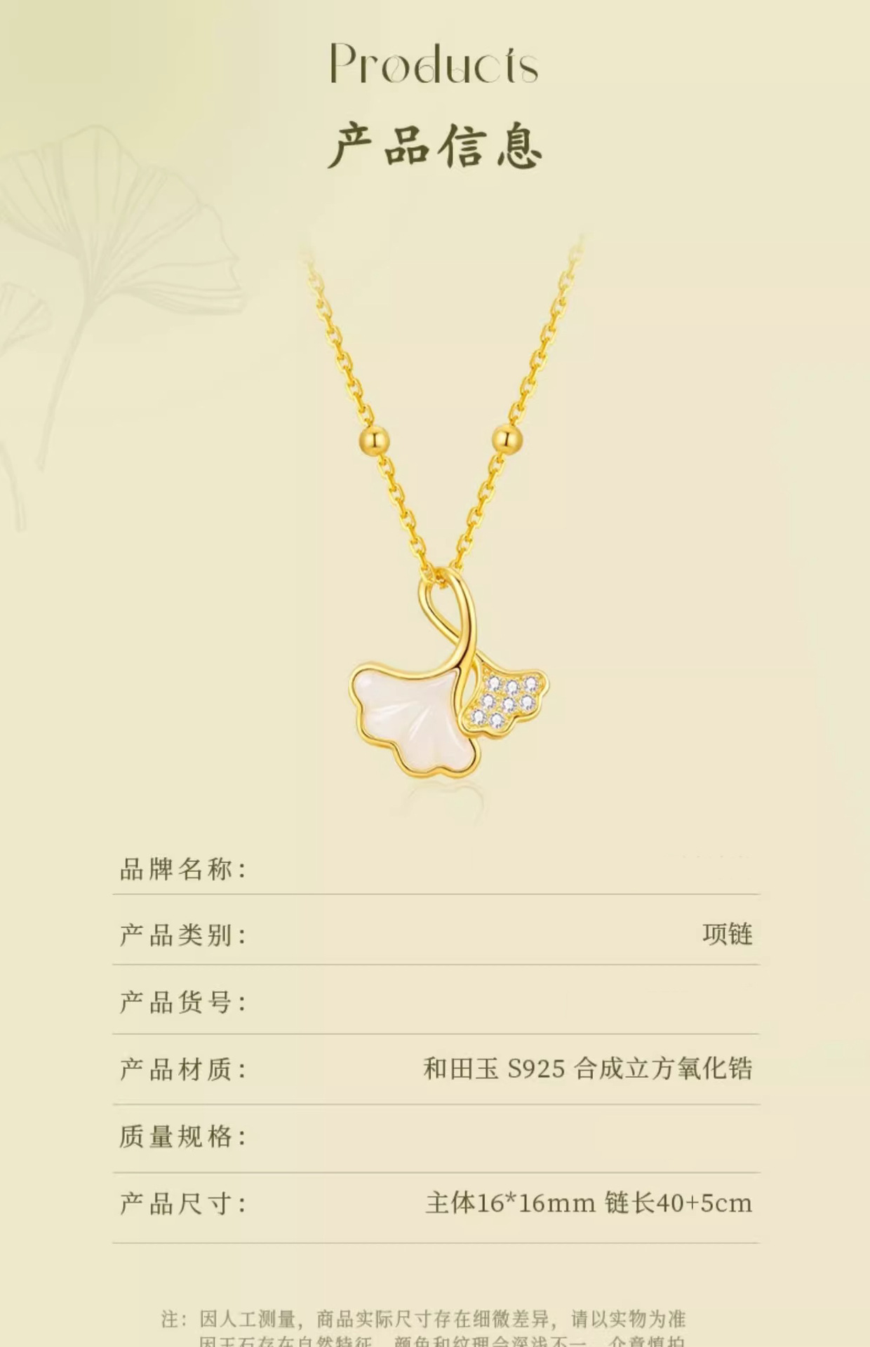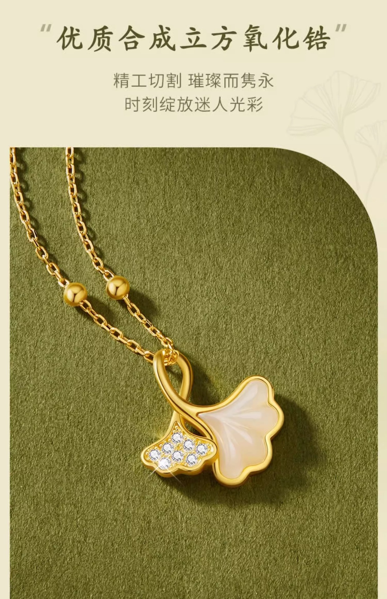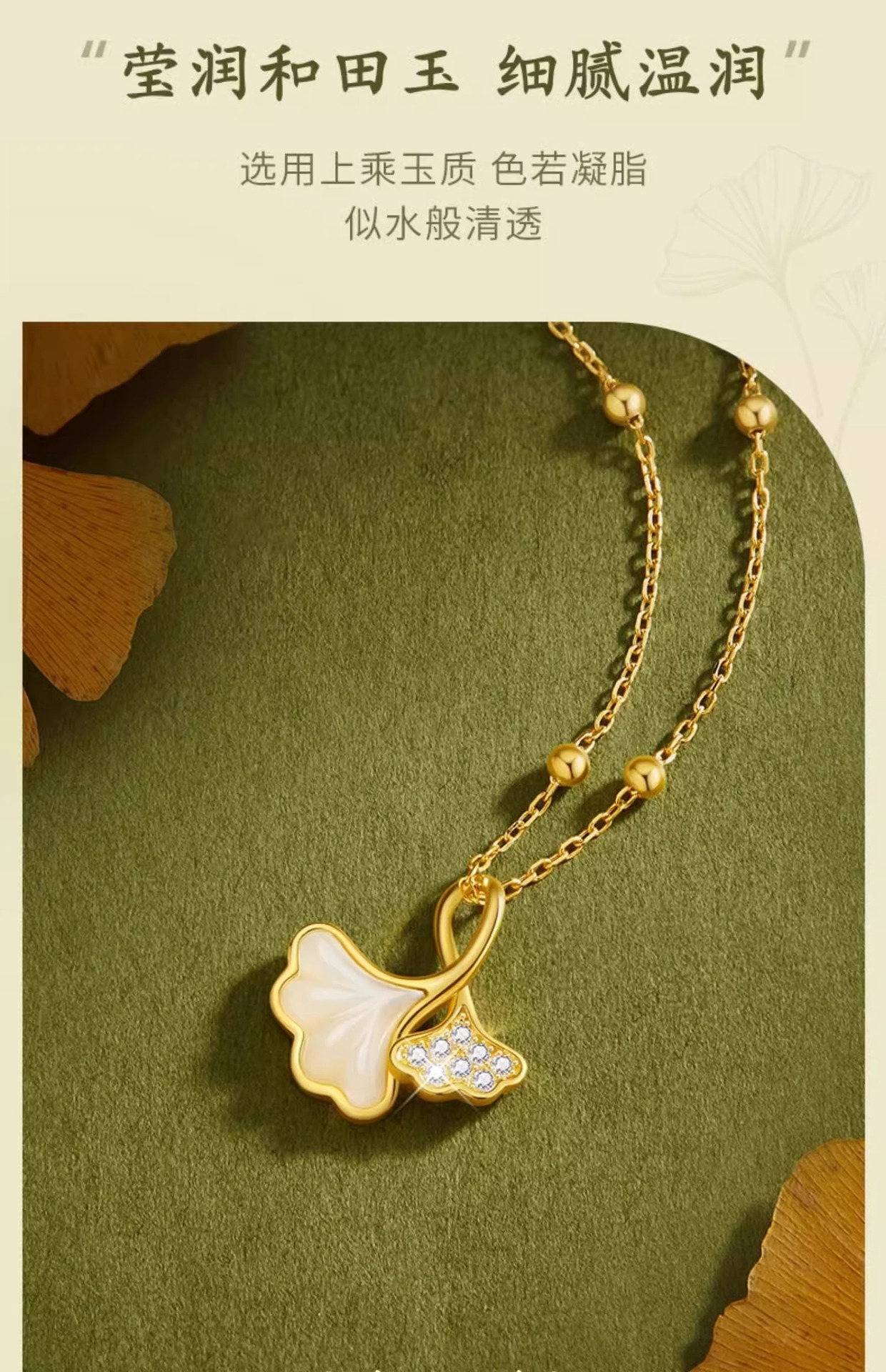 六鑫珠宝 S925纯银和其有杏简约古风和田玉银杏叶锁骨链