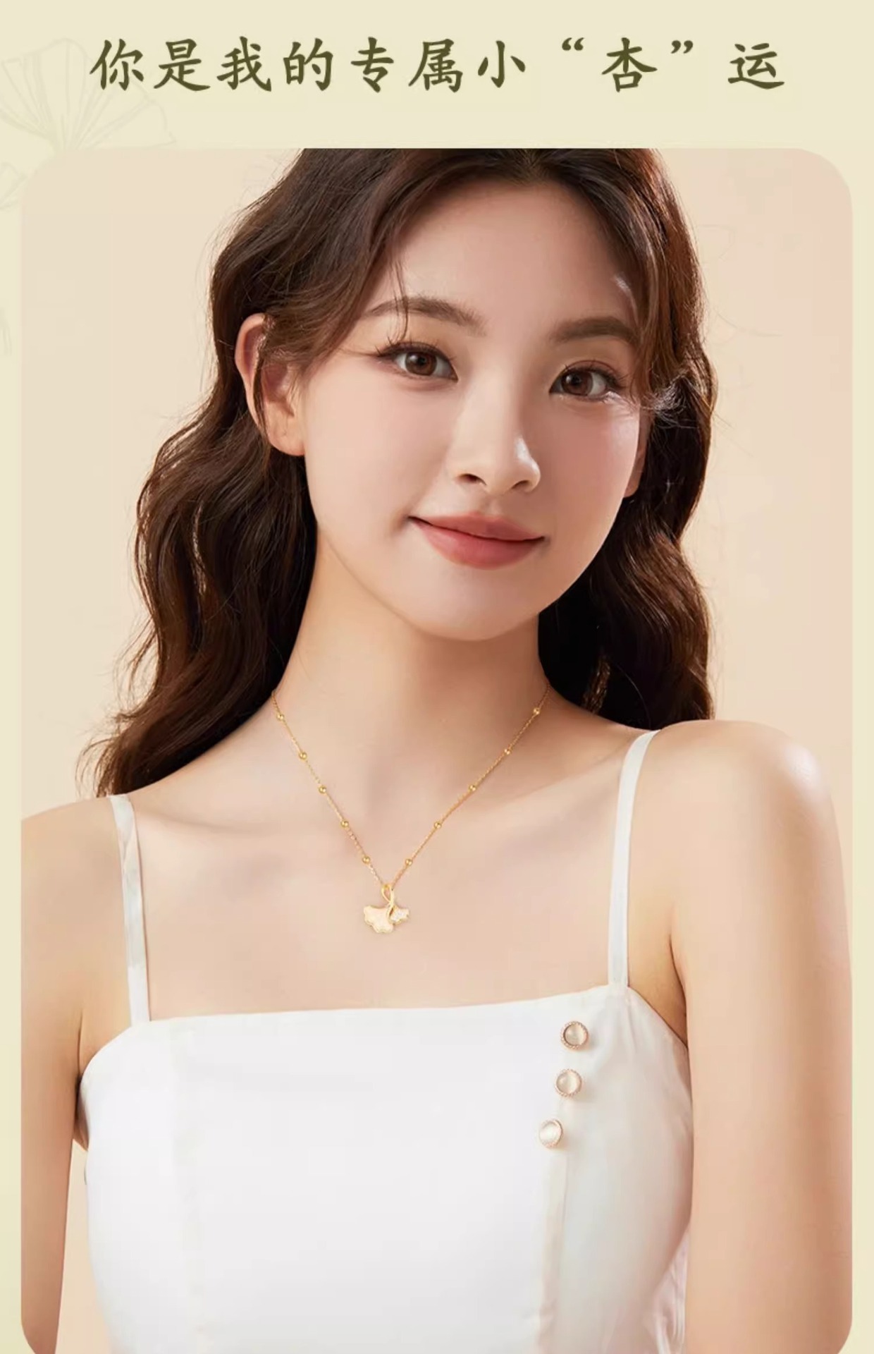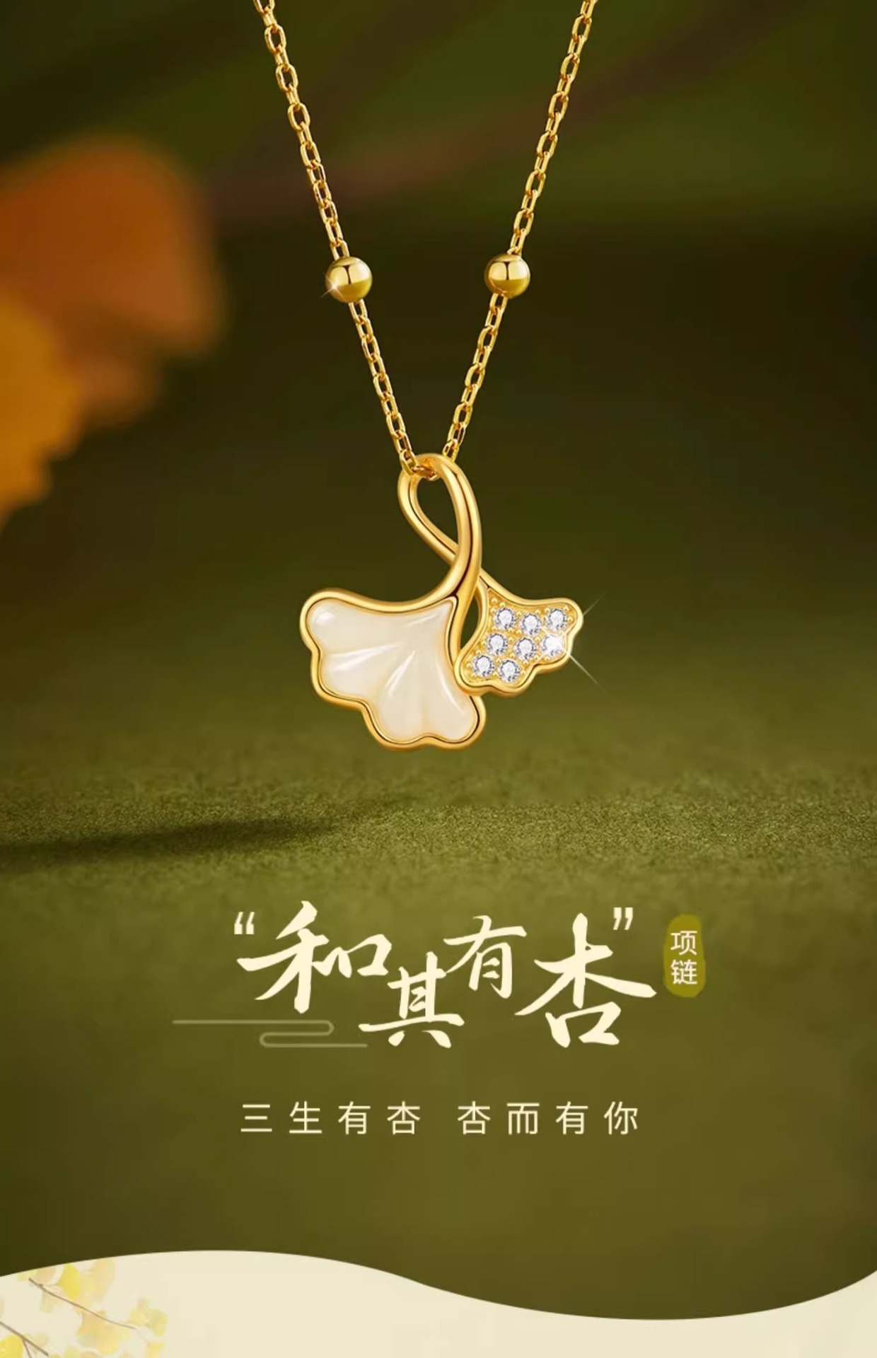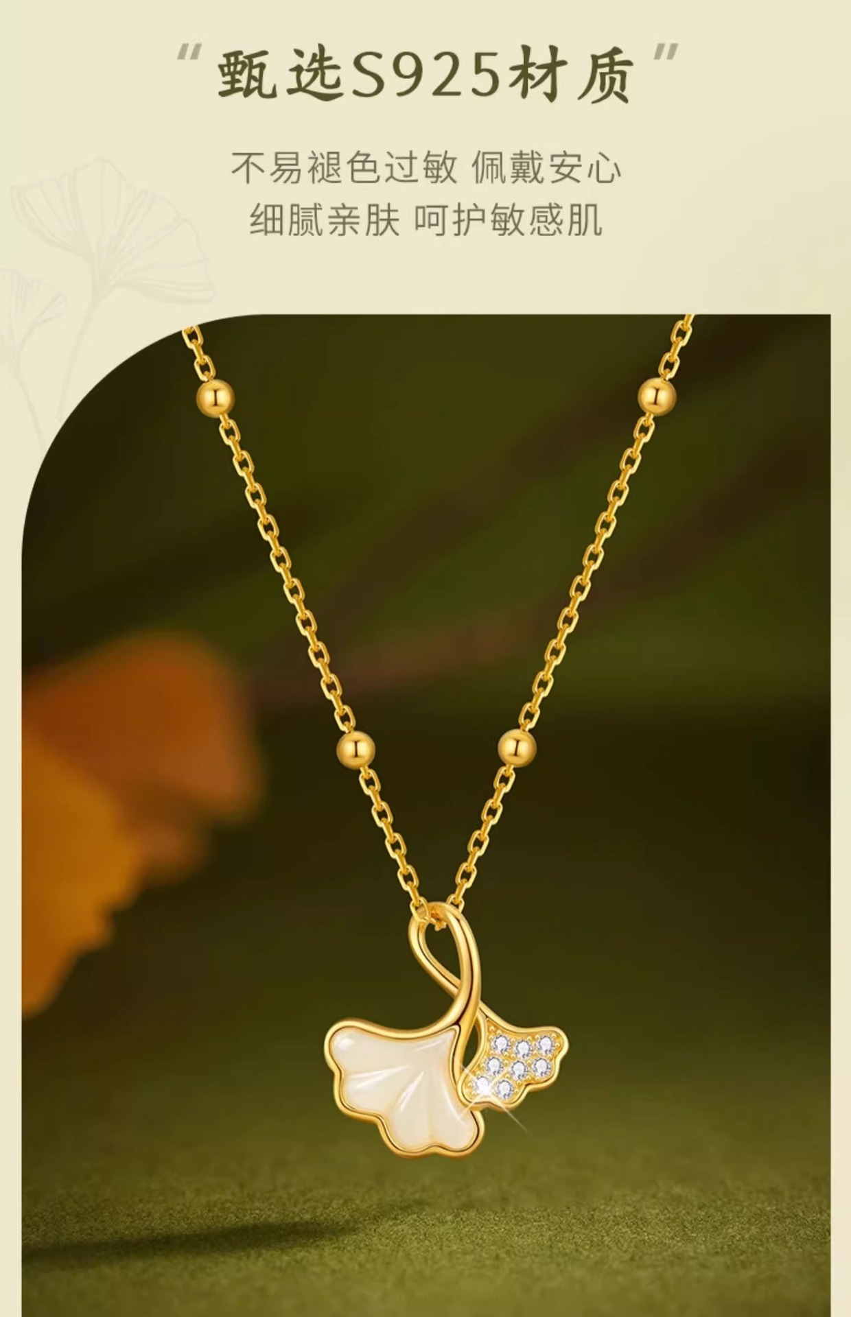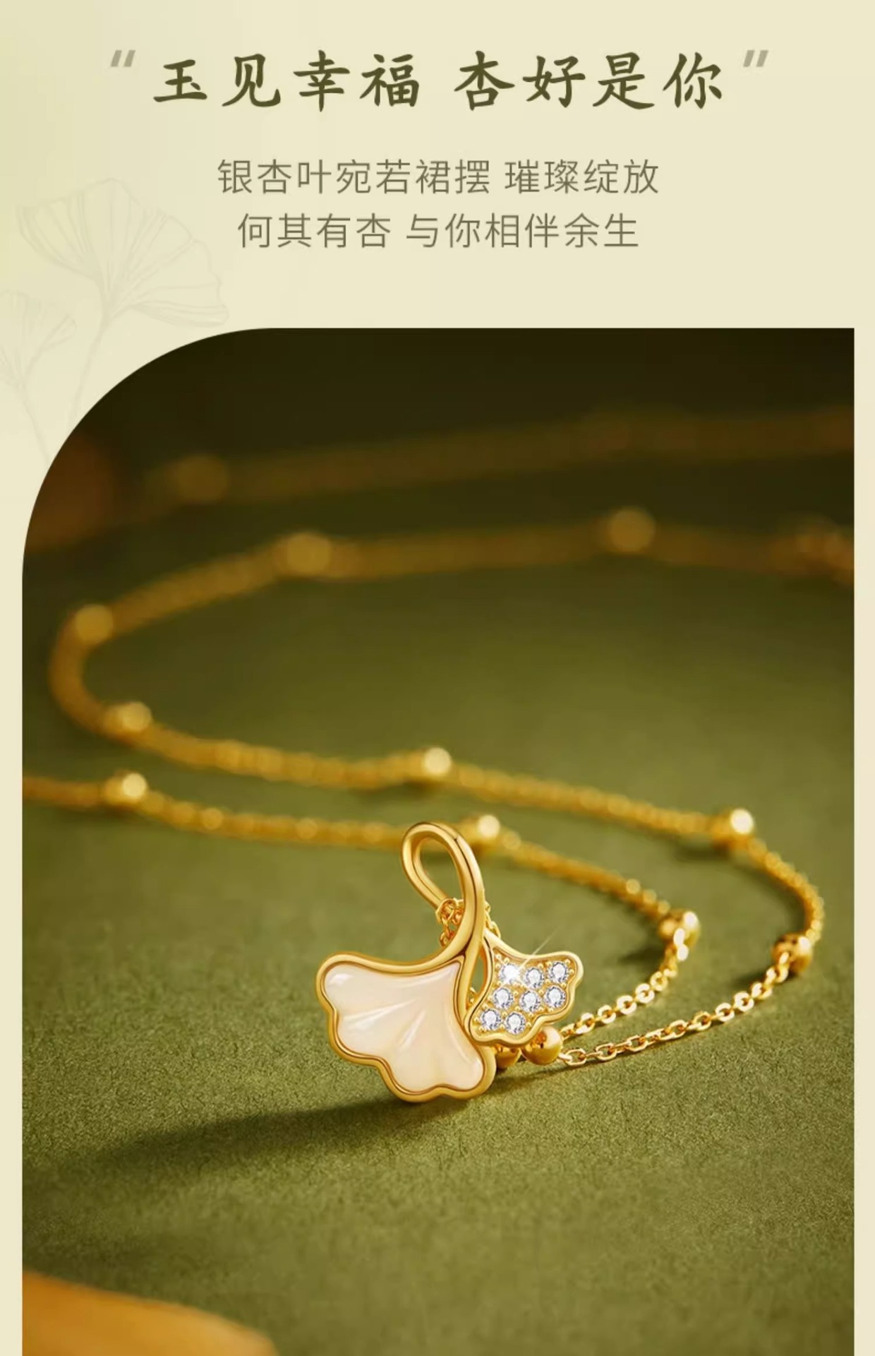 六鑫珠宝 S925纯银和其有杏简约古风和田玉银杏叶锁骨链