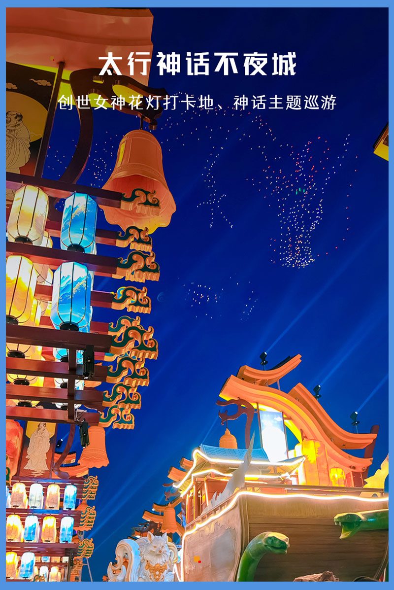 不夜城内,华灯初上,灯火阑珊,灯光成为另一种风景。太行神话不夜城的传统民俗大秀表演节目亦是丰富多彩,舞龙、抗桩、独辕四景车、喷火、糖画、跑旱船、斗鸡等一系列的民俗演绎轮番登场,在迷人的夜景下添了一抹色彩。还有本地神话文化,打造了后裔射日、精卫填海、女娲补天、神农尝草、大禹治水、人鱼传说、天女散花等剧目。(具体演出项目以景区官方公布为准)。