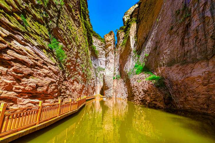 黄崖洞因山壁为黄色,东崖半腰有一天然石洞而得名。这里峭壁连绵数十公里,拔地而起,与举世闻名的美国科罗拉多大峡谷颇为相似,远看黄崖洞根本看不到进山的道路,走到峭壁前面,才发现有一条被称为“瓮圪廊”的S形的峡谷,长1.5公里,两侧高30米到200米,仰望只见蓝蓝一线,所以又叫一线天,这里是一夫当关、万夫莫开的雄关险隘。著名的黄崖洞保卫战就发生在这里。