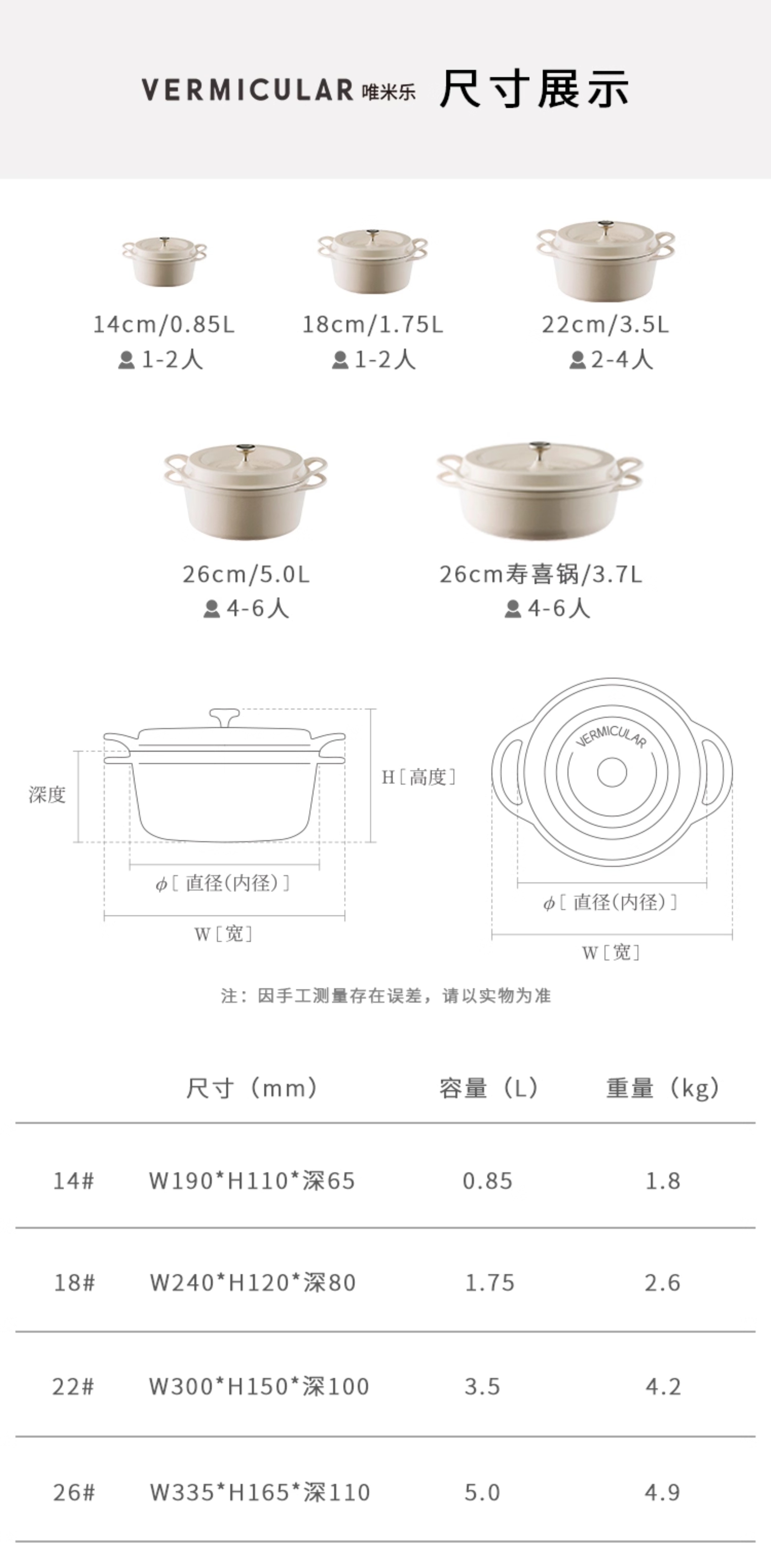日本唯米乐VERMICULAR无水料理铸铁珐琅锅(14cm、18cm、22cm)