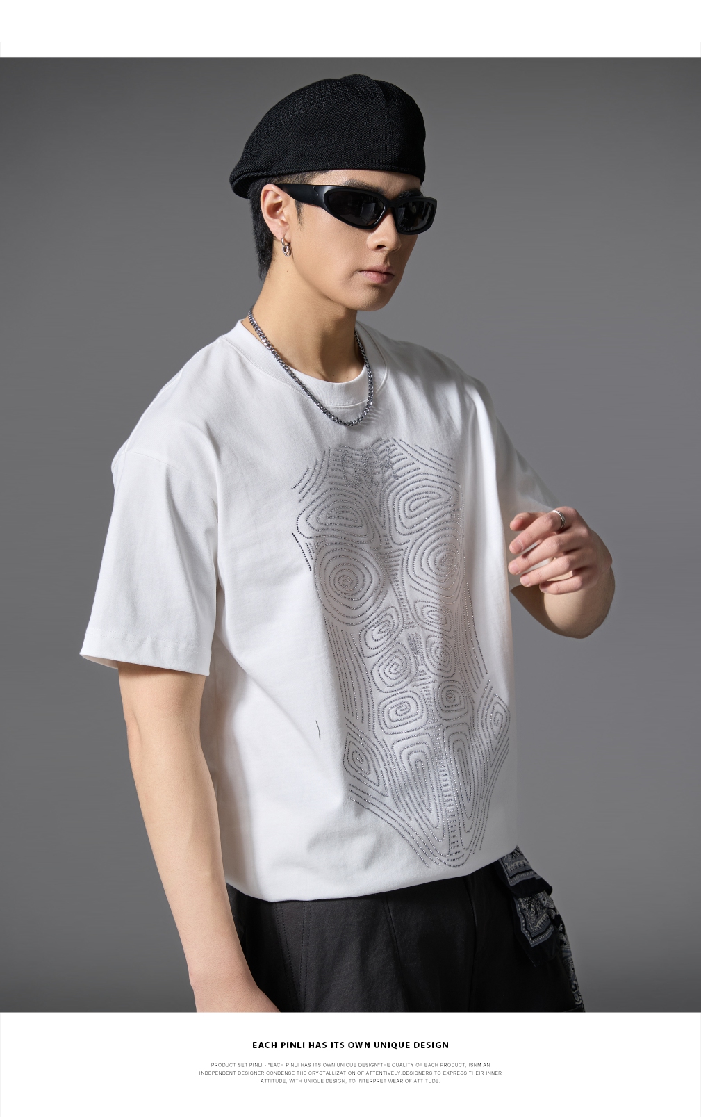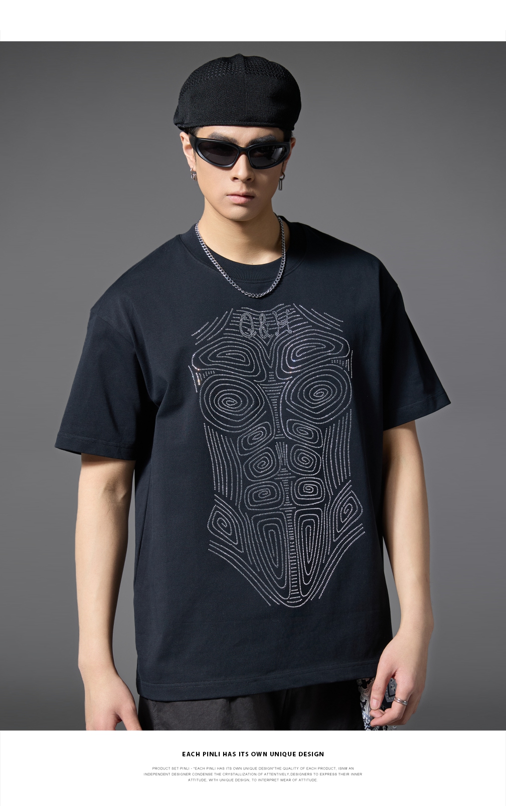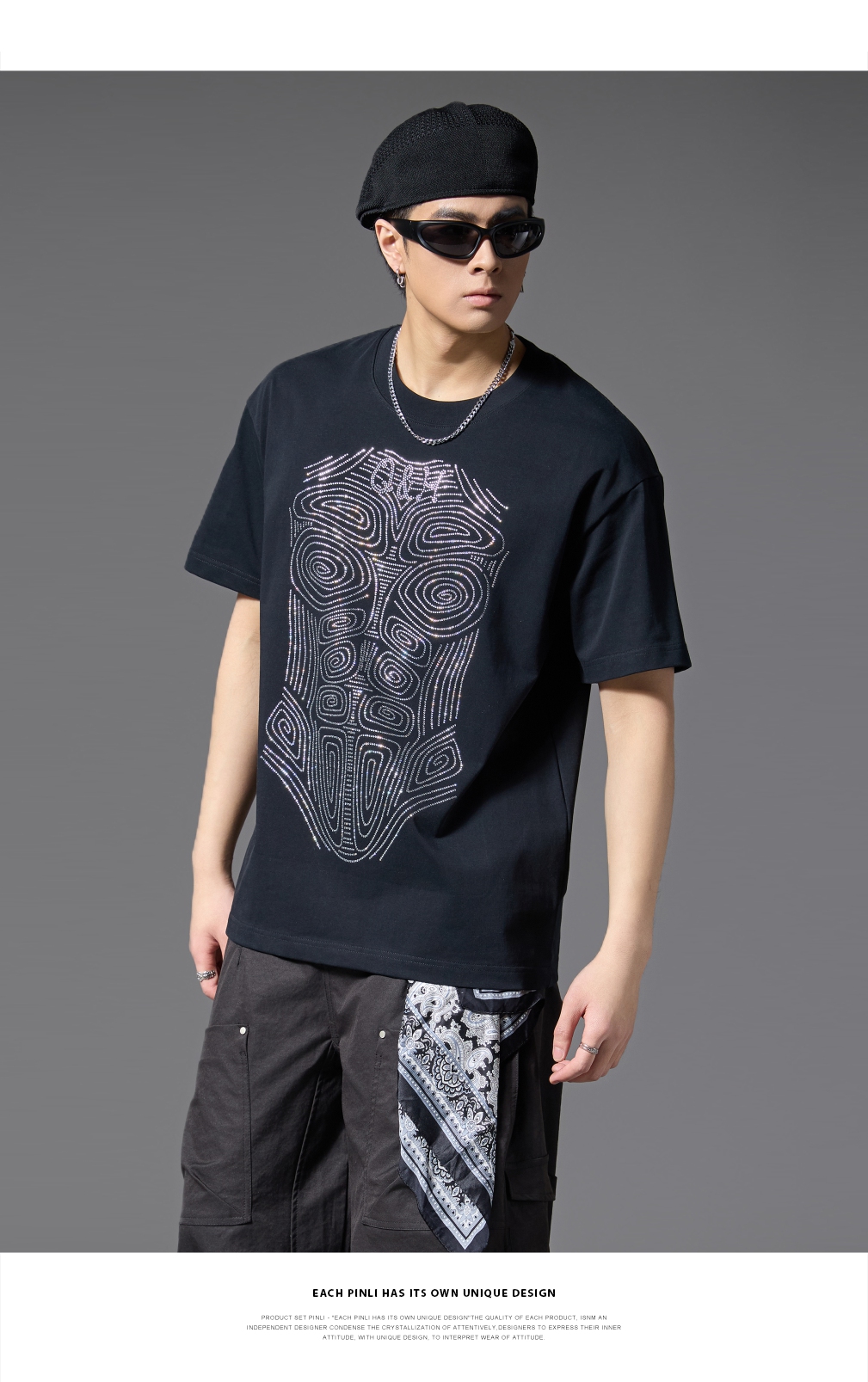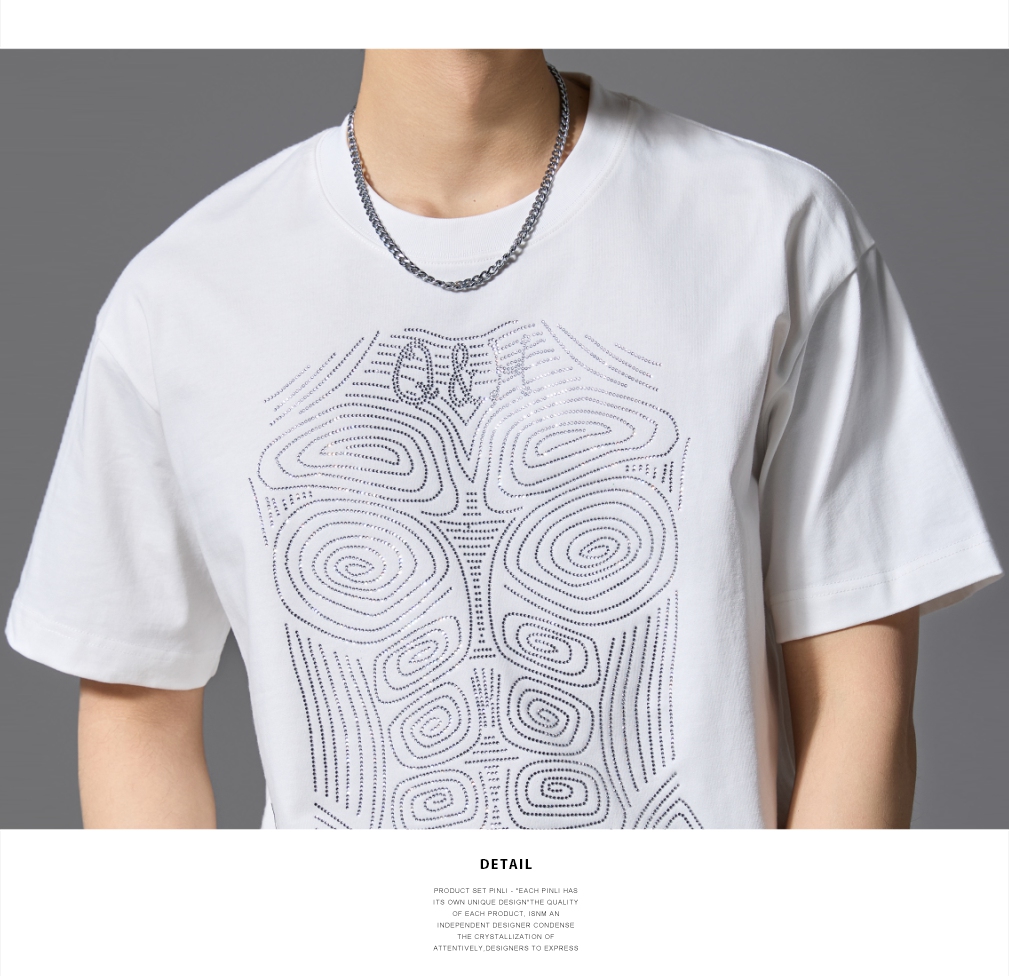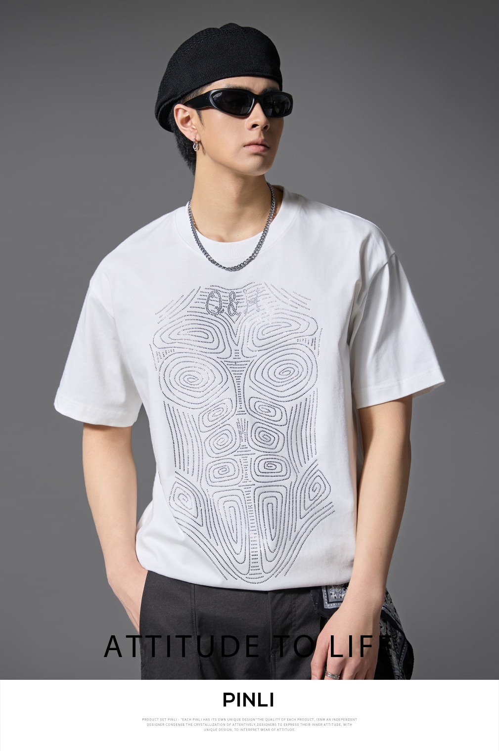 PINLI品立2025春夏新款时尚烫钻短袖T恤男士纯棉潮牌休闲百搭上衣BG252111012