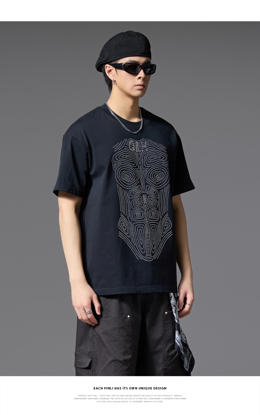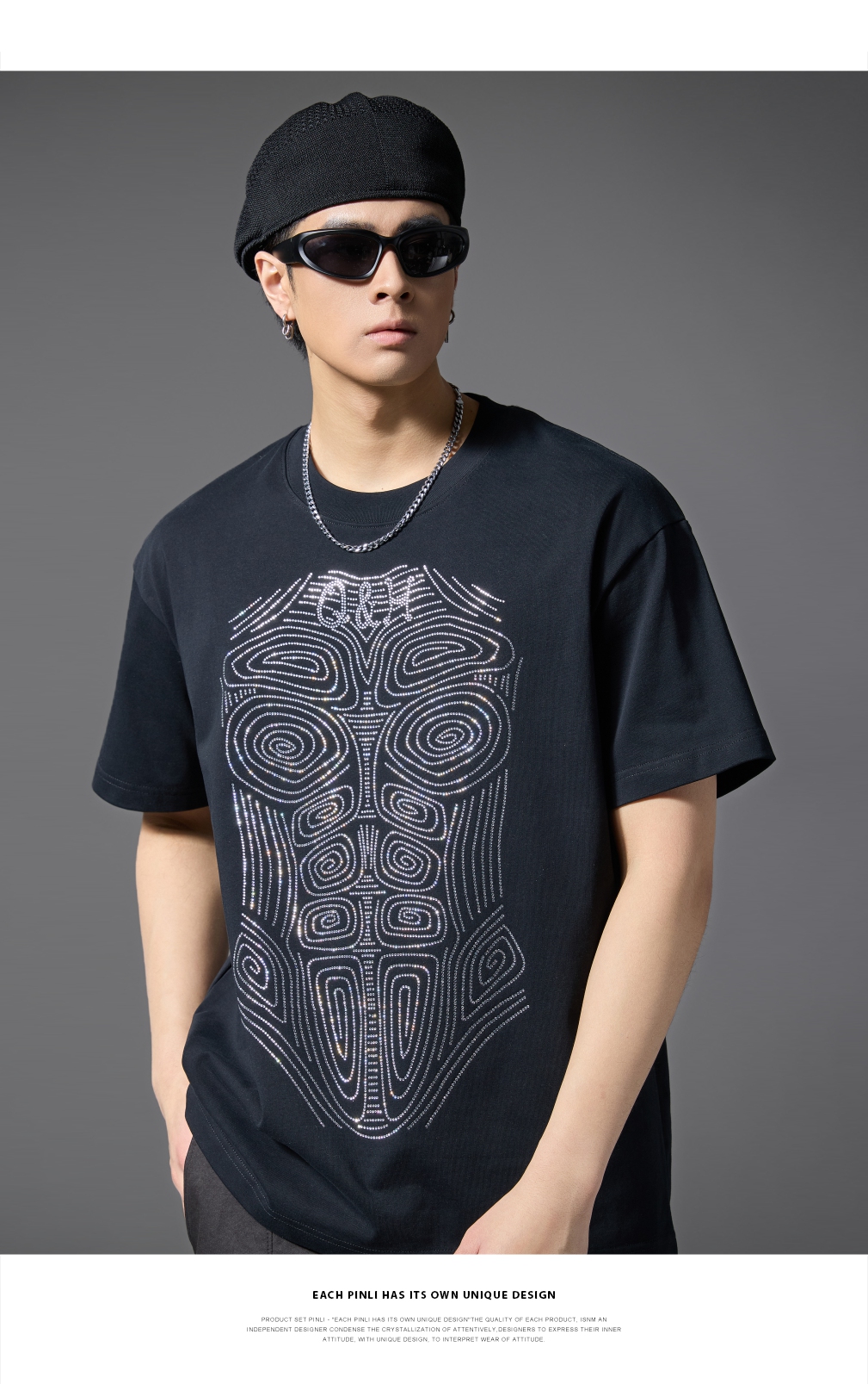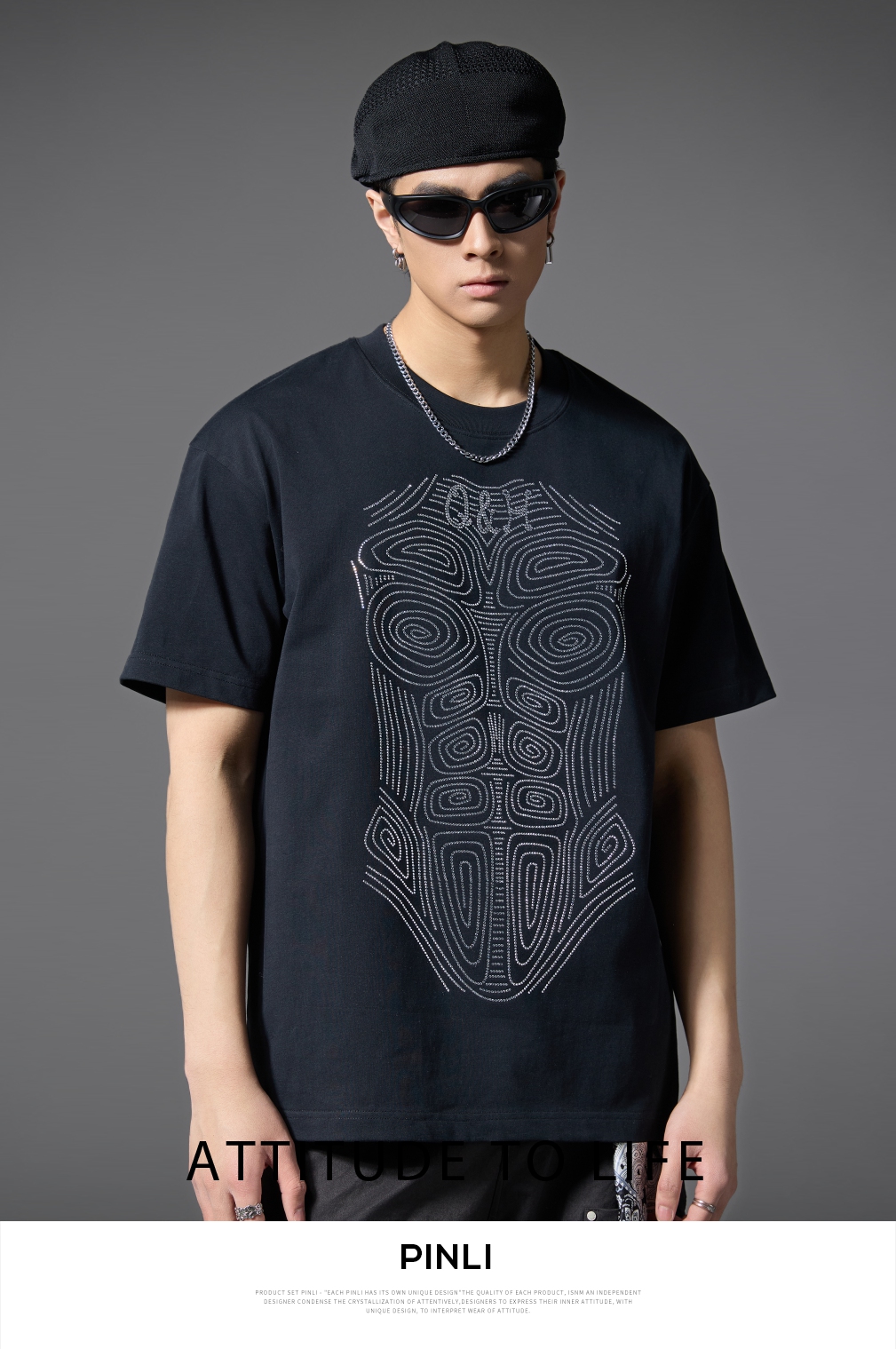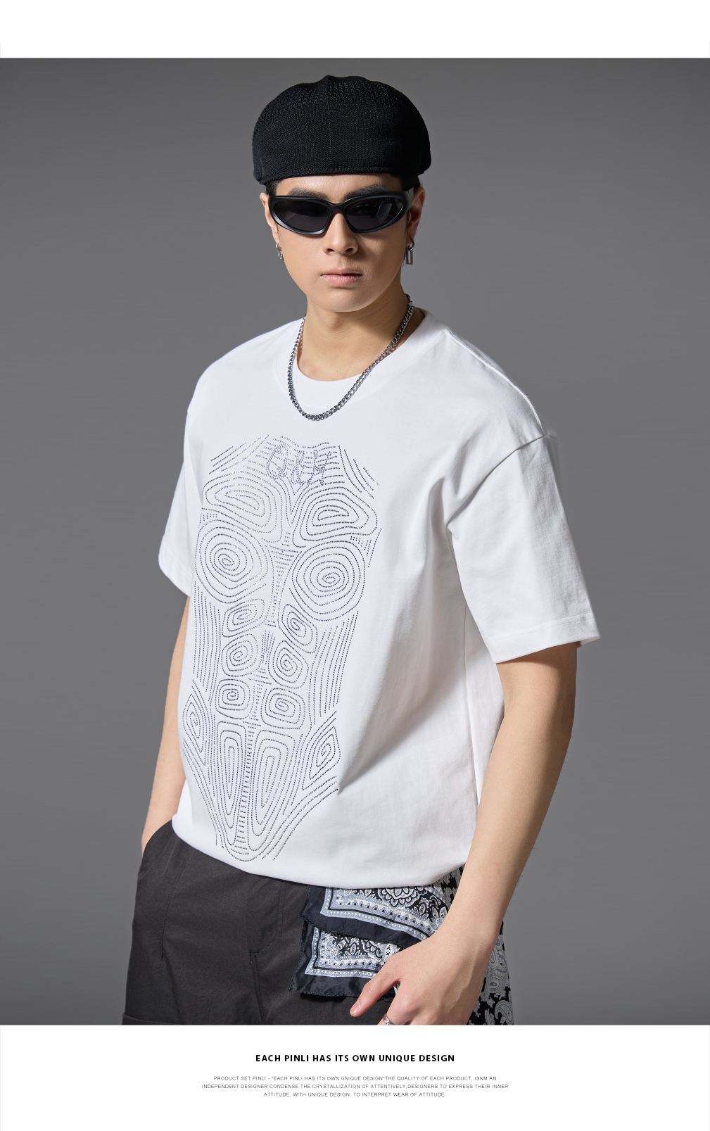 PINLI品立2025春夏新款时尚烫钻短袖T恤男士纯棉潮牌休闲百搭上衣BG252111012