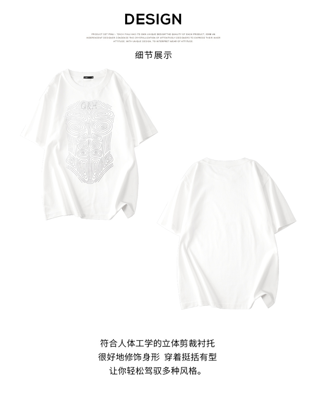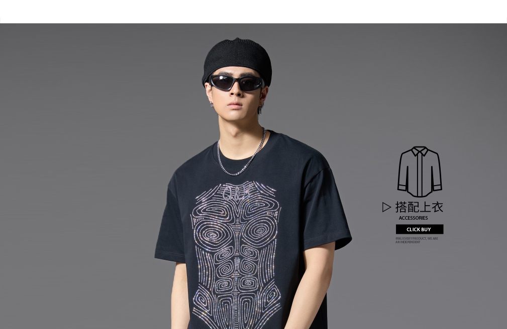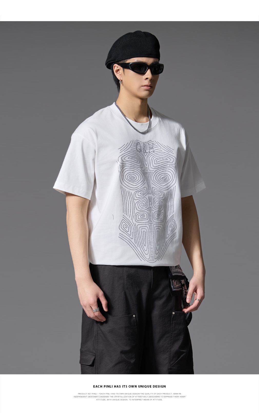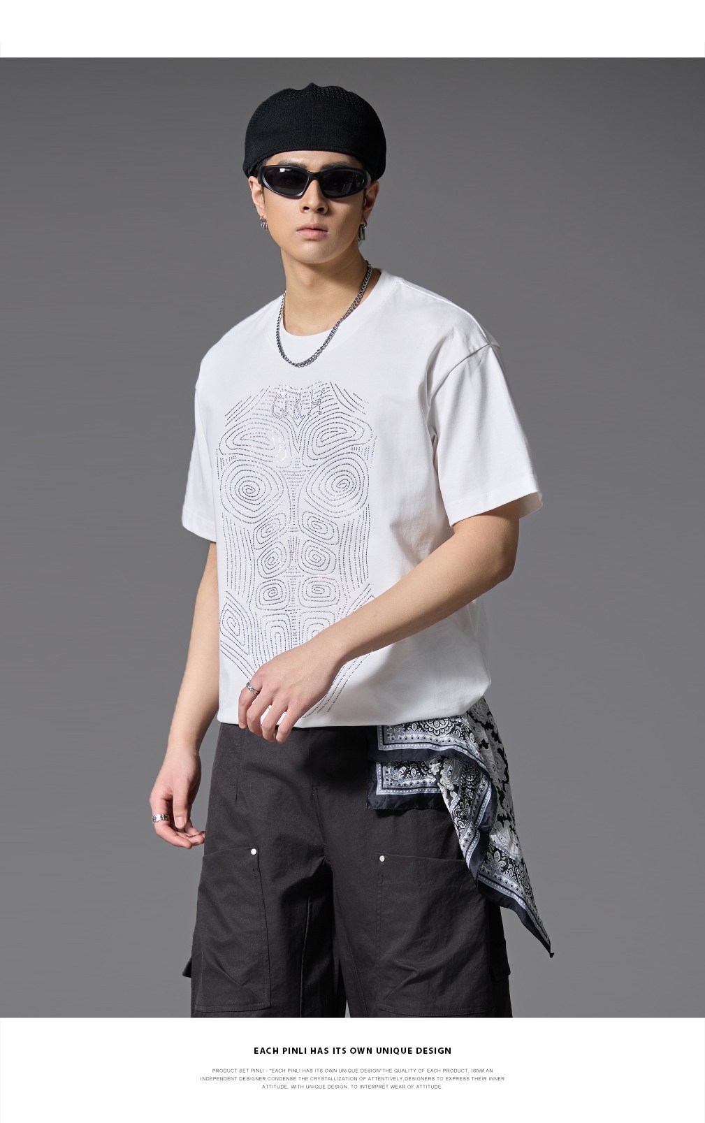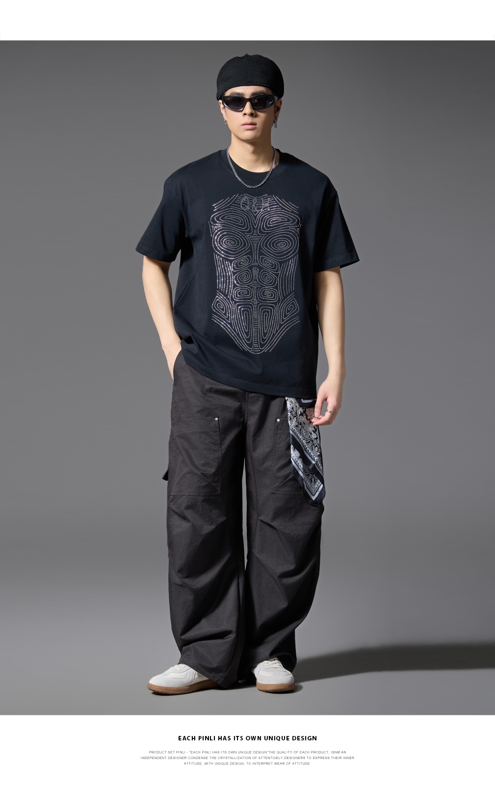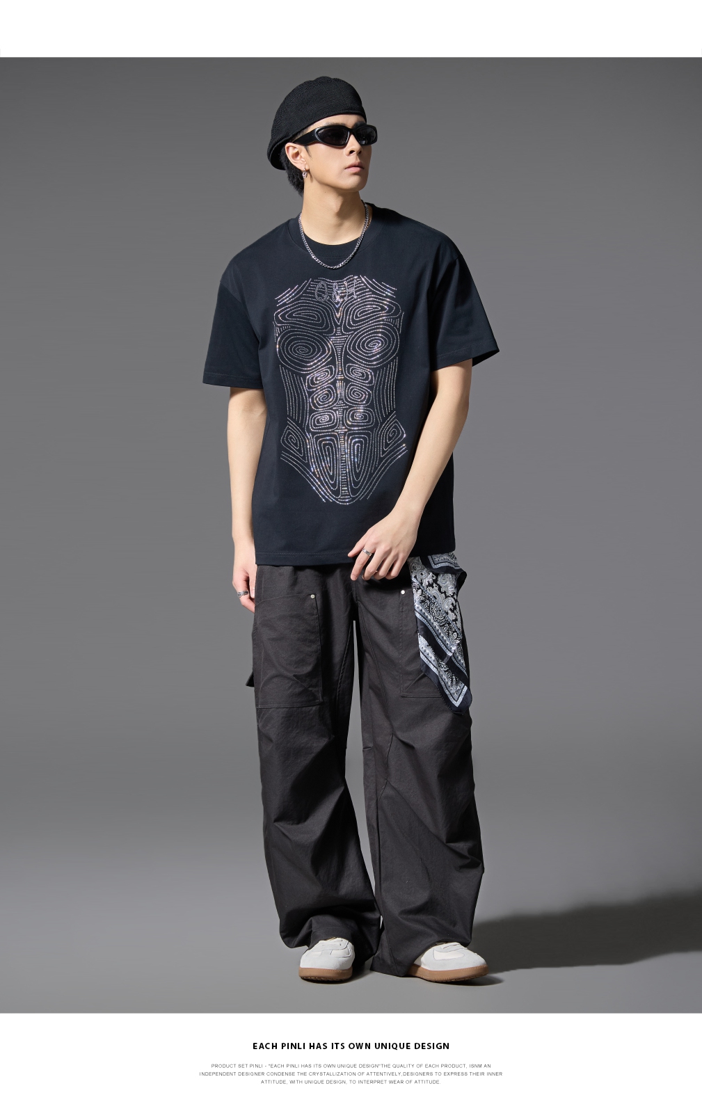 PINLI品立2025春夏新款时尚烫钻短袖T恤男士纯棉潮牌休闲百搭上衣BG252111012
