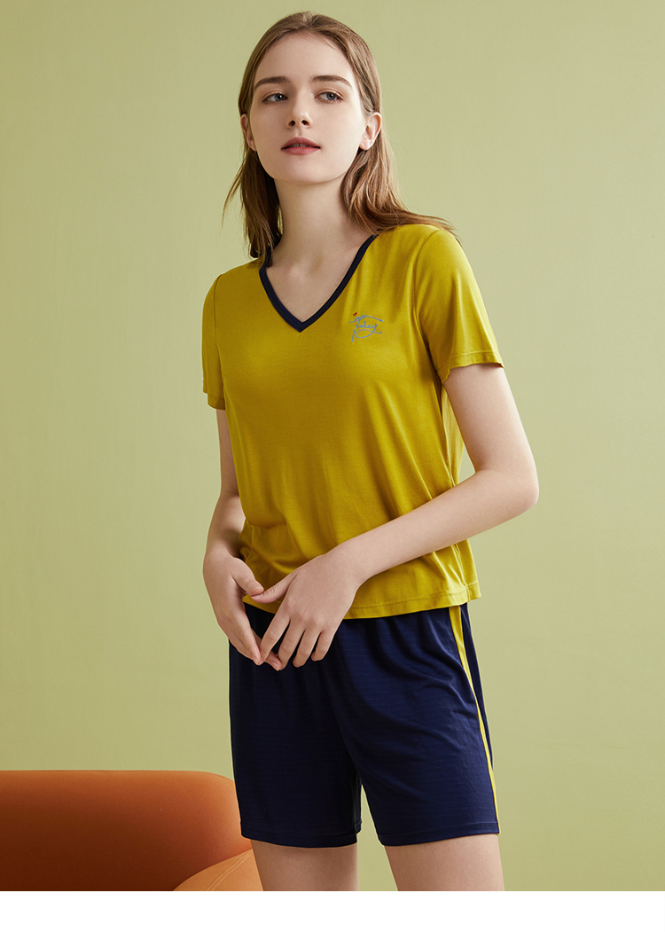 金三塔新品女绢丝V领撞色短袖可外穿衣裤套 YZFBA401