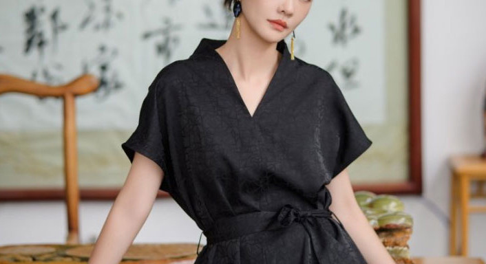上身舒适自在,巧妙融入了古时候交领的设计元素,形成了如今V领的剪裁,微微露出锁骨,更显脖颈线条优美修长。
