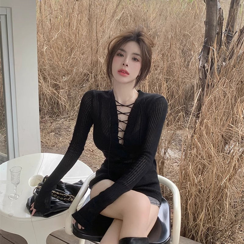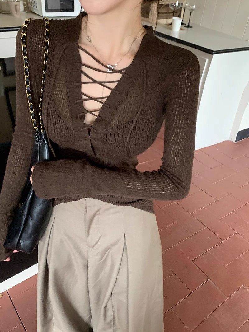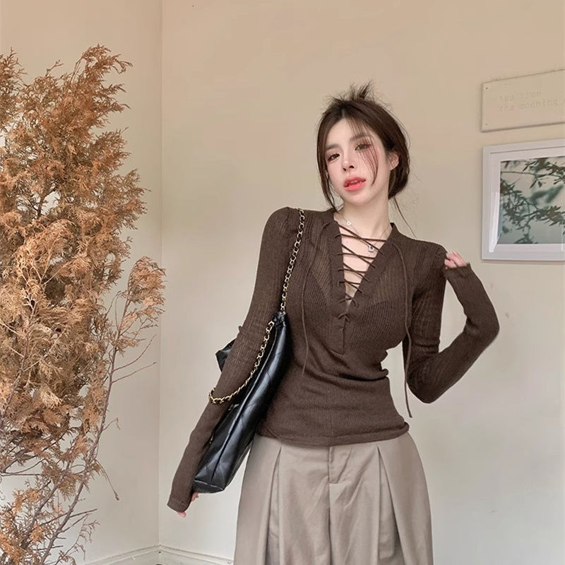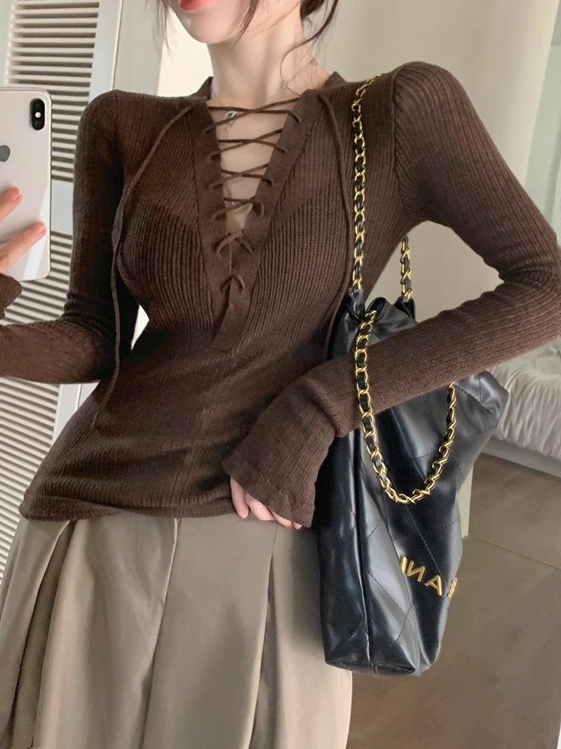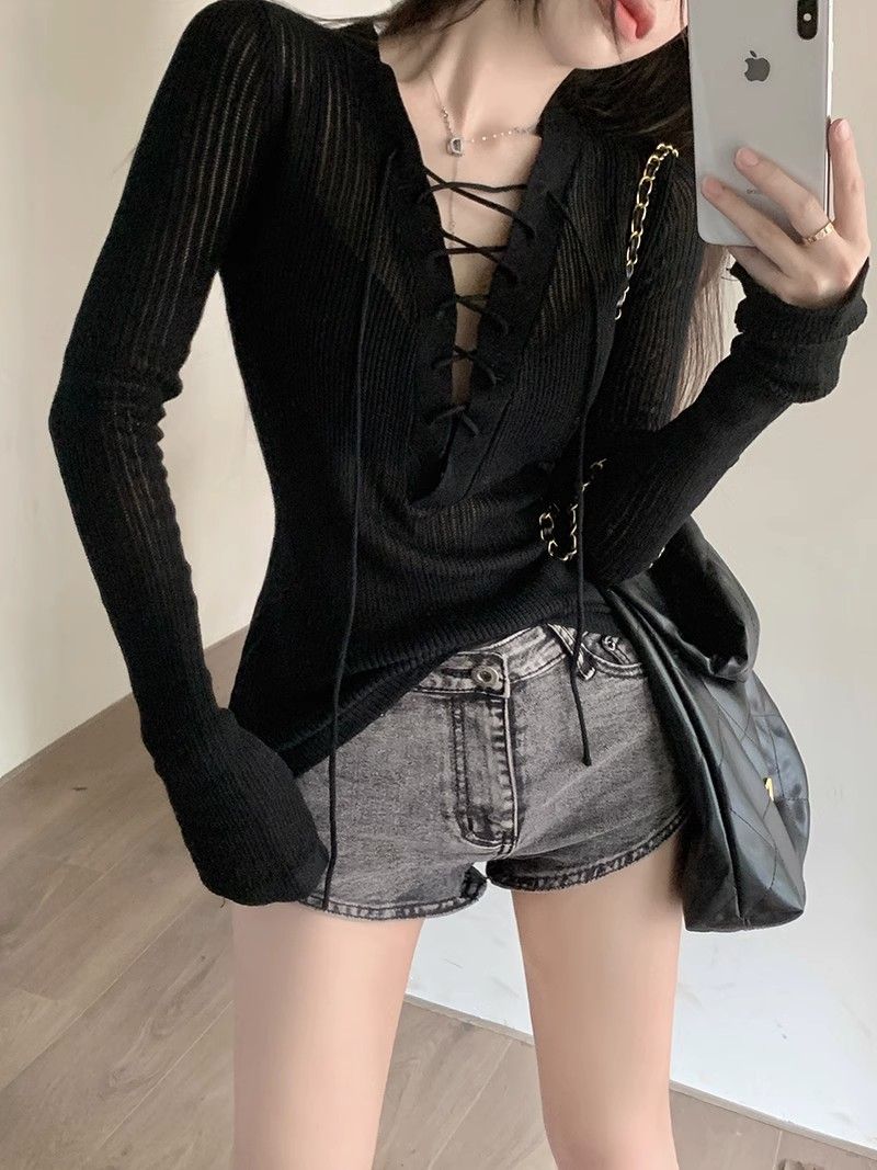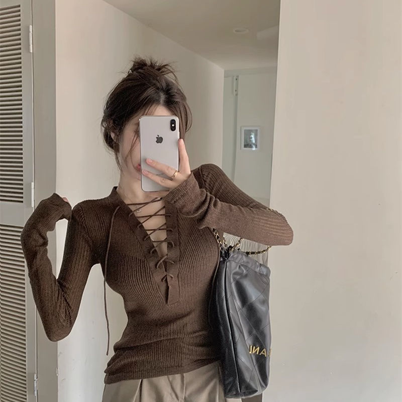【超美❗️深V领系带长袖针织衫】性感显瘦,时尚活力,百搭自然,辣妹女春季新款内搭设计感高腰修身百搭上衣