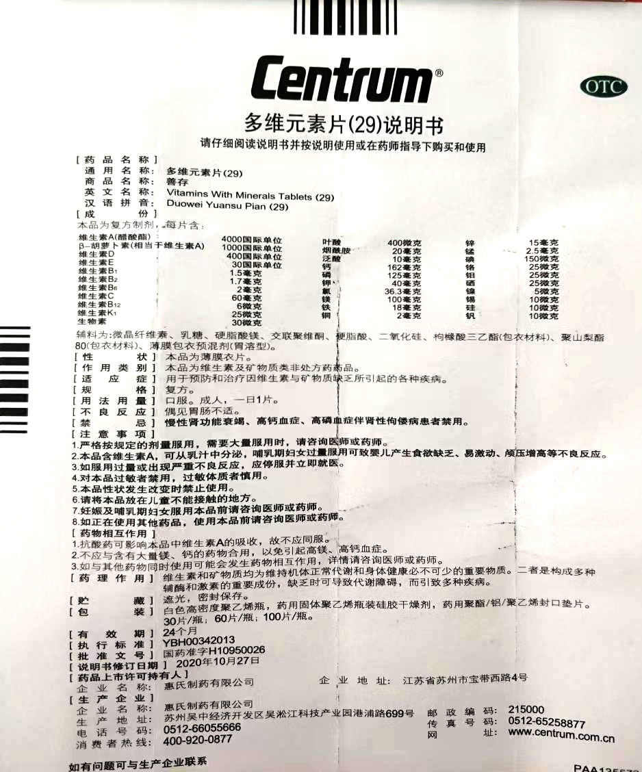 【成份】 本品每片主要成份及含量为:维生素A 5000国际单位 叶酸 400微克 锌 15毫克维生素D 400国际单位 烟酰胺 20毫克 锰 2.5毫克维生素E 30国际单位 泛酸 10毫克 碘 150微克维生素B1 1.5毫克 钙 162毫克 铬 25微克维生素B2 1.7毫克 磷 125毫克 钼 25微克维生素Be 2毫克 钾 40毫克 硒 25微克维生索C 60毫克 氯 36.3毫克 镍 5微克维生素B12 6微克 镁 100毫克 锡 10微克维生素K1 25微克 铁 18毫克 硅 10微克生物素 30微克 铜 2毫克 钒 10微克辅料为:傲晶纤维素、乳糖、硬脂酸镁、交联毗咯烷酮、硬脂酸、二氧化硅、柠檬酸三乙酯(包衣材料)、吐温80(包衣材料)、桃红色色素(包衣材料)。