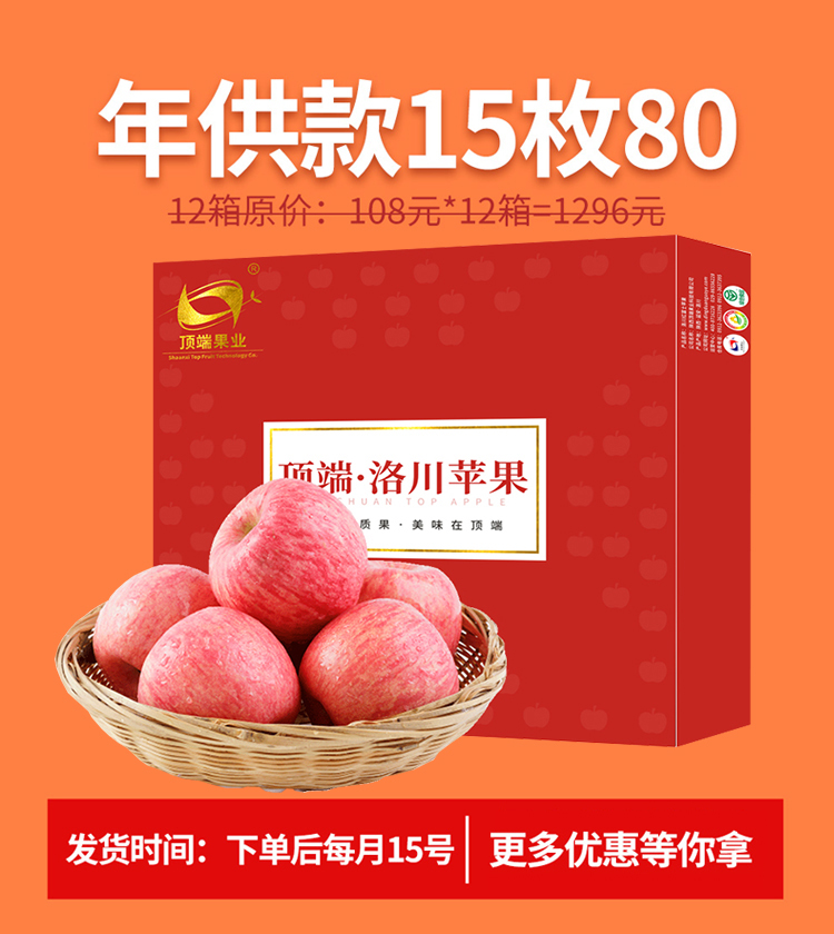 【年供款】 顶端果业正宗洛川红富士苹果15枚80mm中大果顶端礼盒全年供12箱