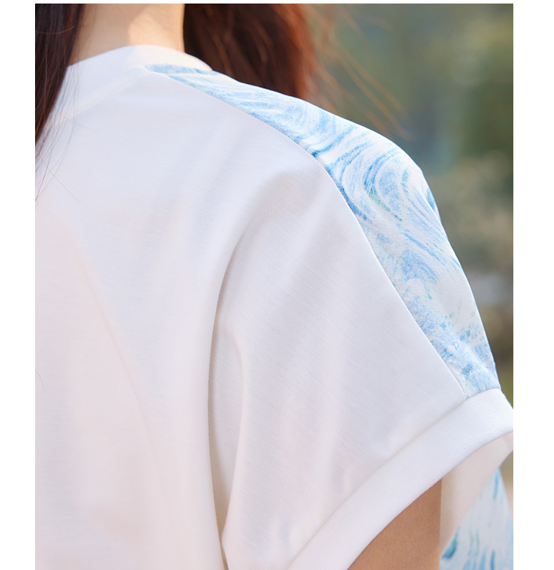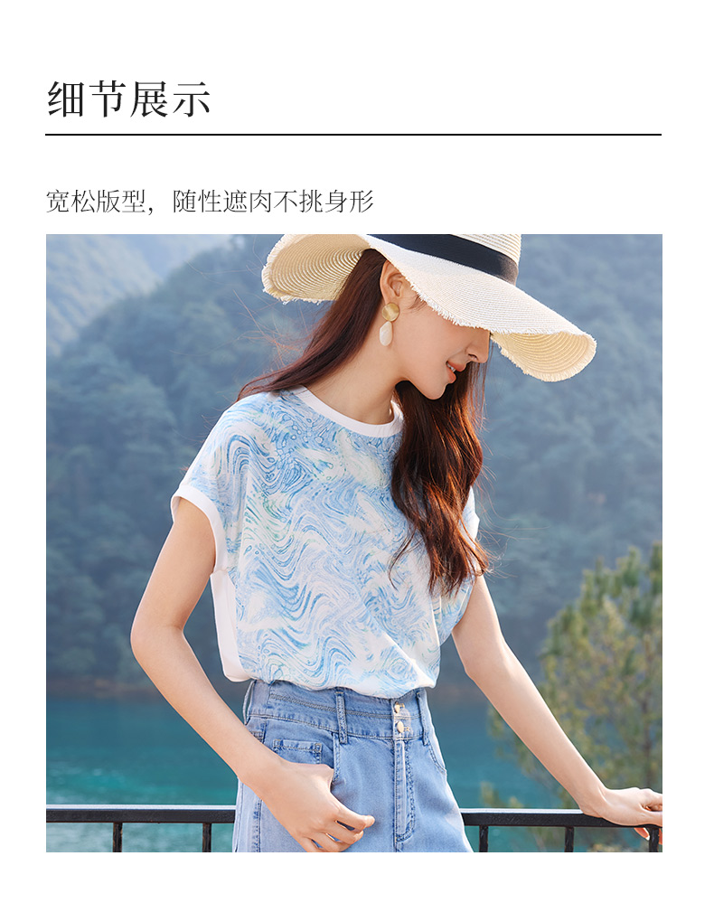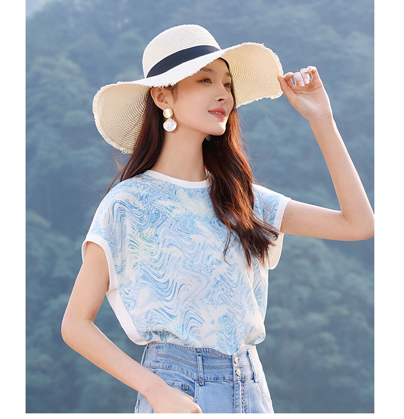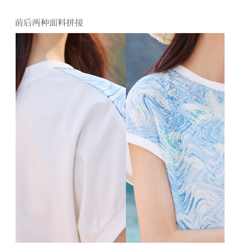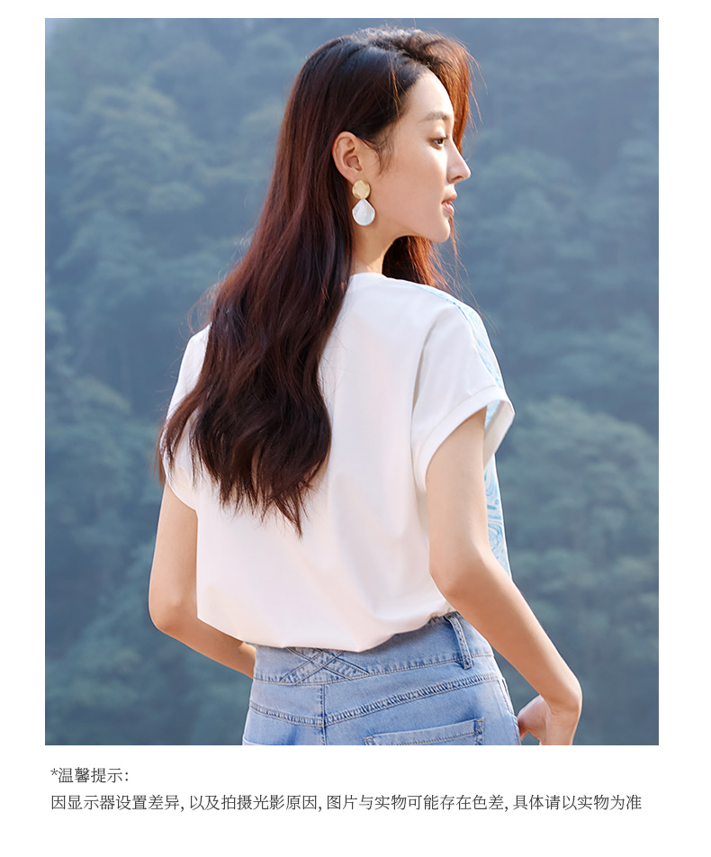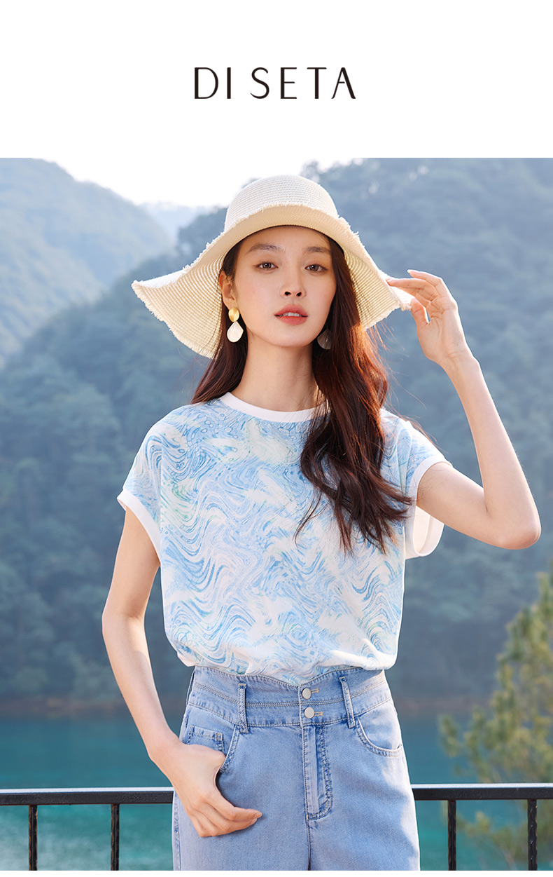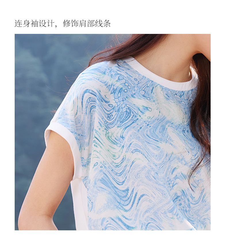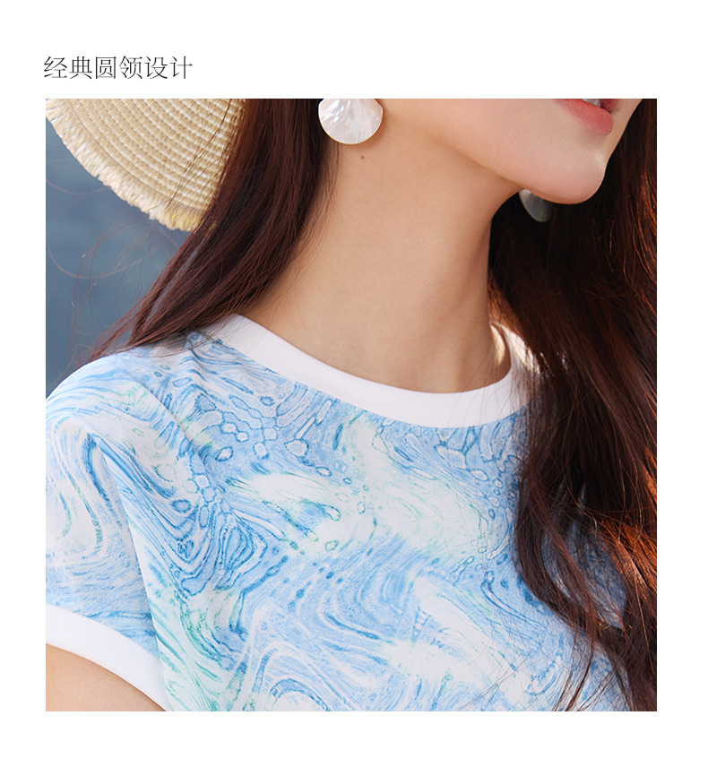 玳莎圆领印花真丝T恤女2025年夏季新款宽松拼接设计双绉短袖上衣 FB32110
