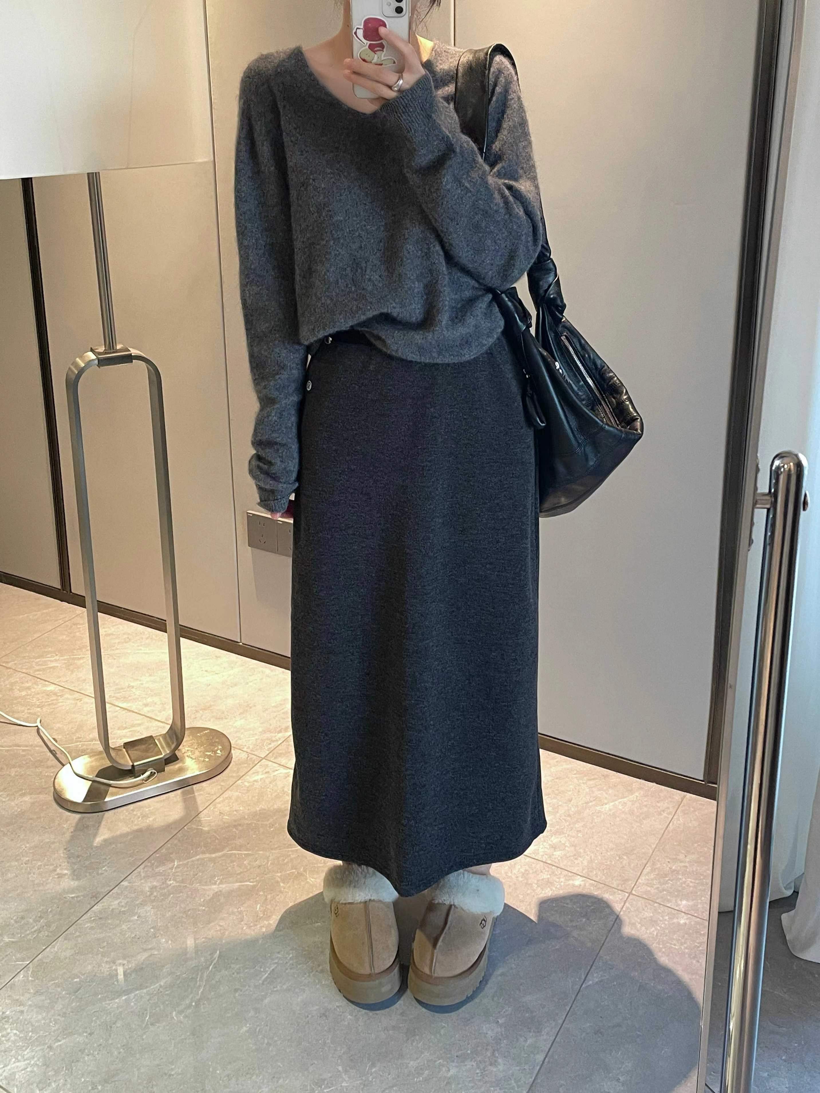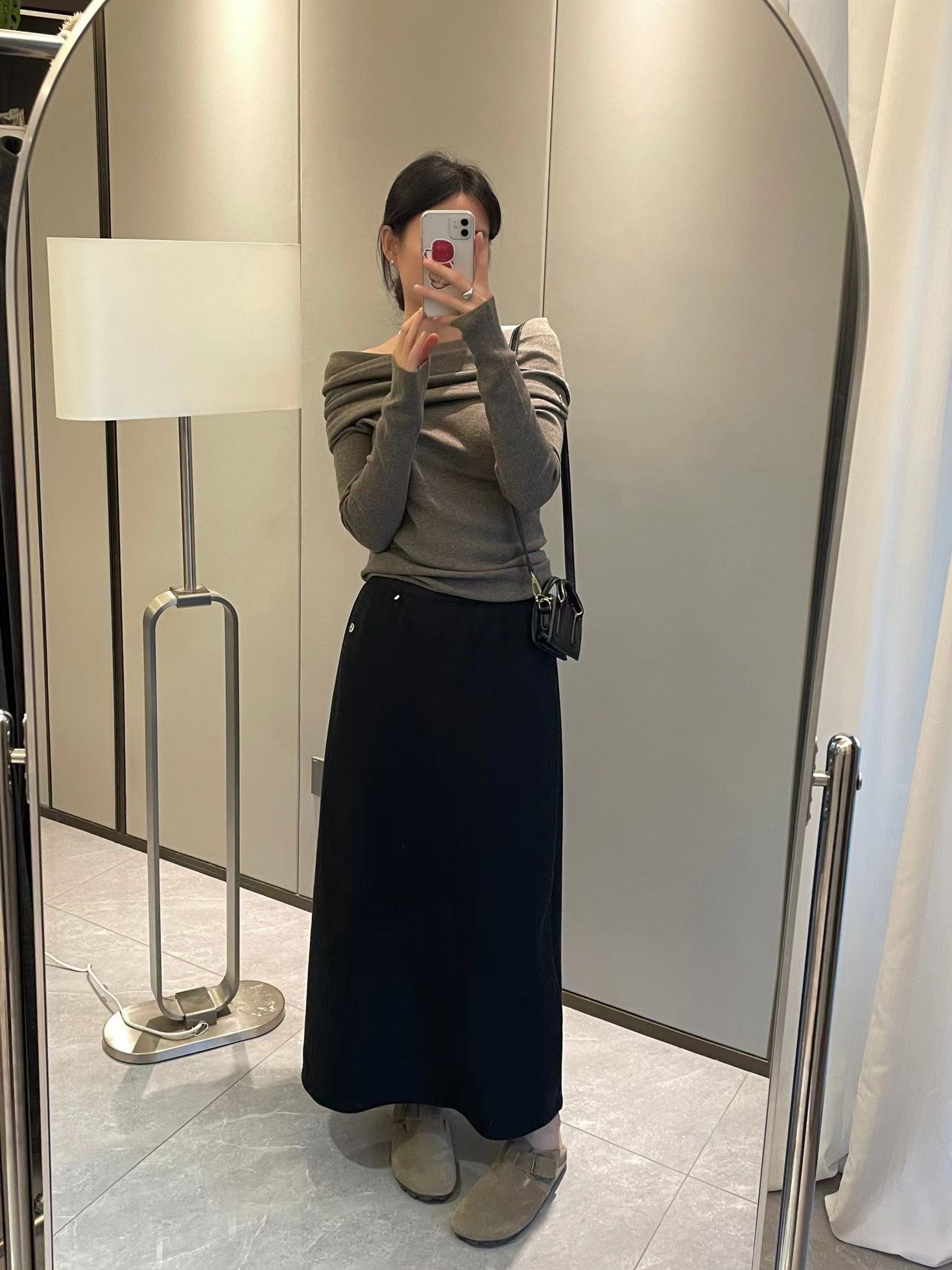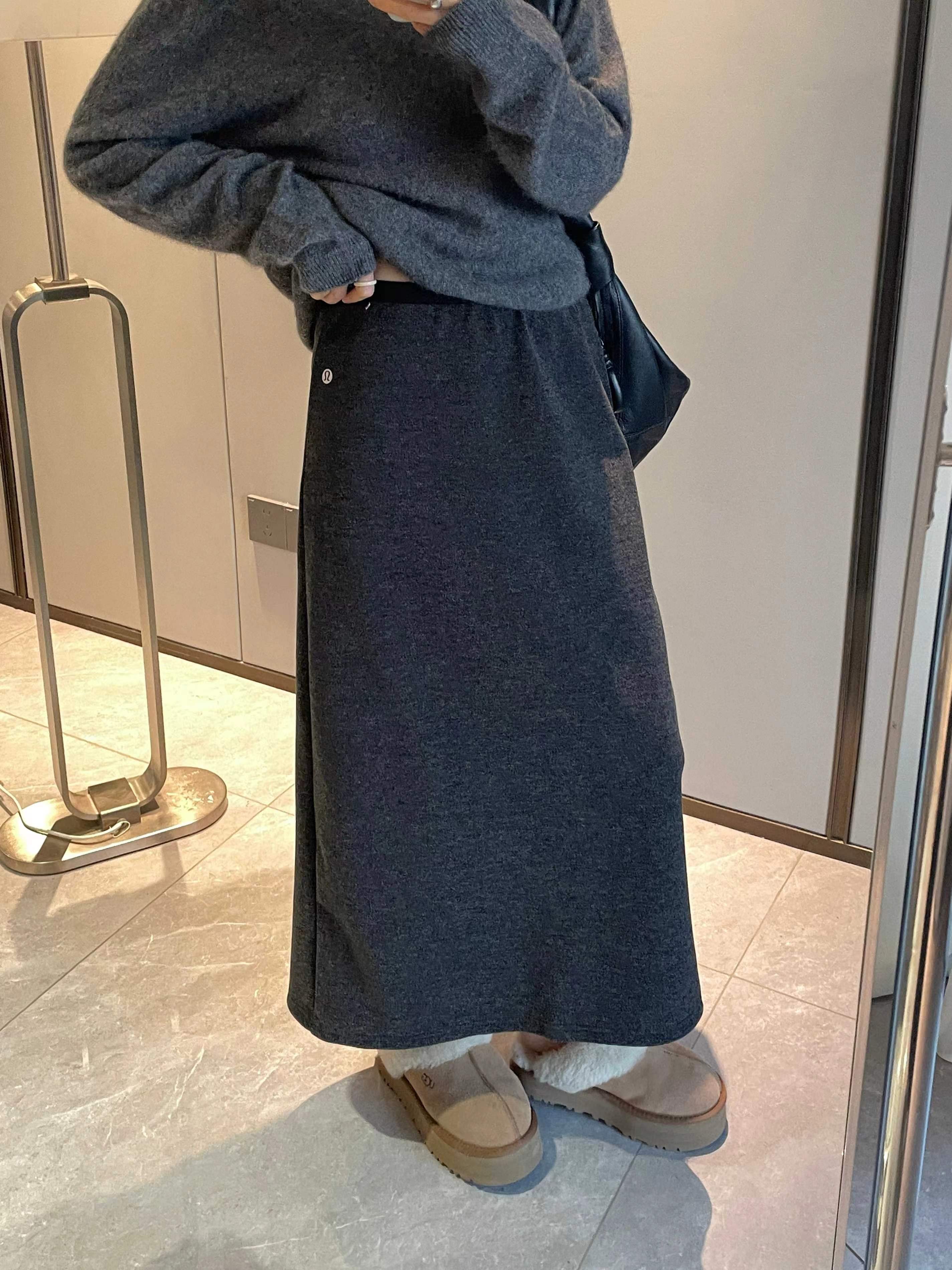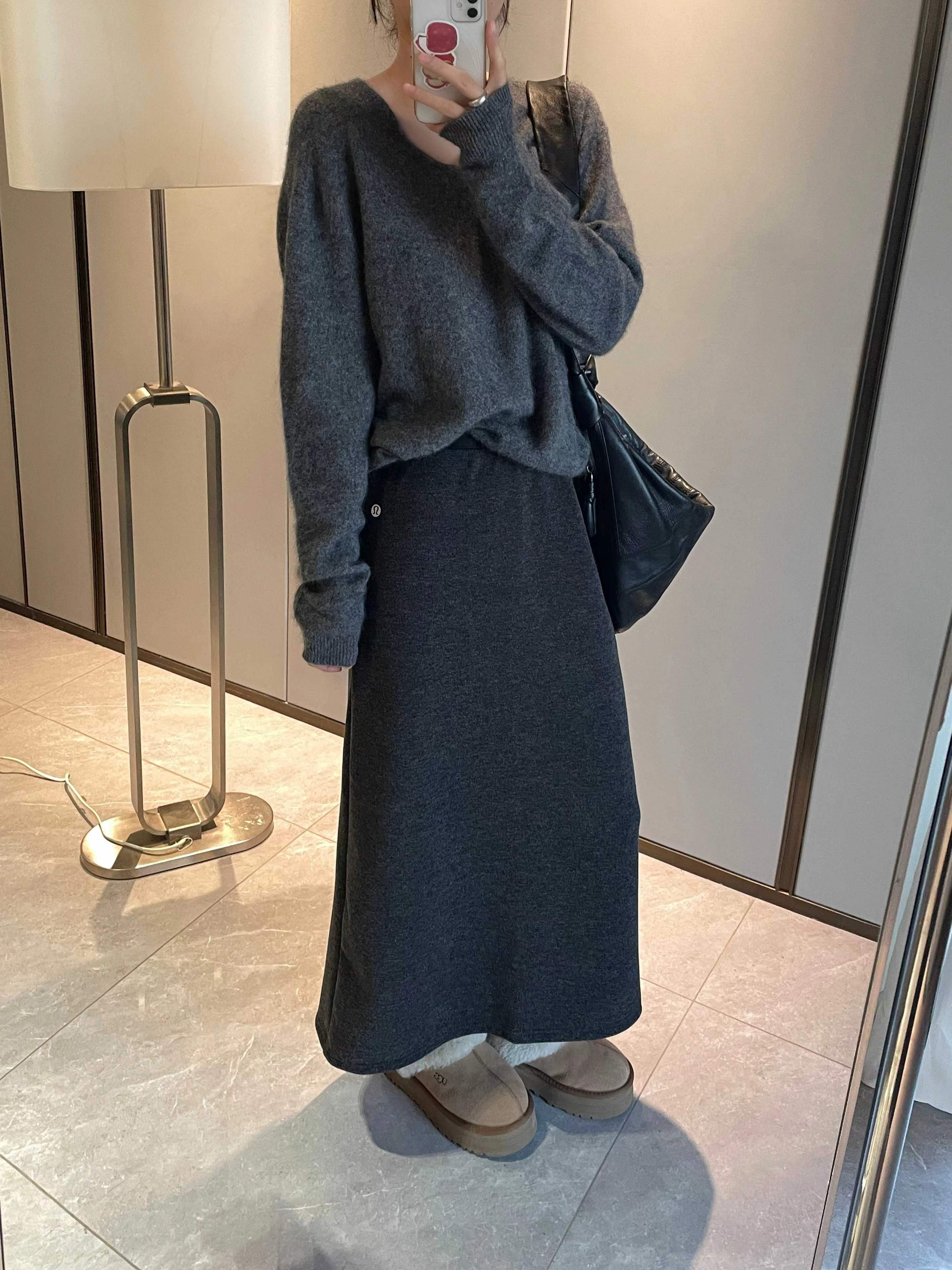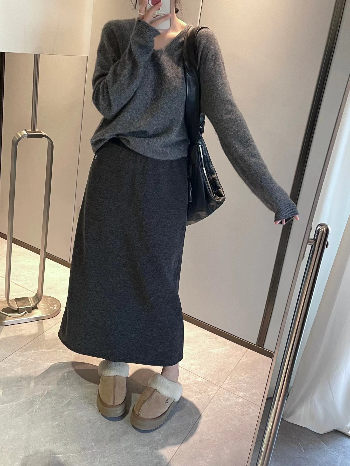 极简A版一体复合绒半身裙,整体风格是简约羔级的休闲质感,看起来很适合秋冬搭配。版型是高腰设计,搭配一颗jing致的小金属纽扣作为装饰,既提升了细节感,也能自然地贴合腰线,修饰身材比例。裙型是直筒/微修身的中长裙,长度大概到小腿位置,线条简洁利落,不会过于紧绷,走动时会有自然的垂坠感,能很好地修饰下半身线条。面料看起来是偏厚实的针织/混纺材质,表面有细腻的纹理感,摸起来应该是柔软又有一定挺括度的,保暖性不错,适合秋冬搭配毛衣穿。细节上有侧边的小标装饰,整体简约不单调,和同色系的灰色毛绒毛衣搭配,显得温柔又有氛围感。