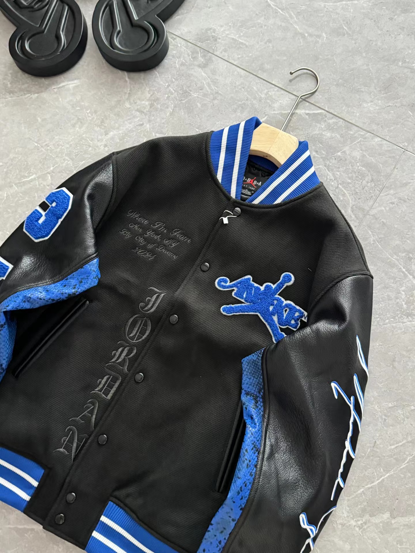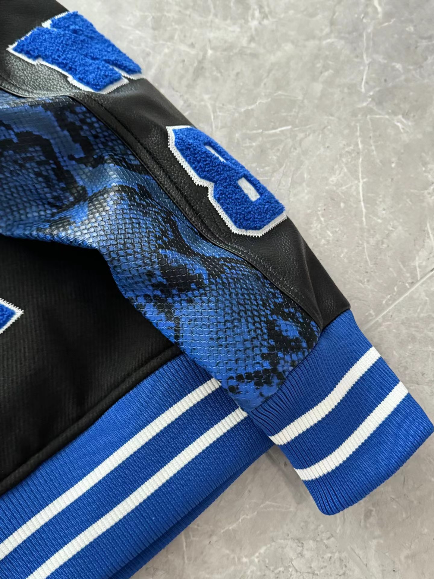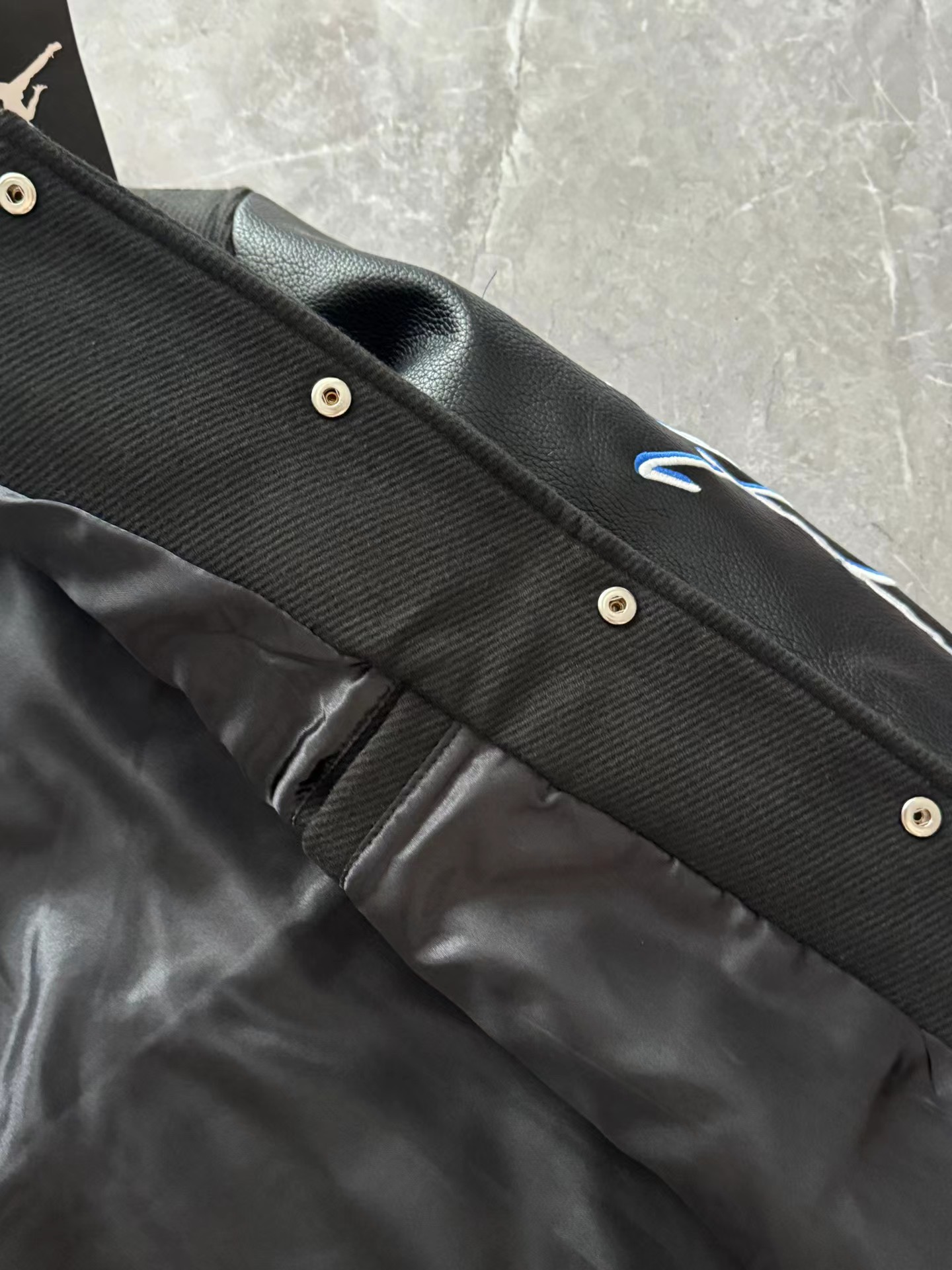联名款 飞人棒球单夹克外套男女同款!定制原版一致斜纹毛尼面料 袖子上皮选用优质仿真皮做复合工艺质感更硬挺扎实 衣身植绒刺绣百灵达绣花机制造 精密美观 大厂出品 质量很棒!这件蛇纹夹克直接封神!精典黑底蓝条纹上身气场全开,棒球领+单排扣设计复古又潮酷,走在路上回头率200%!面料挺括有型,袖口螺纹收口显利落~宽松版型不挑身材,搭配卫衣+工装裤,再踩双球鞋,秒变街头潮人!
