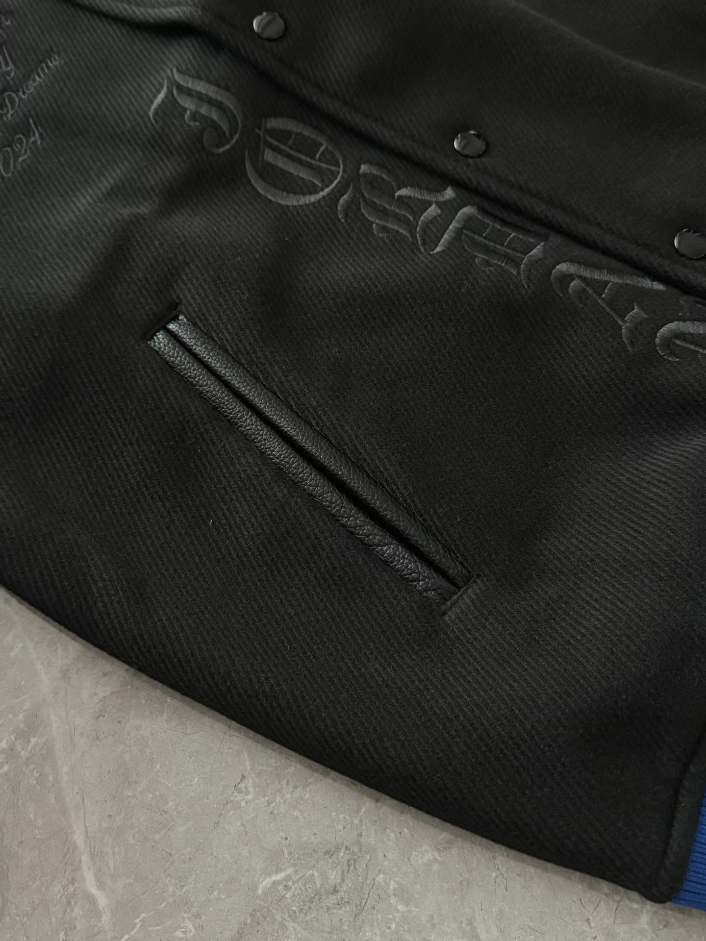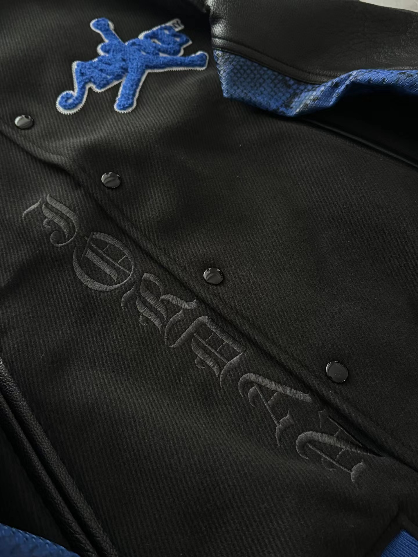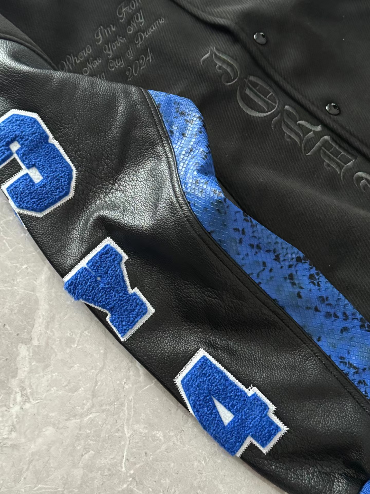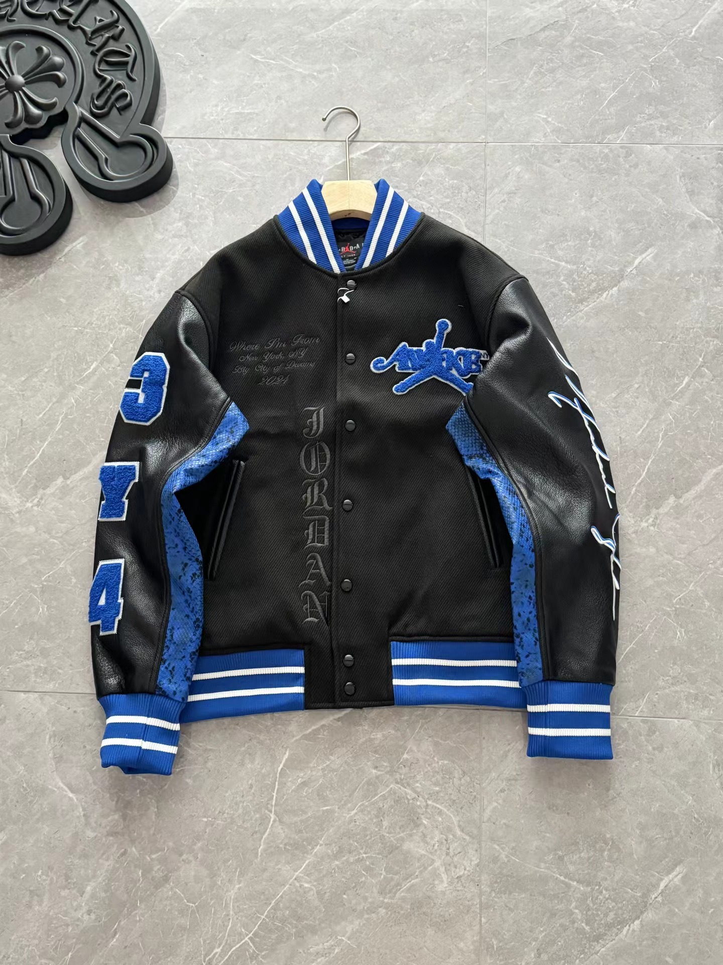 联名款 飞人棒球单夹克外套男女同款!定制原版一致斜纹毛尼面料 袖子上皮选用优质仿真皮做复合工艺质感更硬挺扎实 衣身植绒刺绣百灵达绣花机制造 精密美观 大厂出品 质量很棒!这件蛇纹夹克直接封神!精典黑底蓝条纹上身气场全开,棒球领+单排扣设计复古又潮酷,走在路上回头率200%!面料挺括有型,袖口螺纹收口显利落~宽松版型不挑身材,搭配卫衣+工装裤,再踩双球鞋,秒变街头潮人!