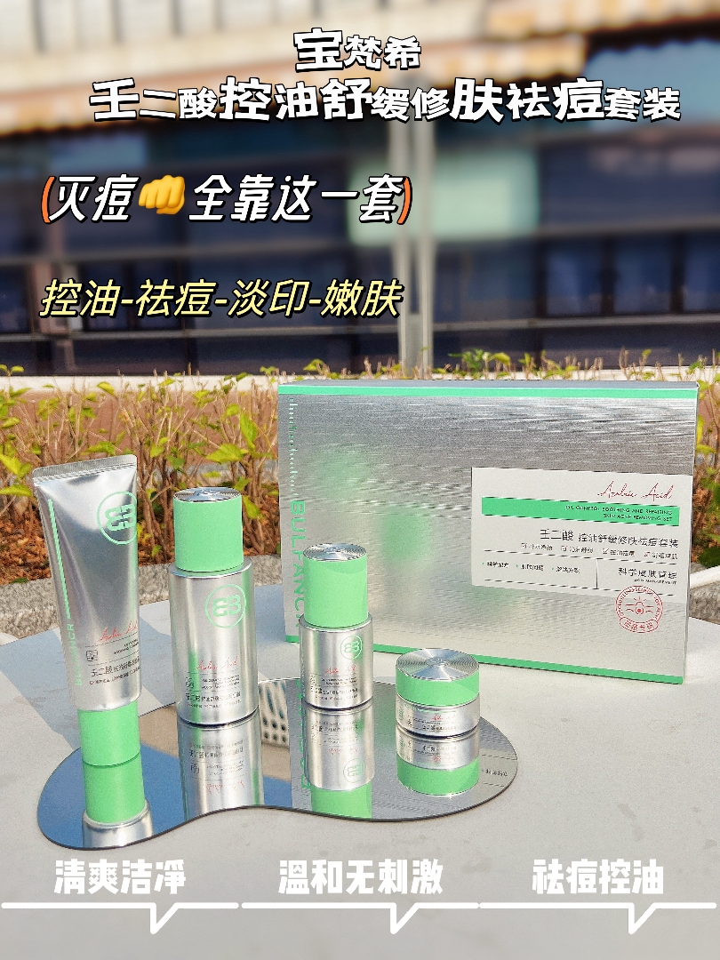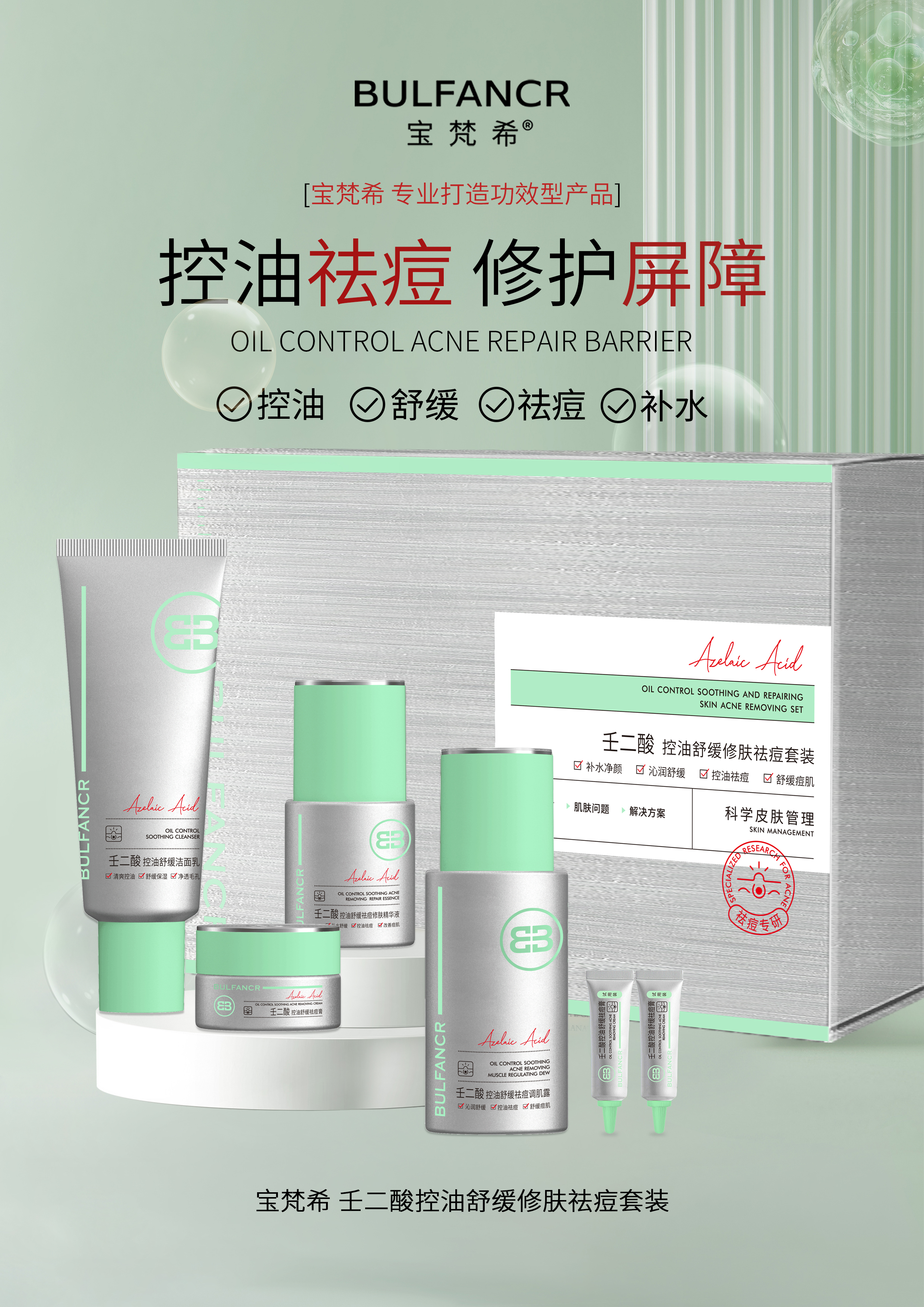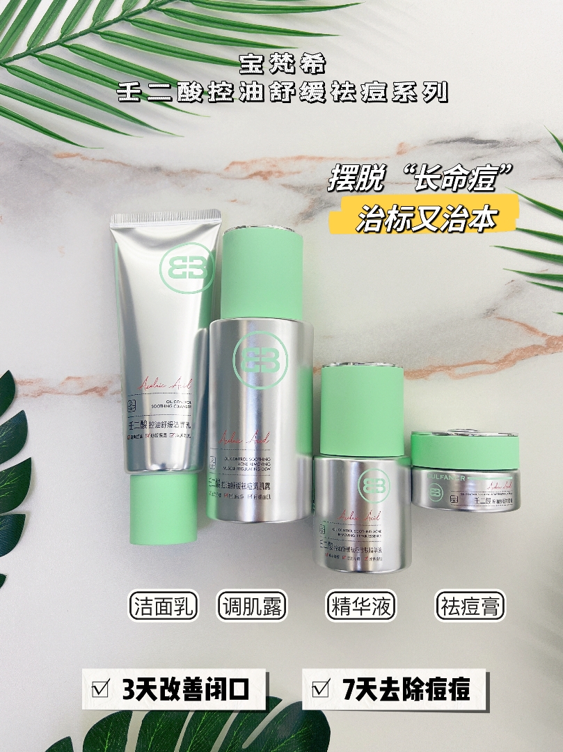 宝梵希-壬二酸控油舒缓修肤祛痘4件套 面部家居洁面乳120g,调肌露100毫升,精华液30毫升,祛痘膏15g