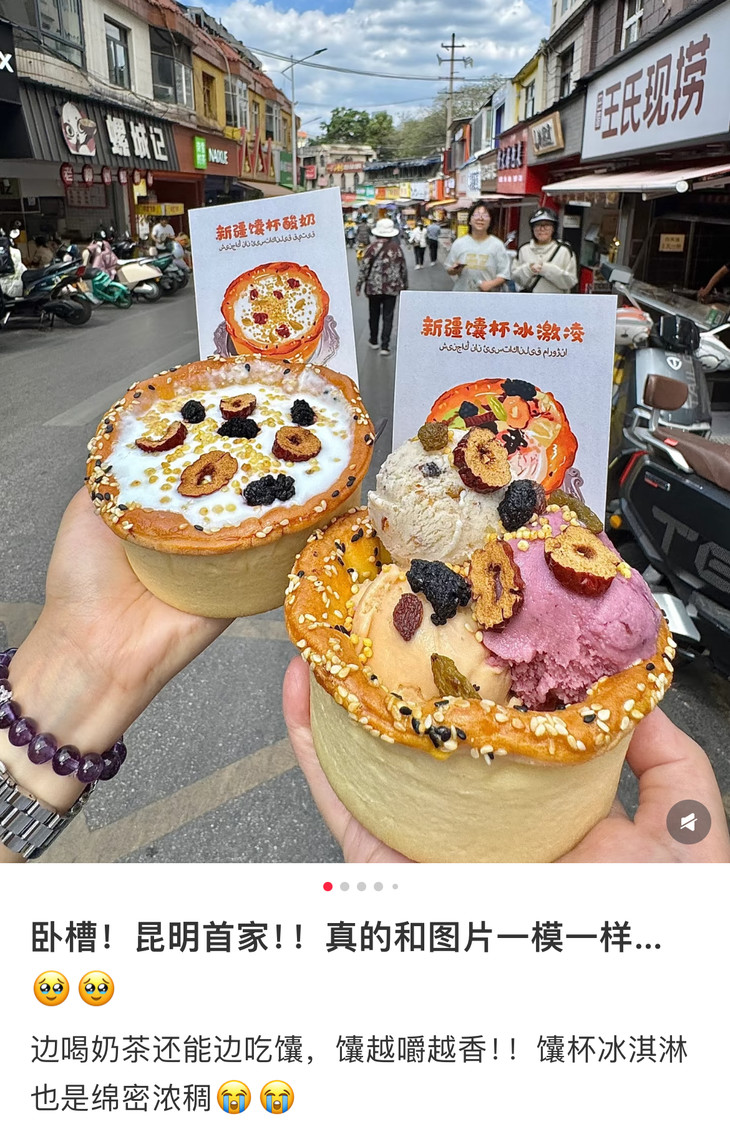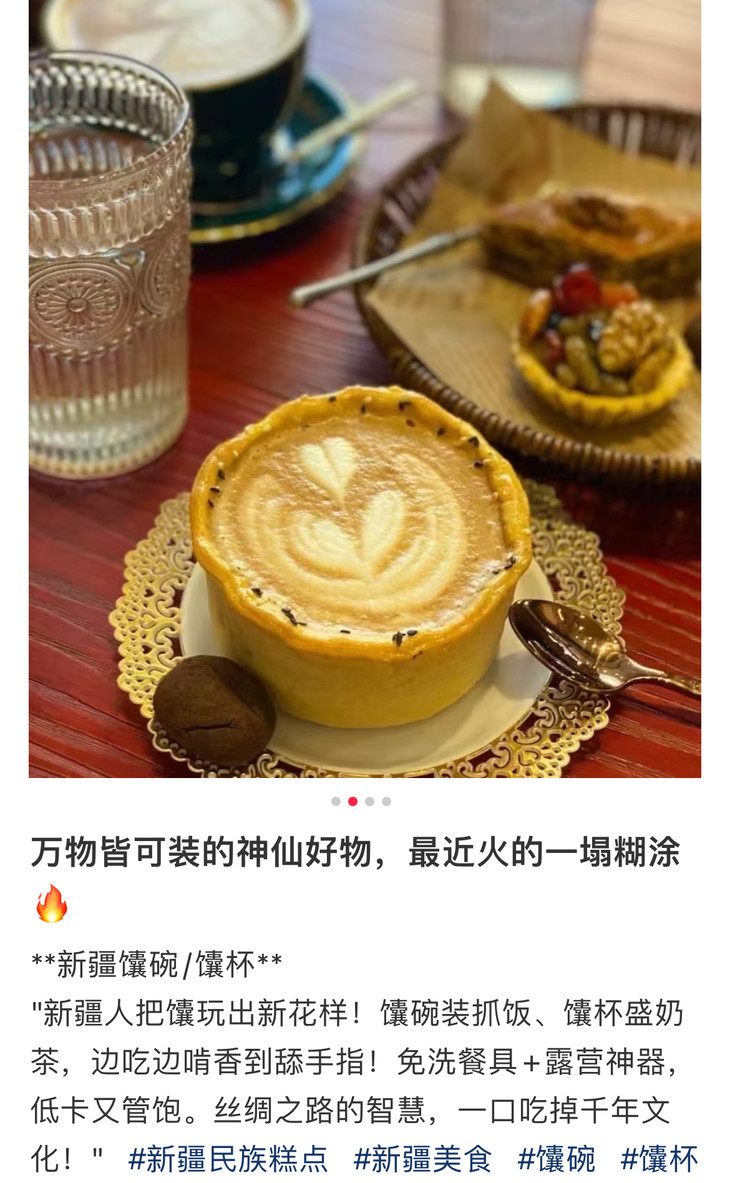 积密的馕碗来咯,真的是新疆特色,太有意思了!可以装各种,咖啡、奶茶、酸奶、冰淇淋,甚至是肉肉菜菜,吃完喝完,再把碗一起啃了,过瘾!