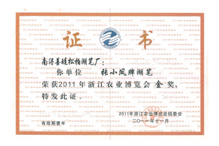 *“张小凤牌湖笔”,2011、2012、2013连续三年荣获浙江农业博览会金奖。
