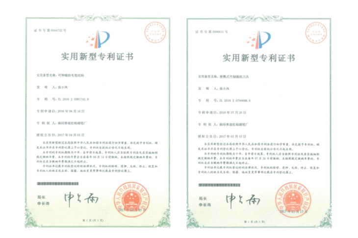 *《一种双笔头毛笔》《一种毛笔架结构》获得国家实用新型专利和发明专利