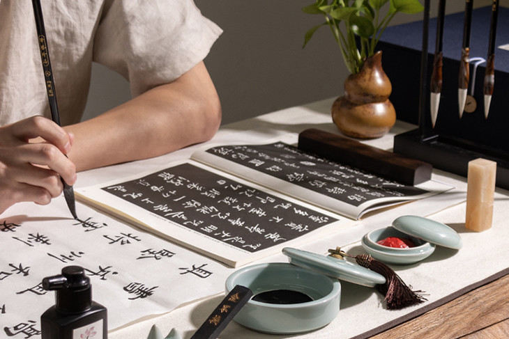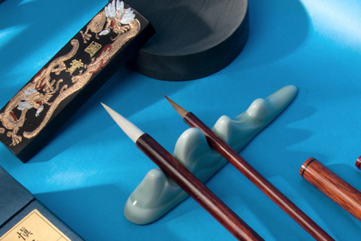 龙泉青瓷器物、昆仑石印章、金不换墨条等“文房清供”,林林总总置于案上,与主人挥毫相映衬,好似一副宋人风雅图。