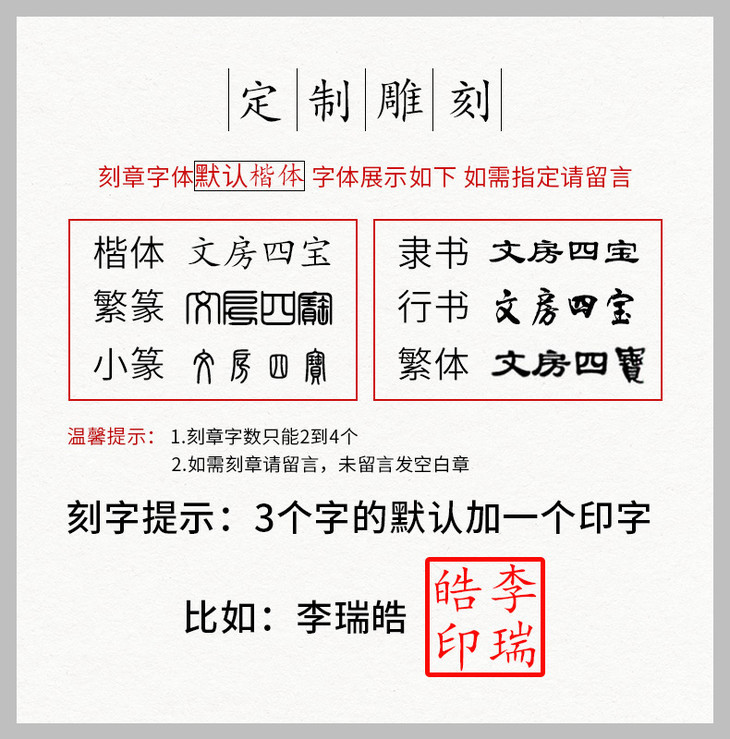 *下单备注 印文内容+字体 如“张三+行书”,3个字,即在多加个“印”字,如定制内容“张小小”,即定制效果为“张小小 印”