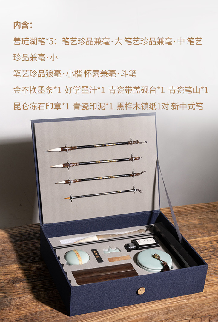 相比青青子衿礼盒,这套中含有大型毛笔——斗笔,更适合国画绘制,或练习潇洒如狂草等大字体。