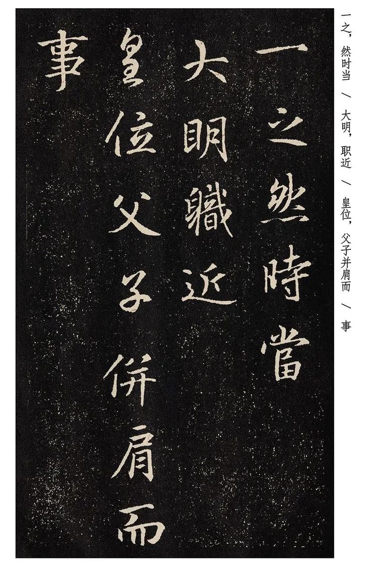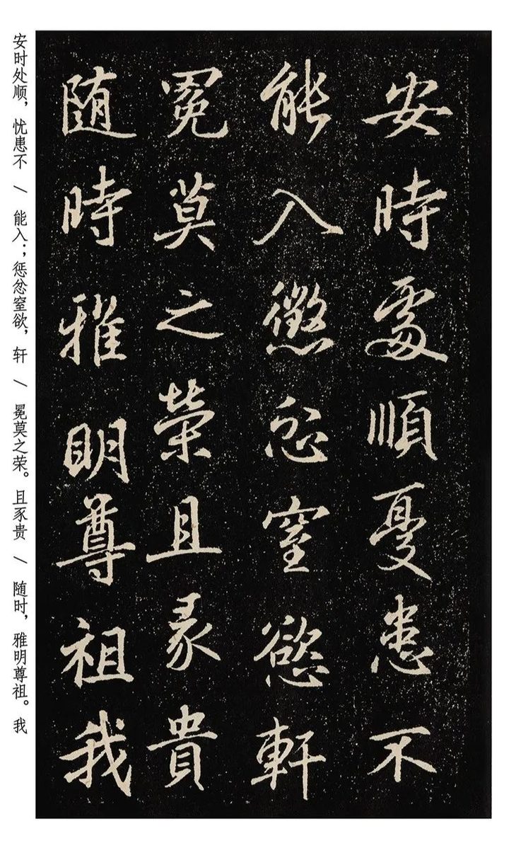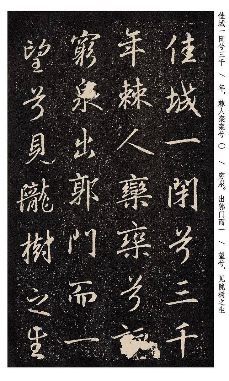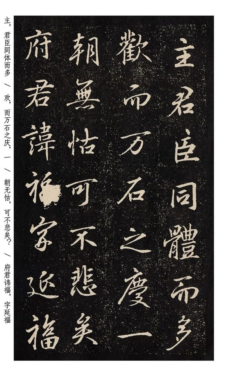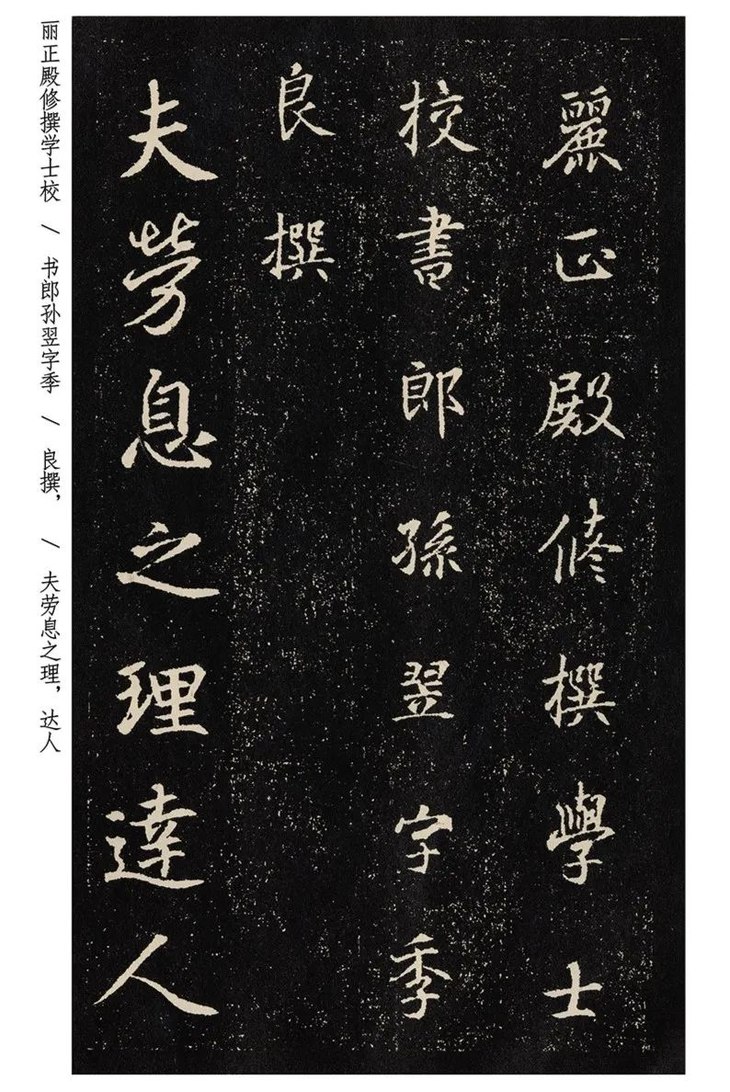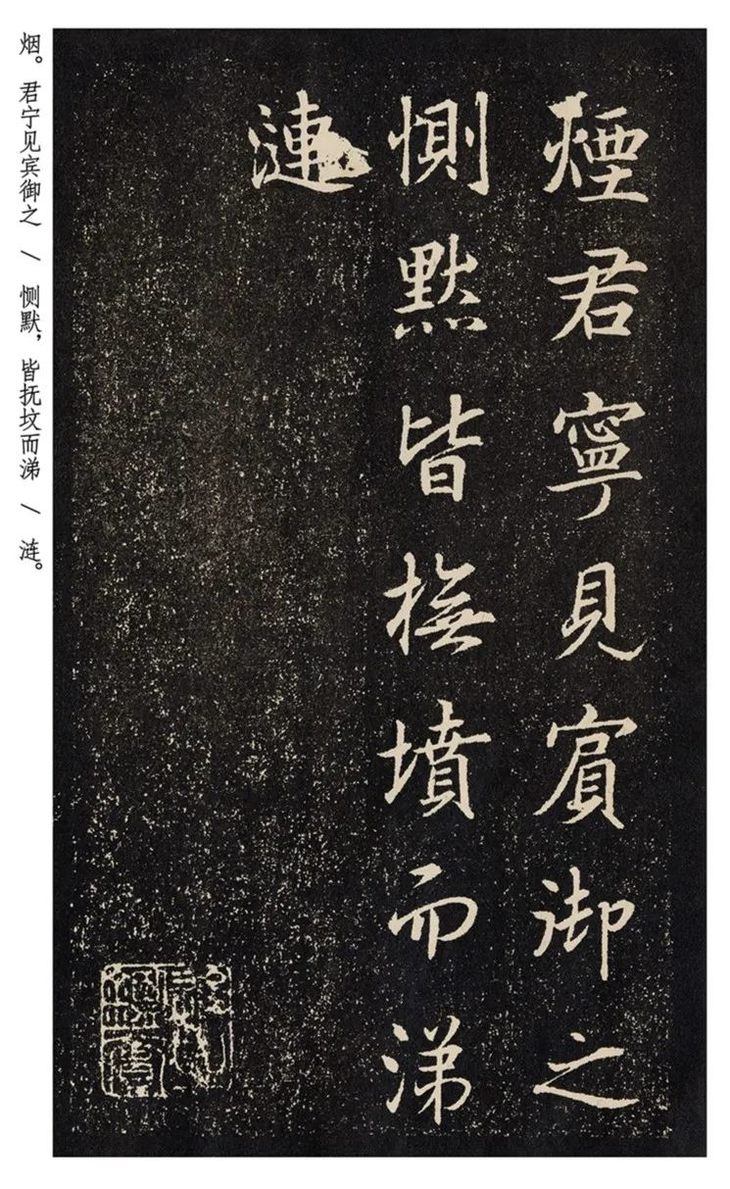 初拓本的清晰程度非市面版本所能比,几乎每一个字的字口都如新刻一般,里面凹凸的“石花”都如见原碑。举例来说,“劳”“庆”二字笔画之间的牵丝引带和轻重、粗细变化都纤毫毕现,可与墨迹相比,而字与字之间的虚连呼应也极为自然。