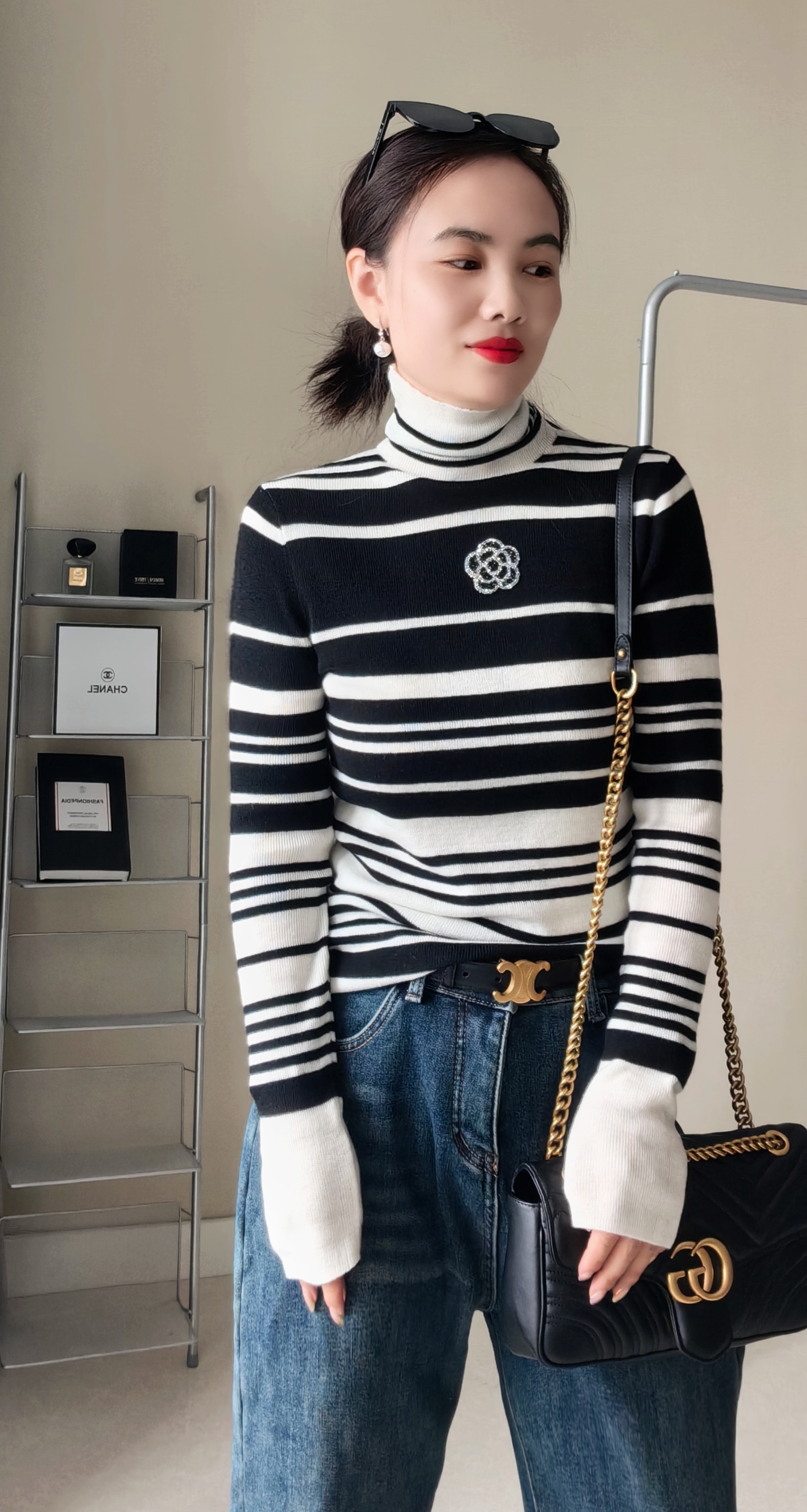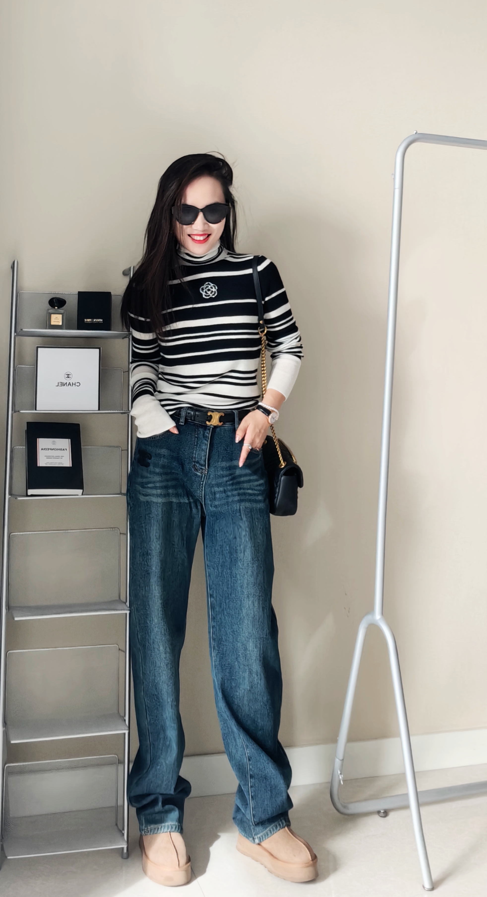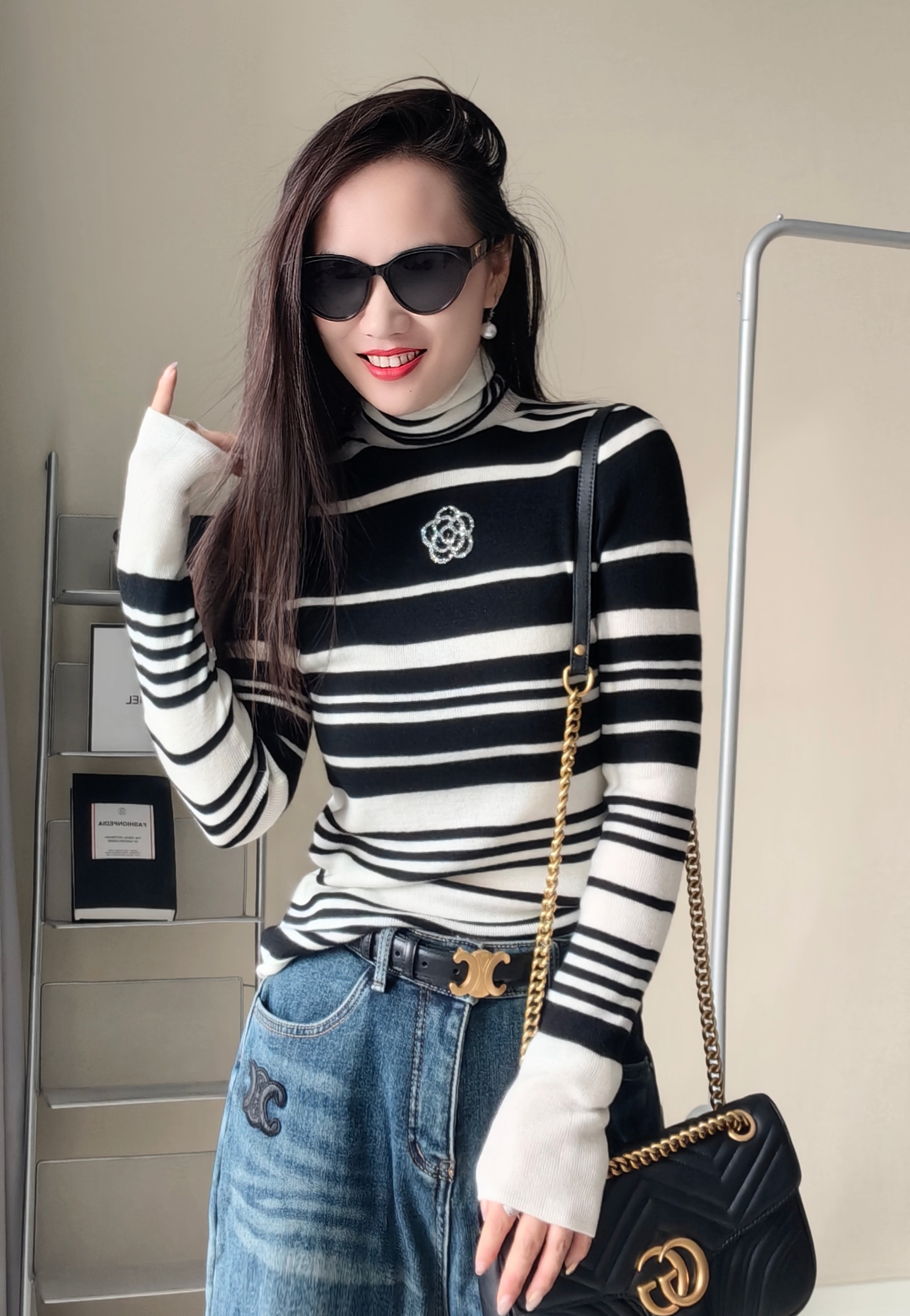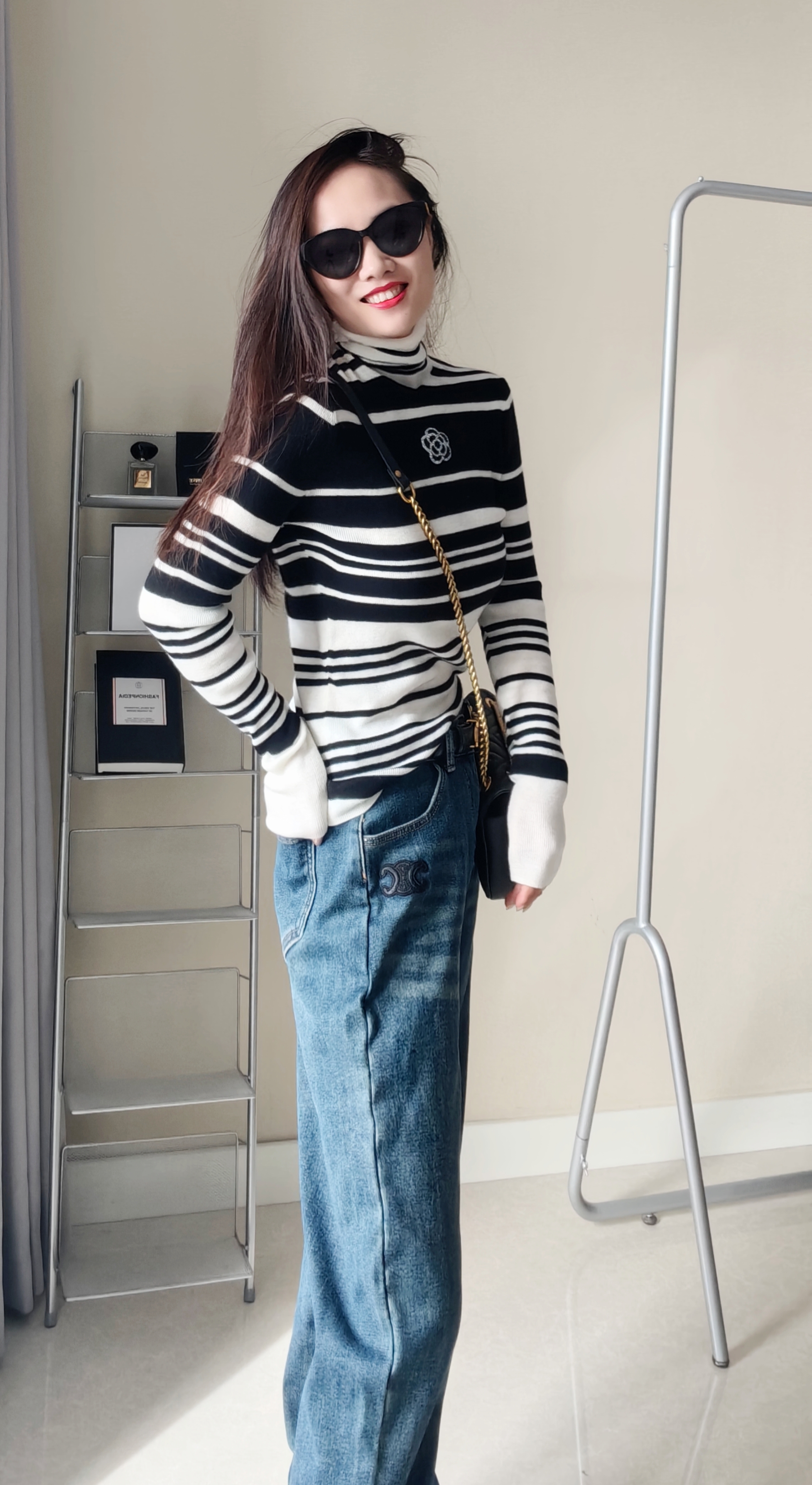 100超细羊毛,非常细腻亲肤,贴身柔和,定位织条纹,版型非常显瘦。
