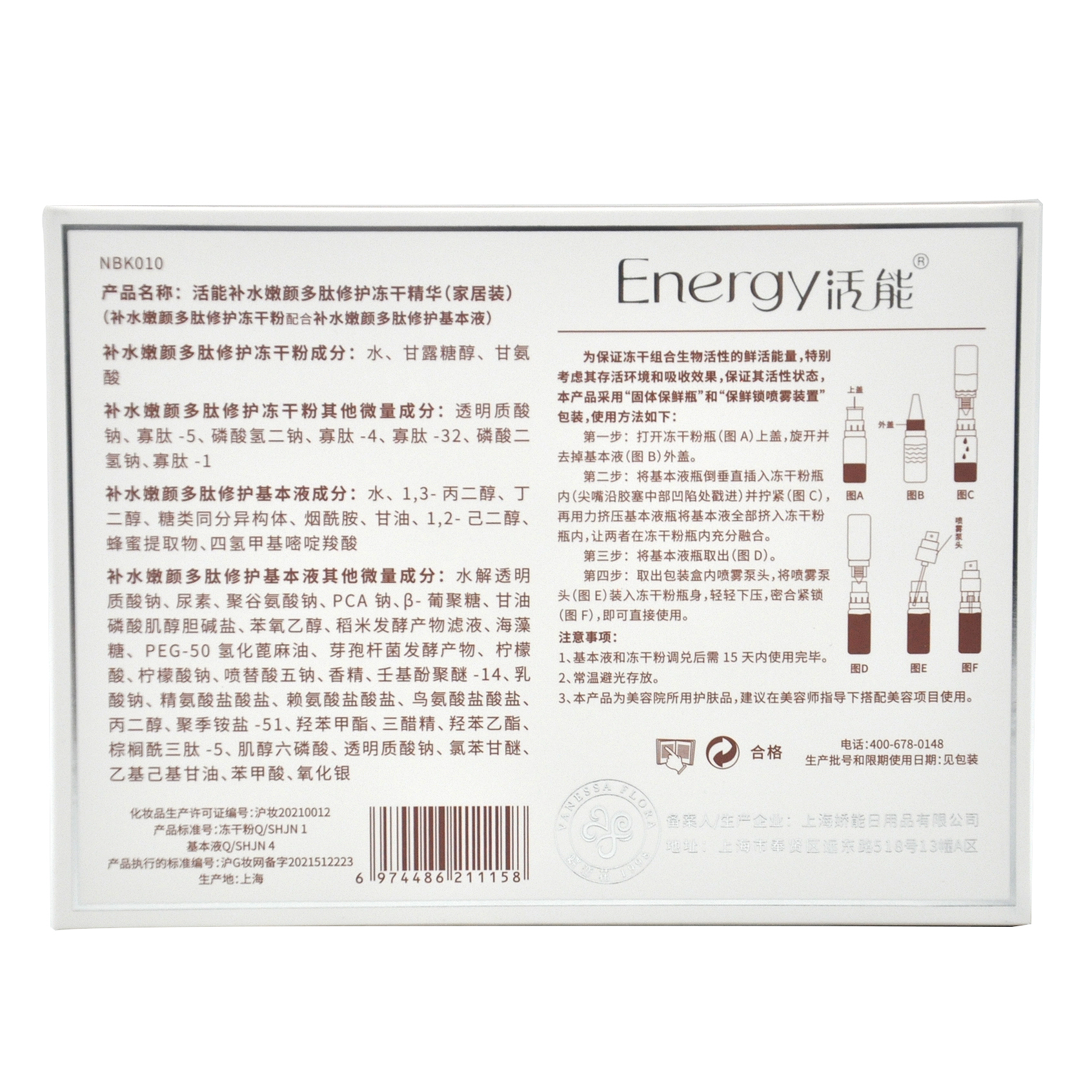 使用方法:基本液倒入冻干粉内,安装上喷头,调兑激活之后15天内使用完毕,存放冰箱保鲜箱。