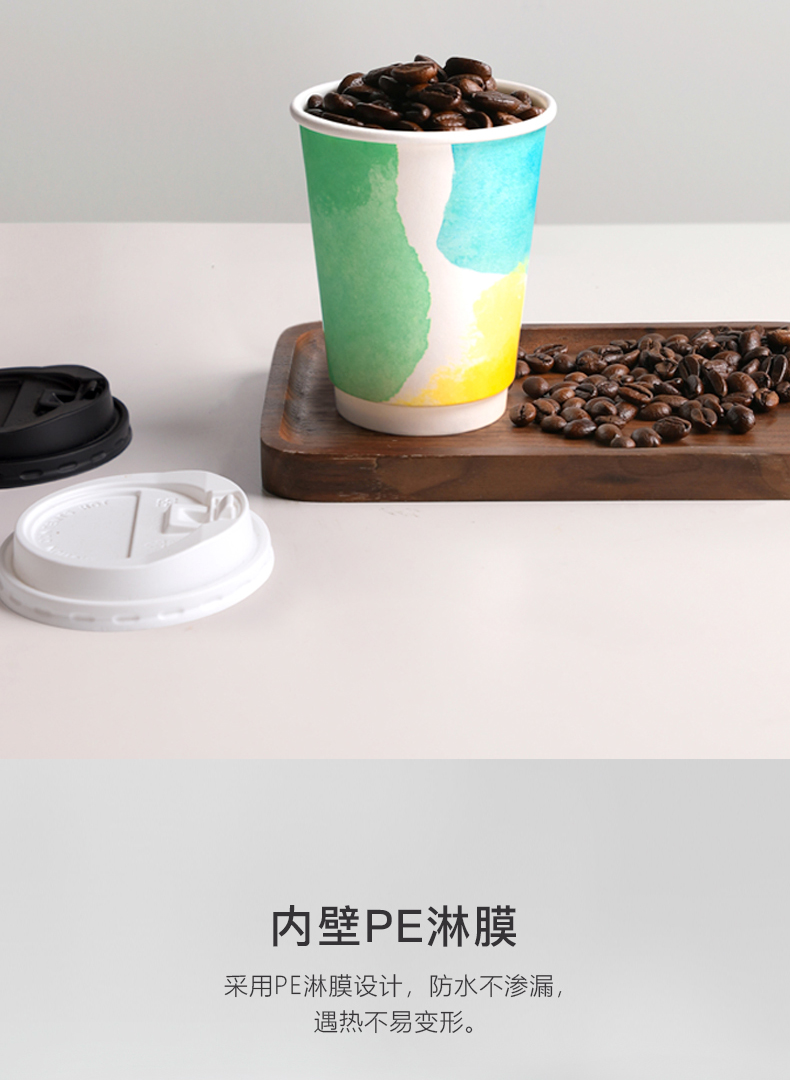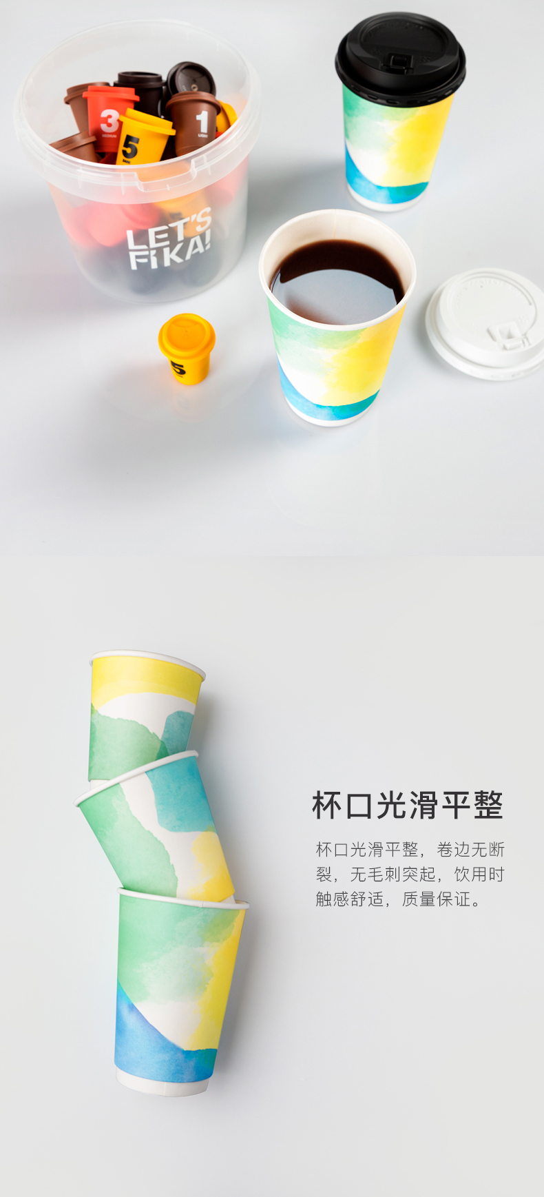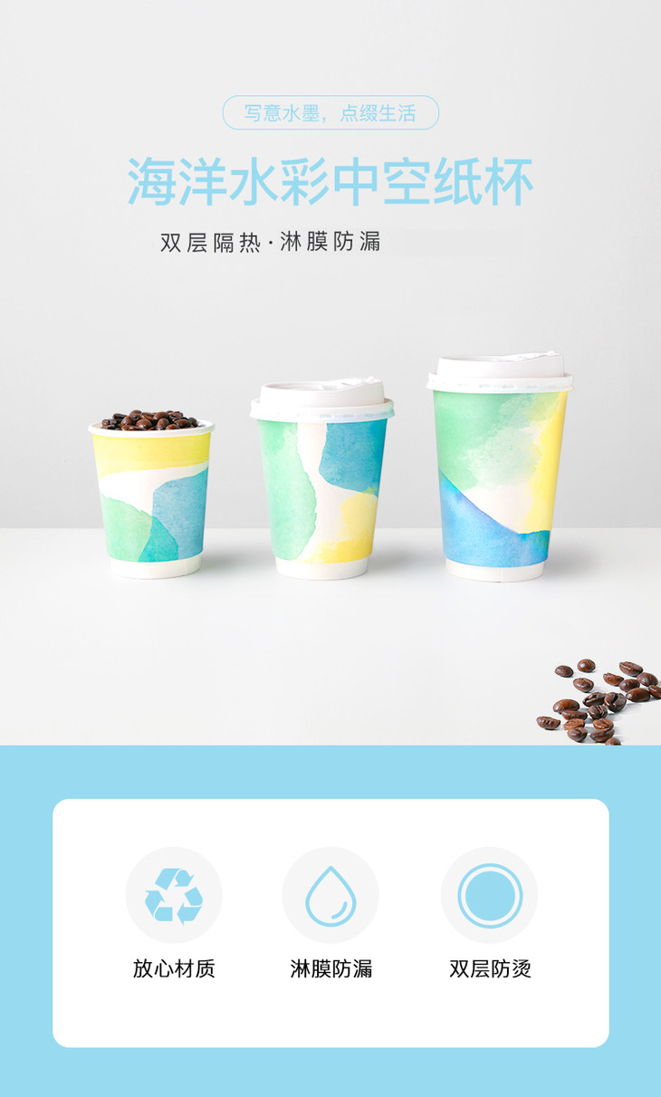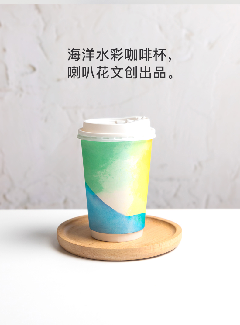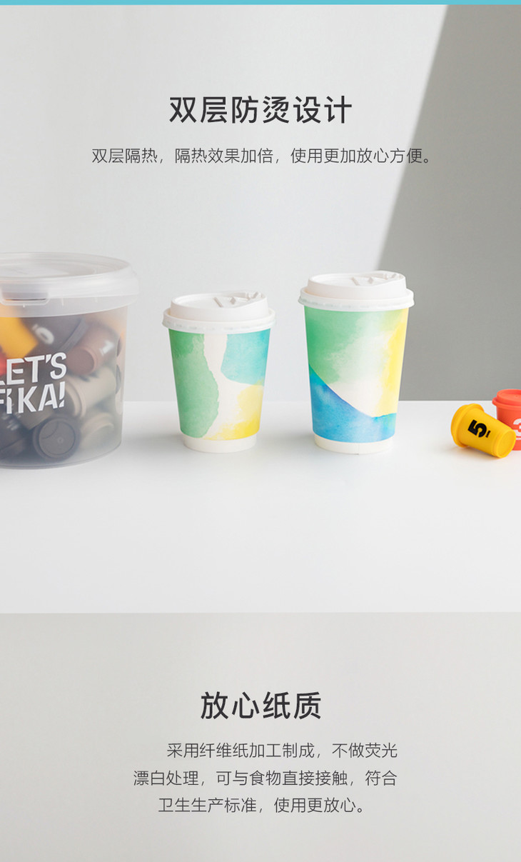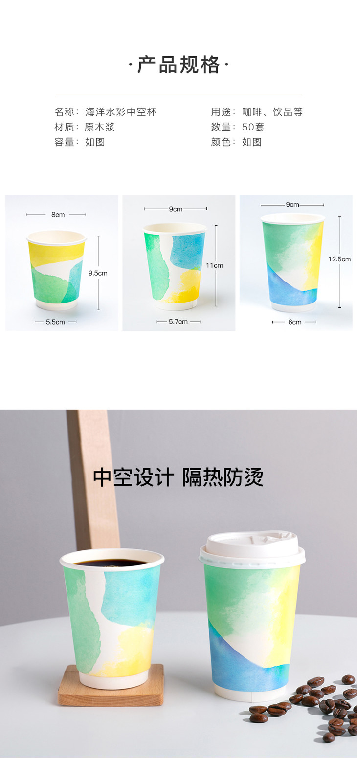 喇叭花一次性纸杯海洋水彩杯咖啡杯浮雕纸杯可定制隔热彩色杯50套带盖