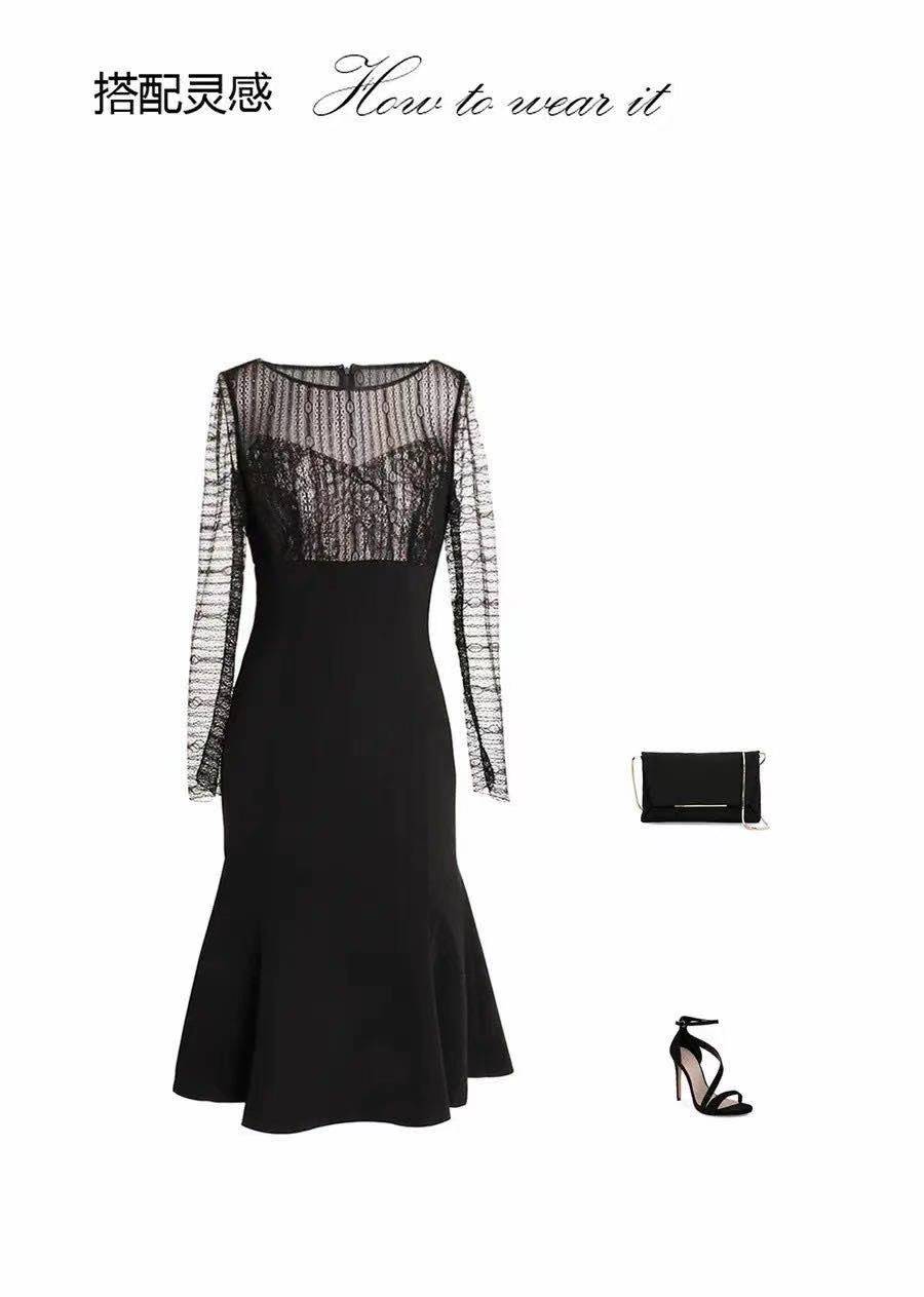 尽显优雅长袖蕾丝连衣裙 - 名媛风收腰显瘦性感礼服裙 1701087
