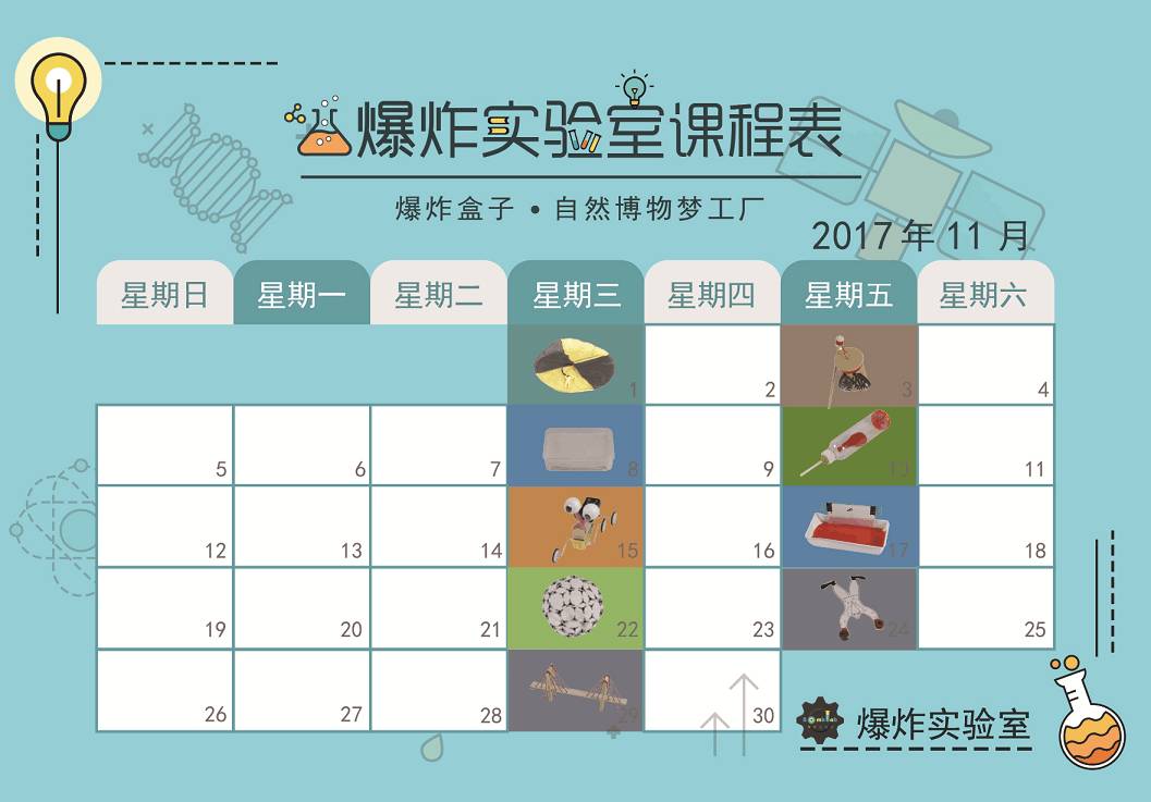 11月爆炸盒子-自然博物梦工厂,包含了生物学、化学、电学、声学、运动和力、空气、水等7个学科的科学实验。