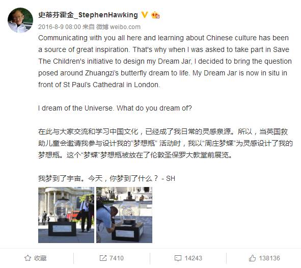 英国救助儿童会曾邀请霍金设计他的“梦想瓶”,霍金以“周庄梦蝶”为灵感设计了他的梦想瓶,这个“梦蝶”梦想瓶现在在伦敦圣保罗大教堂前展览。